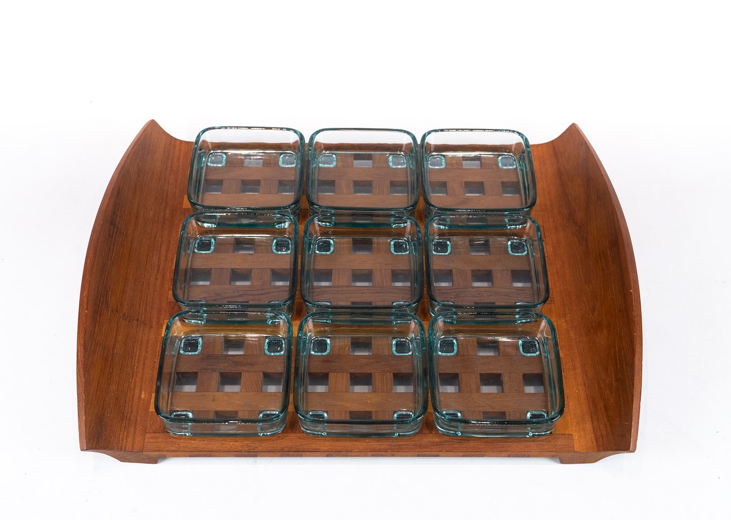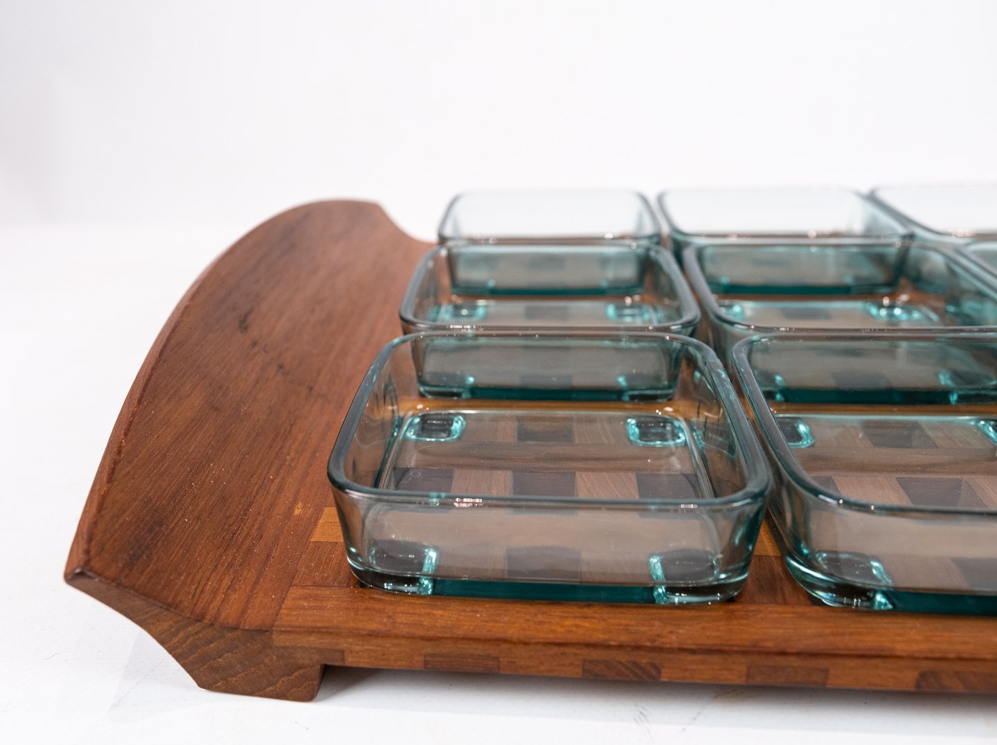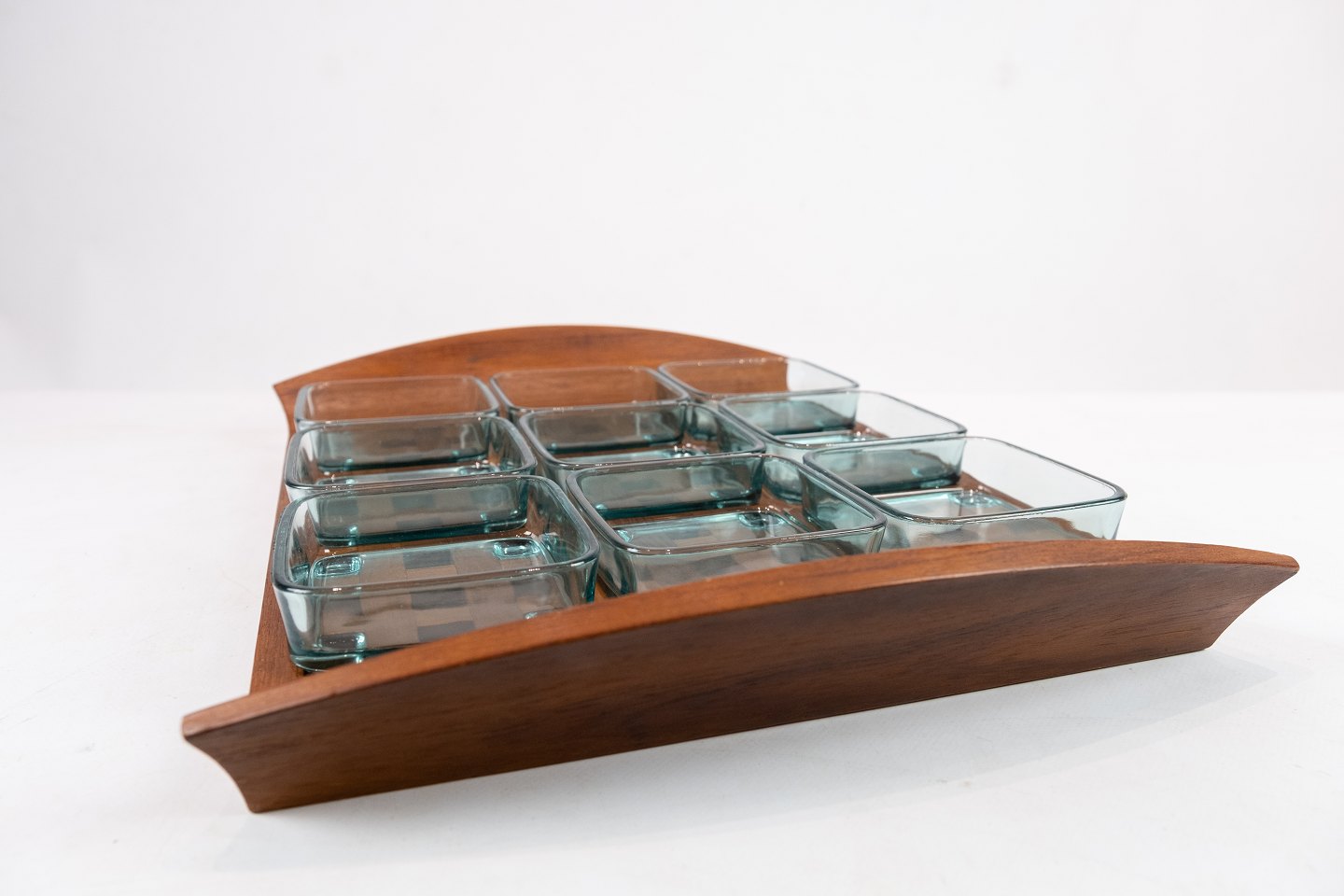 SoldServing tray in teak with six matching glass bowls by Jens Harald Quistgaard from around the 1960s. The tray is in great vintage condition.