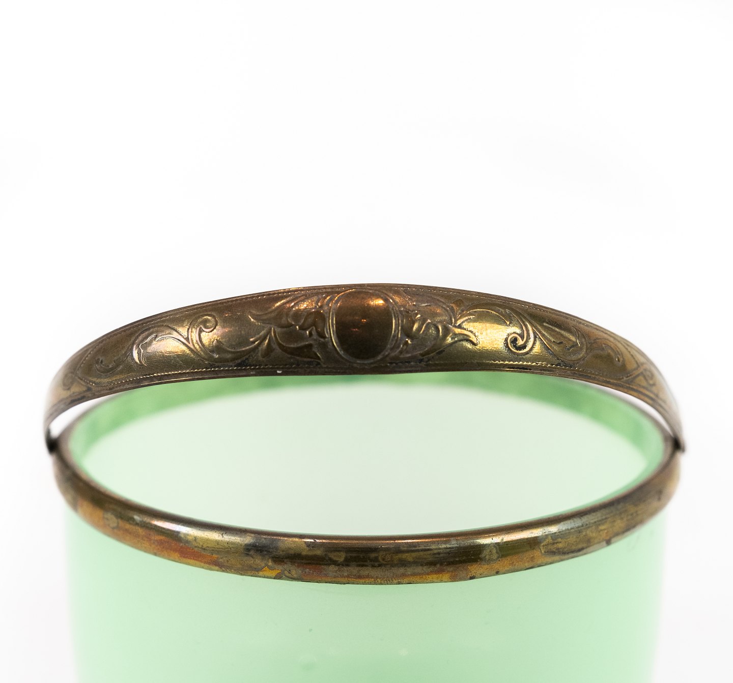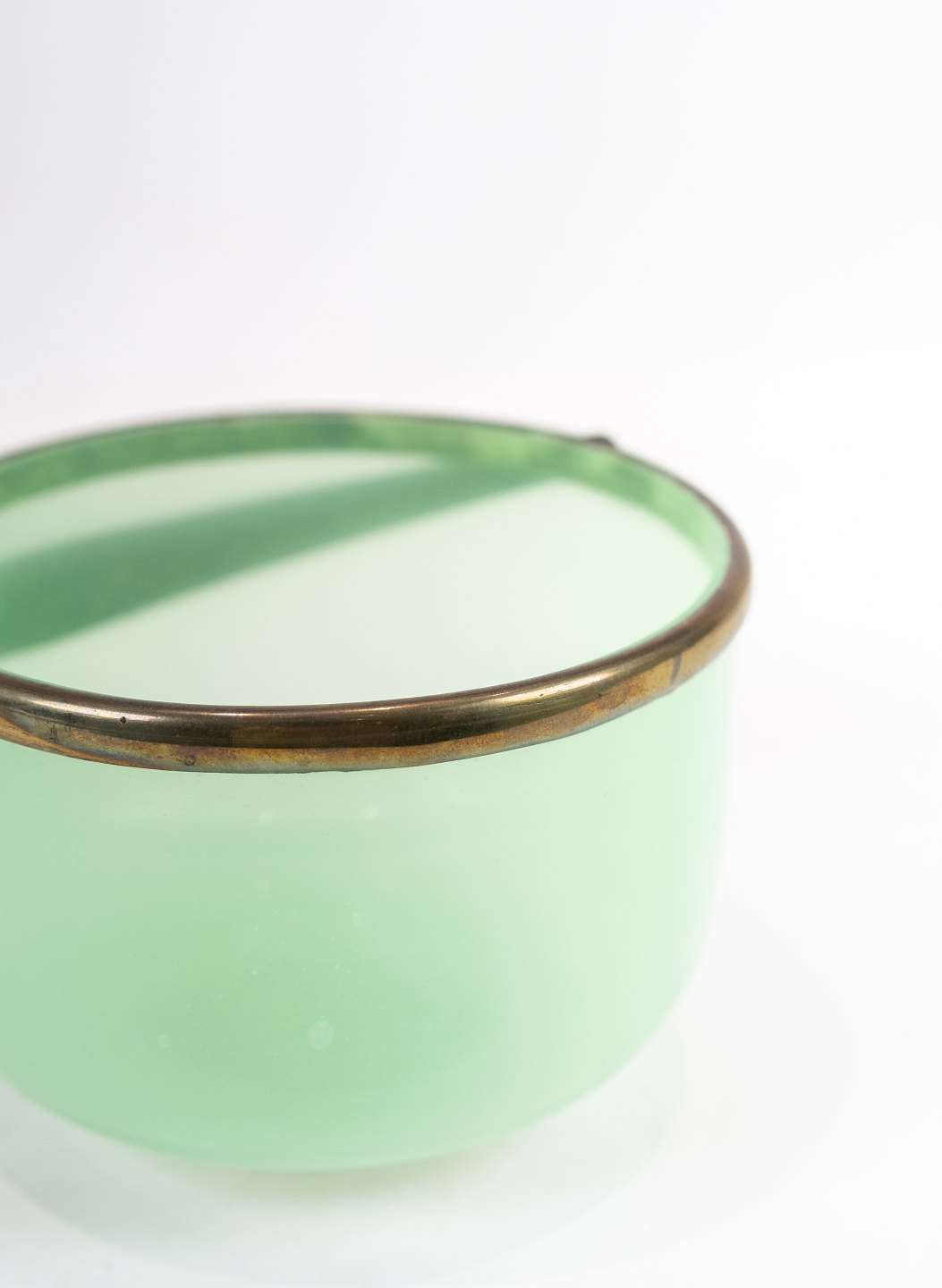SoldGreen candy bowl of opaline glass with silver edge and handle decorated with engravings from Fyn's Glassworks. The bowl is in great vintage condition.