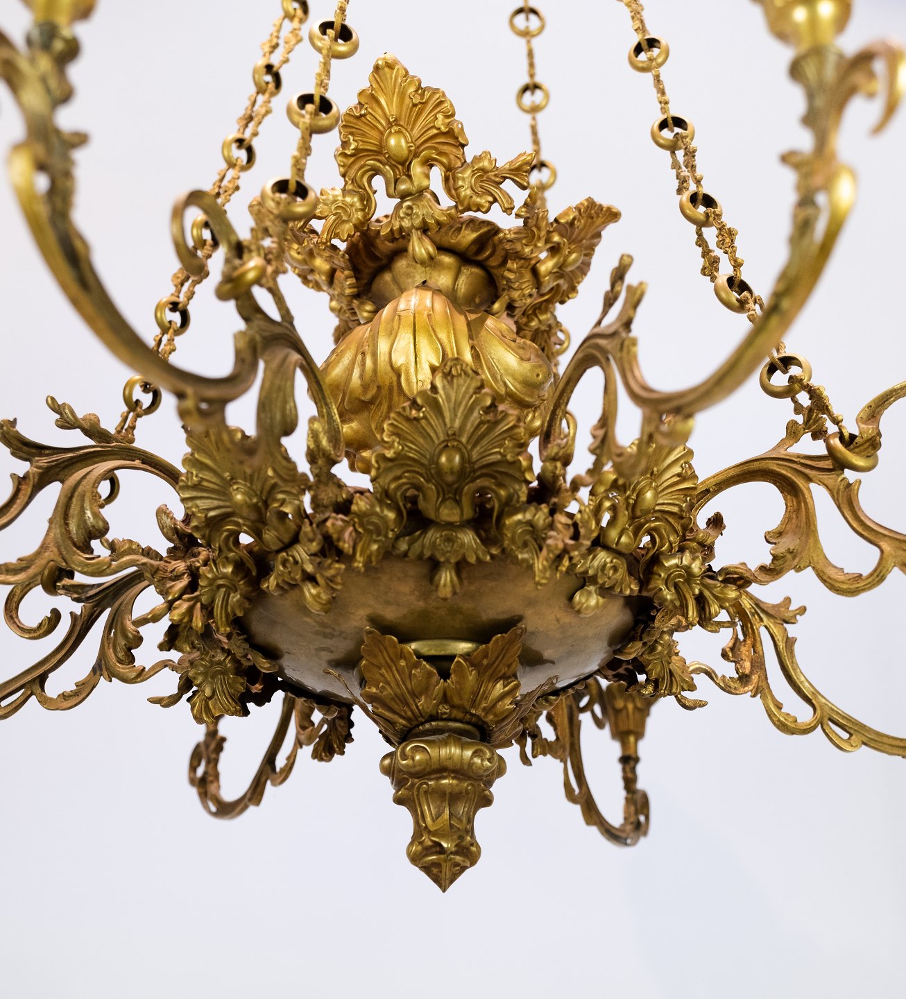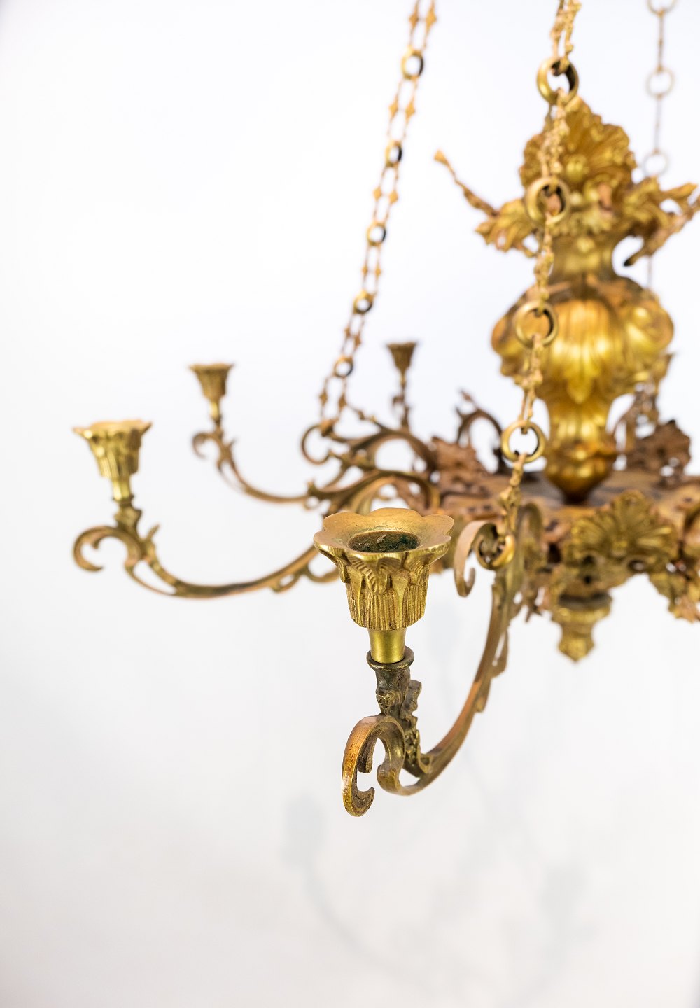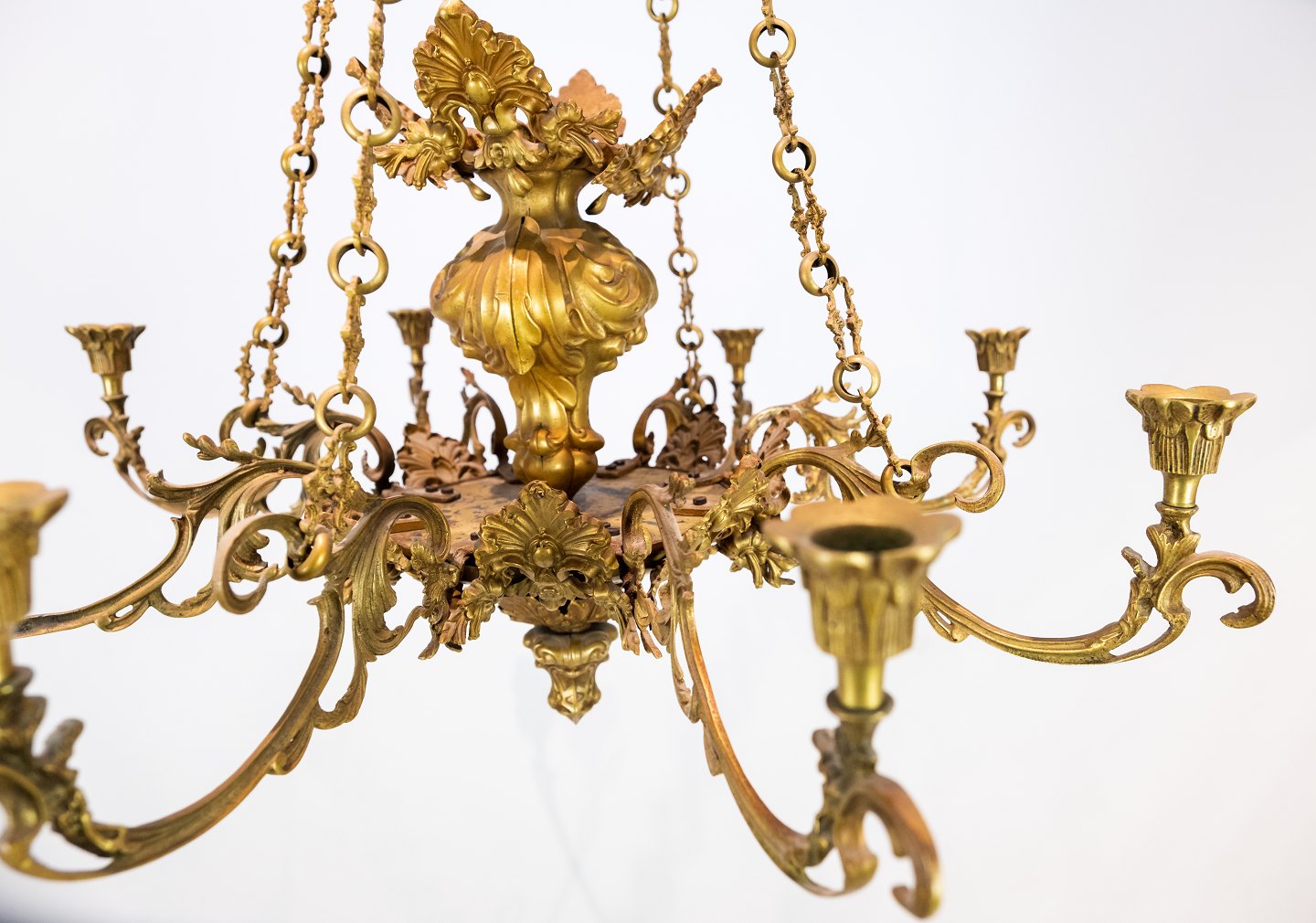SoldFrench church chandelier of bronze with beautiful decorations and eight arms for candle lights from around the 1880s. The chandelier is in great antique condition.
