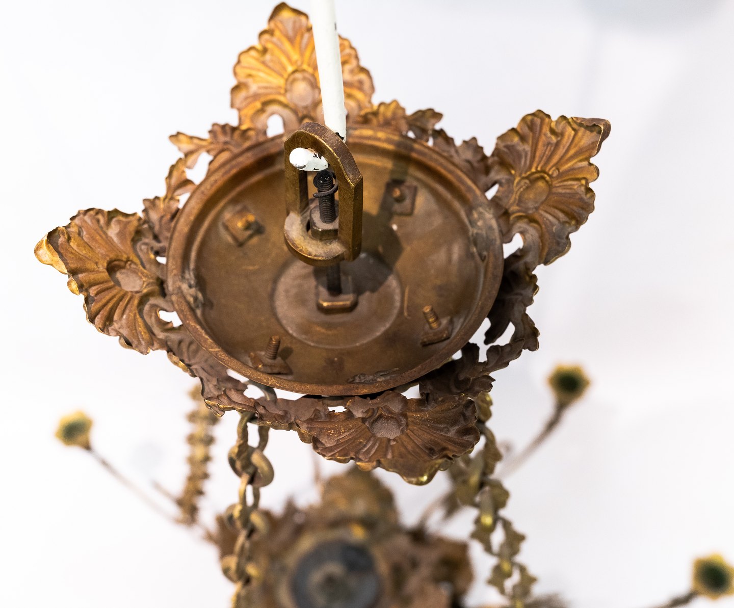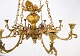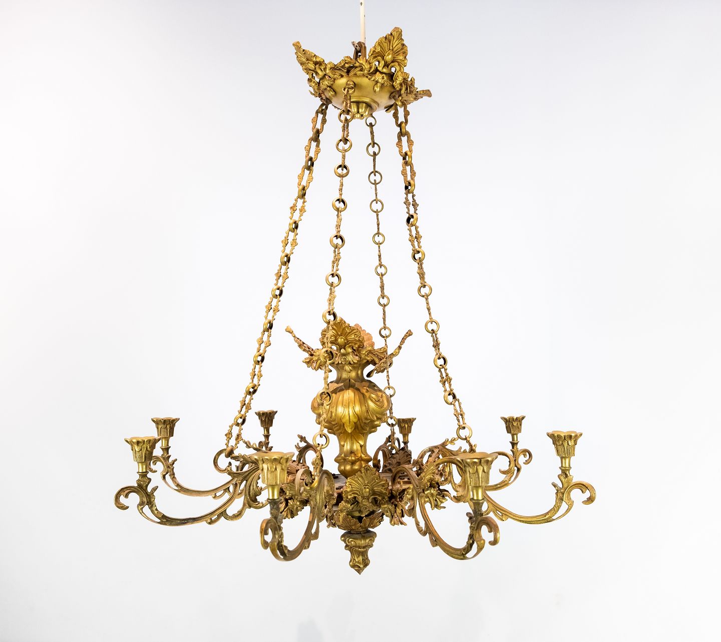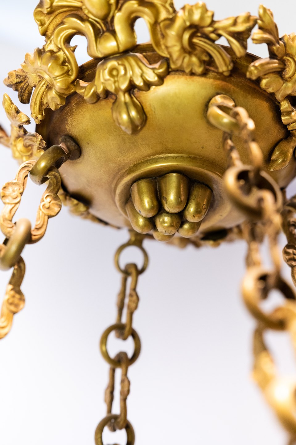 SoldFrench church chandelier of bronze with beautiful decorations and eight arms for candle lights from around the 1880s. The chandelier is in great antique condition.