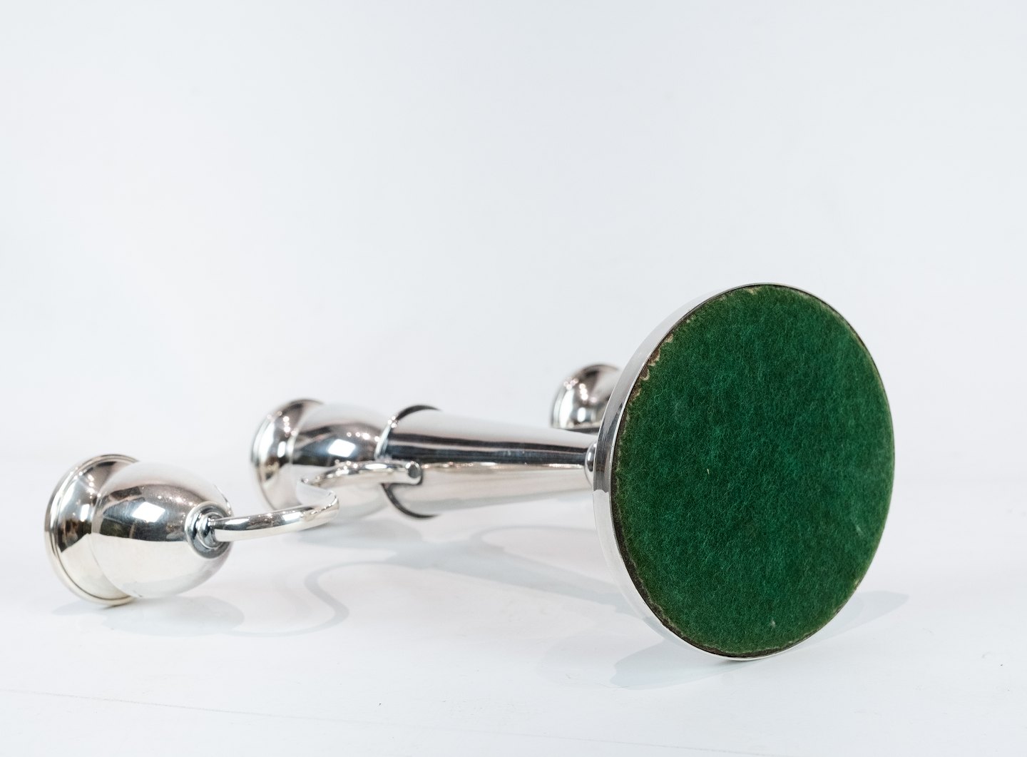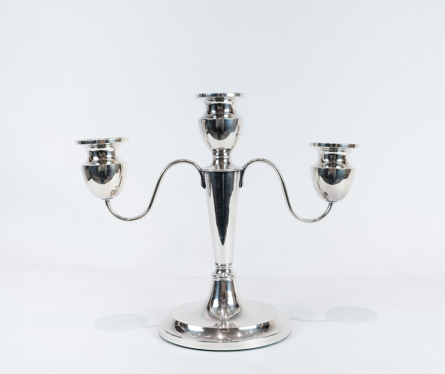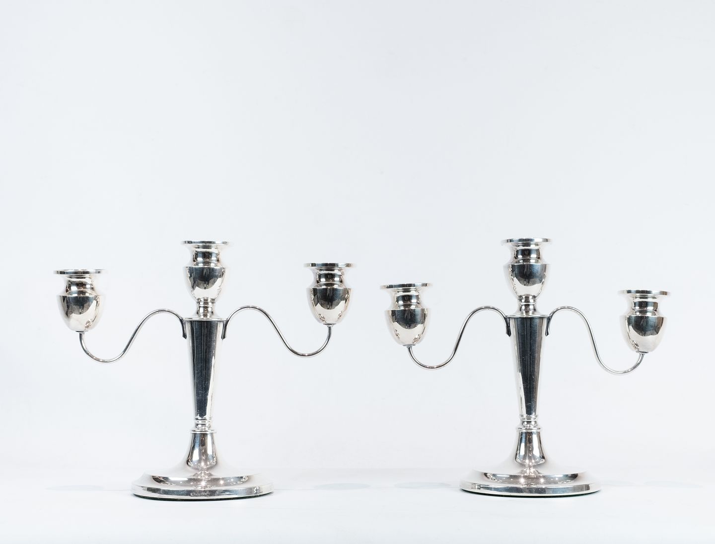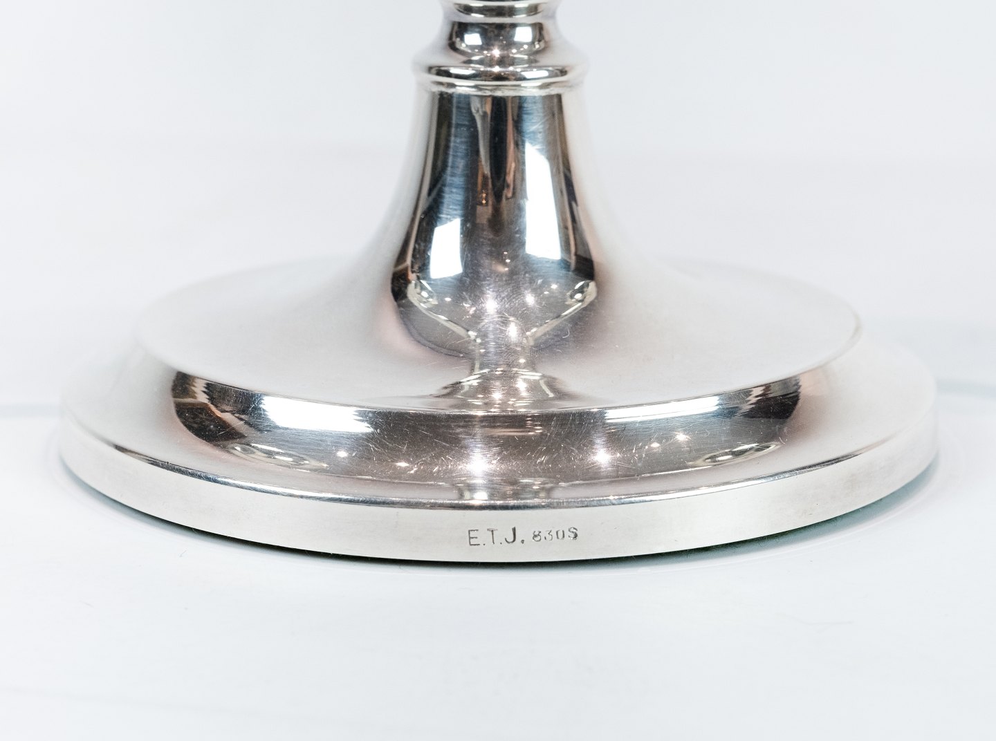 SoldA pair of three armed candlesticks of 830 silver and signed E.T.J. Both are in great vintage condition.
