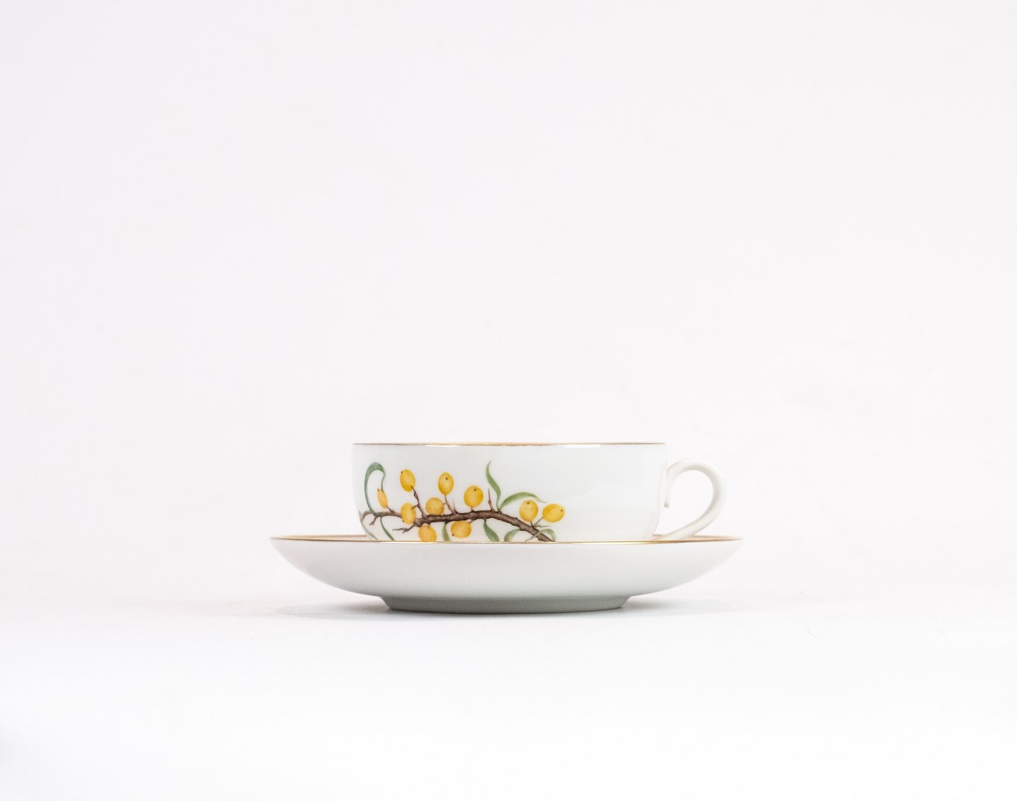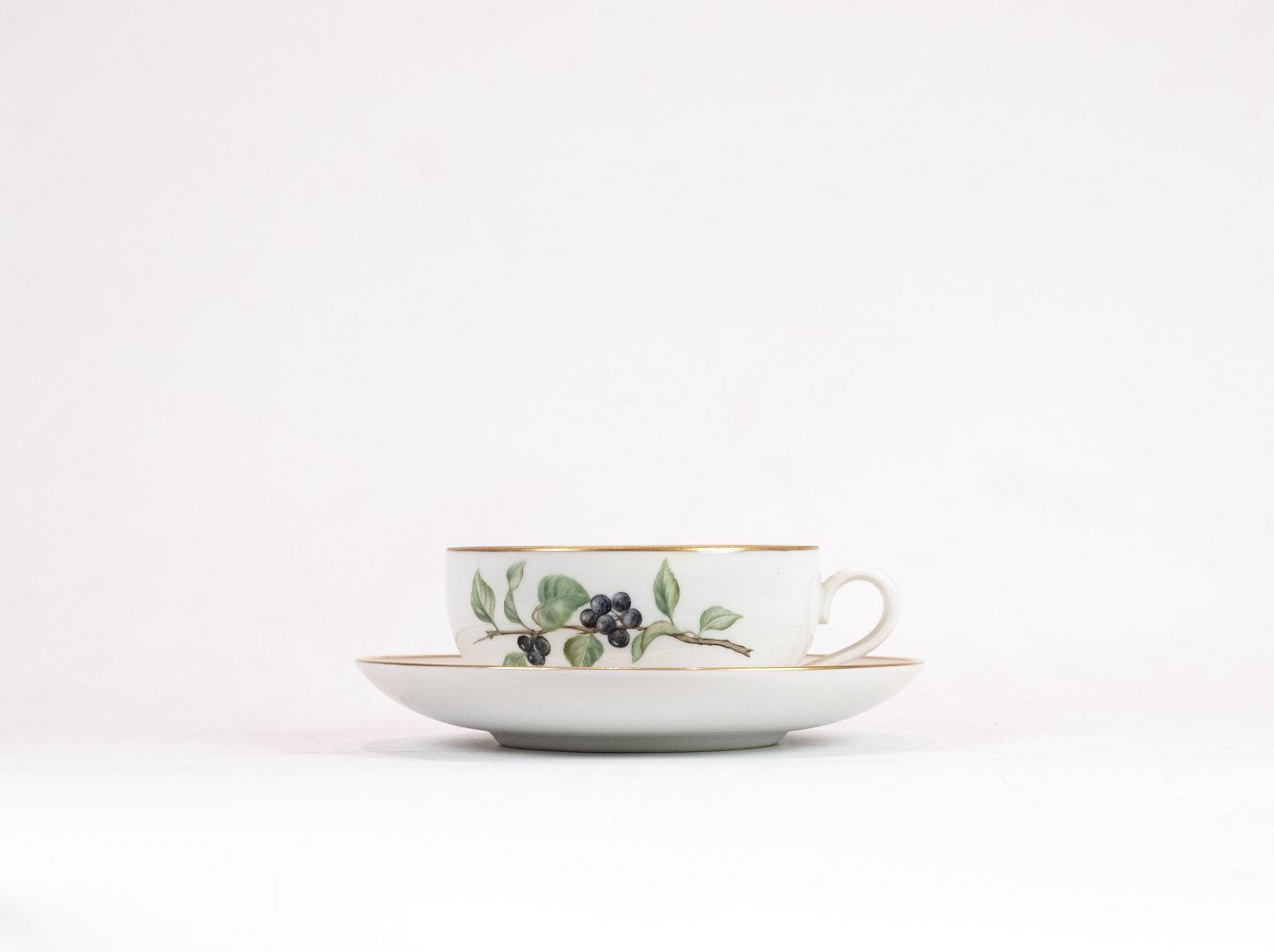 Porcelain tea cups with saucer decorated with different floral motives, no.: 108, by Bing and Grøndahl. Ask for number in stock. Price is per cup/saucer.