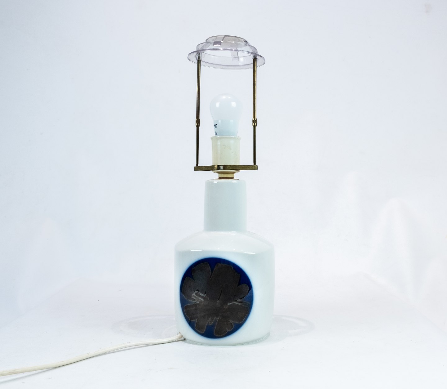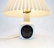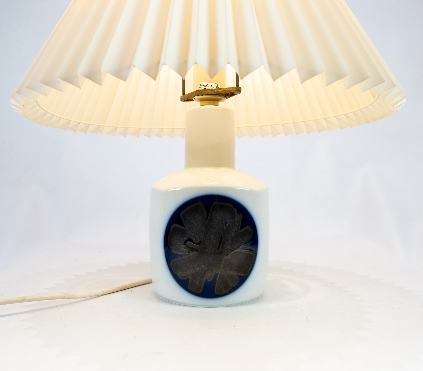 Bordlampe fra B&G dekoreret med blåt mønster. Lampen er fra 1983 - og med nummeret 6714. Skærmen er håndmalet og håndfoldet i papir.