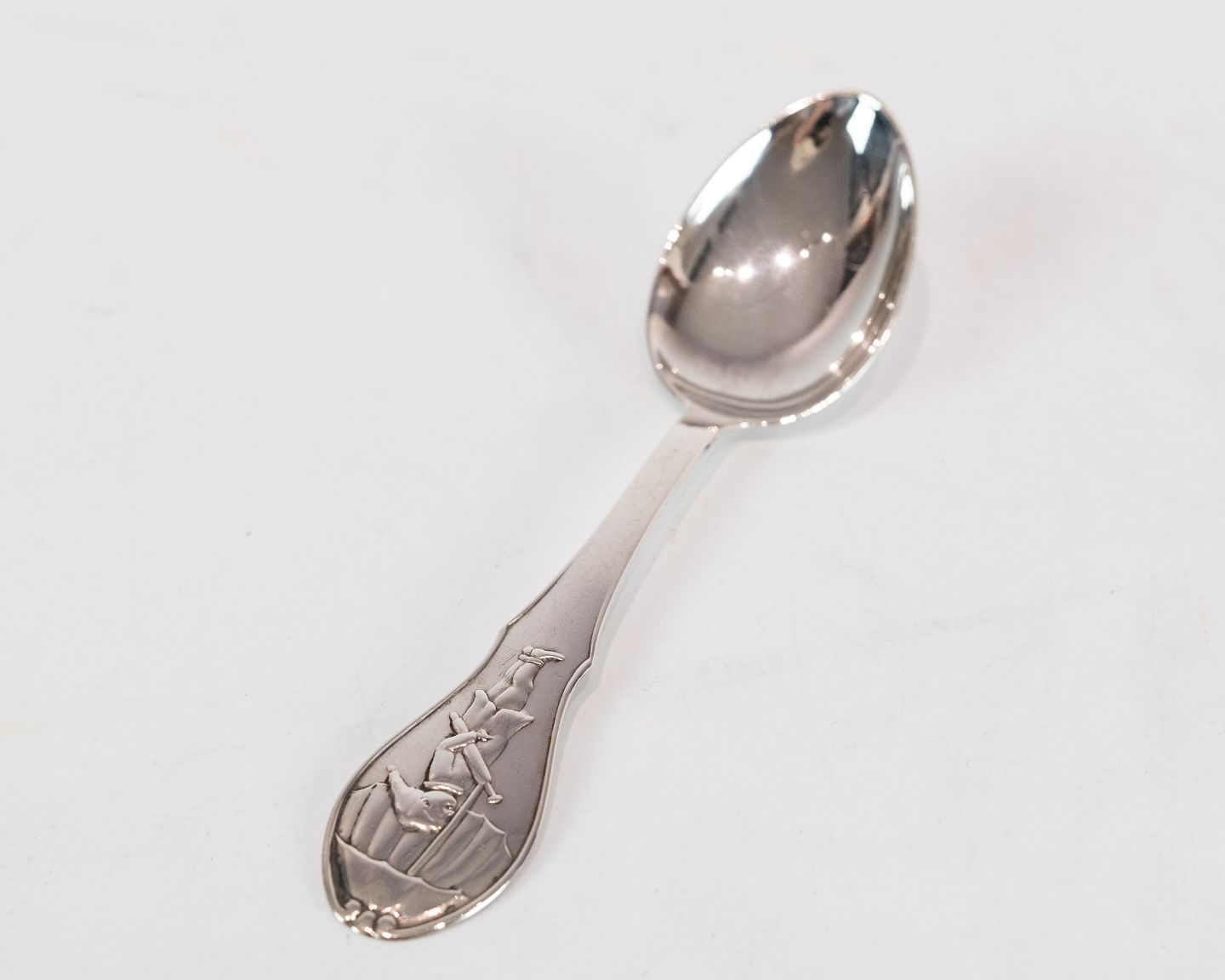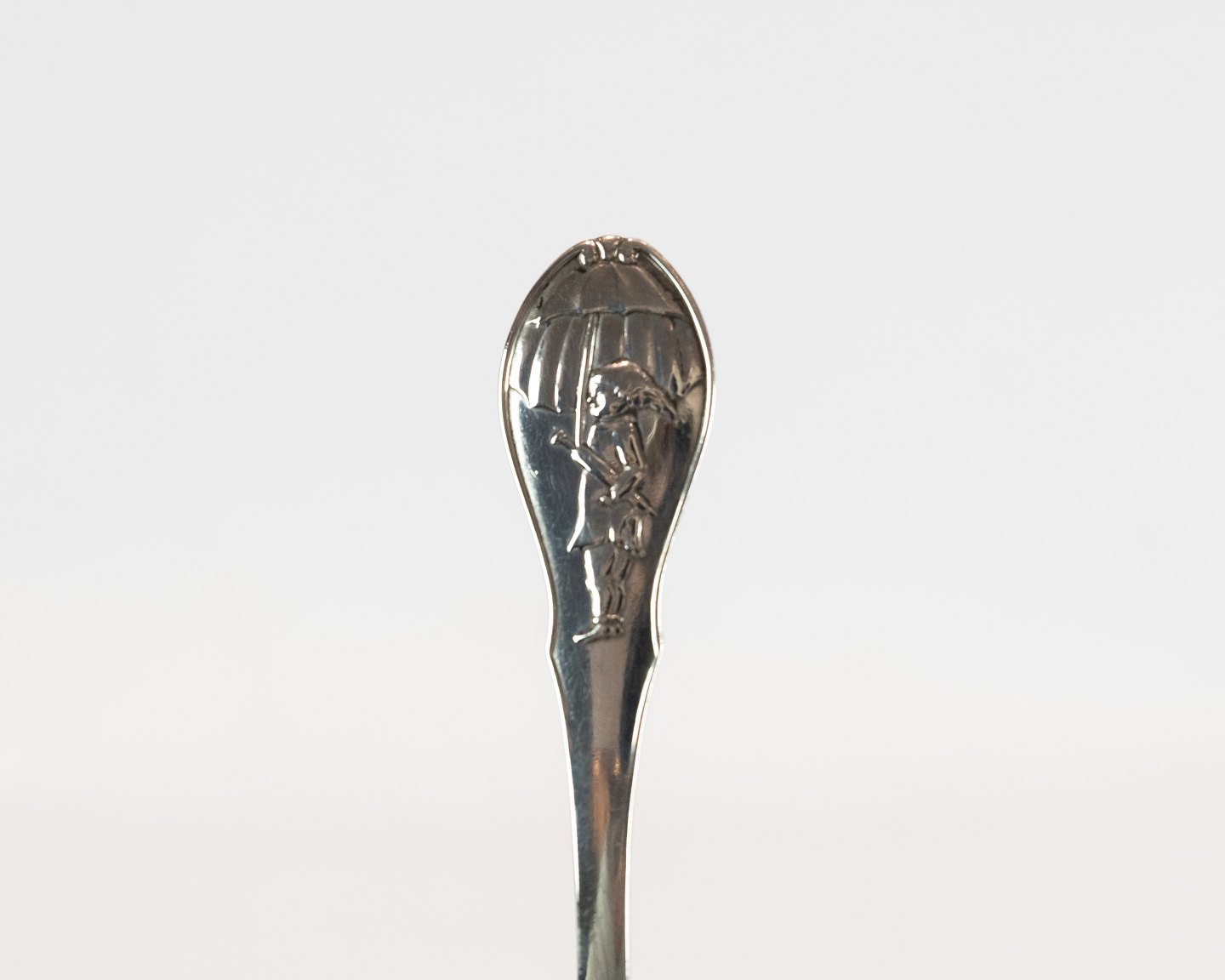 Children's spoon with motif of H.C. Andersen's Sandman in hallmarked silver.