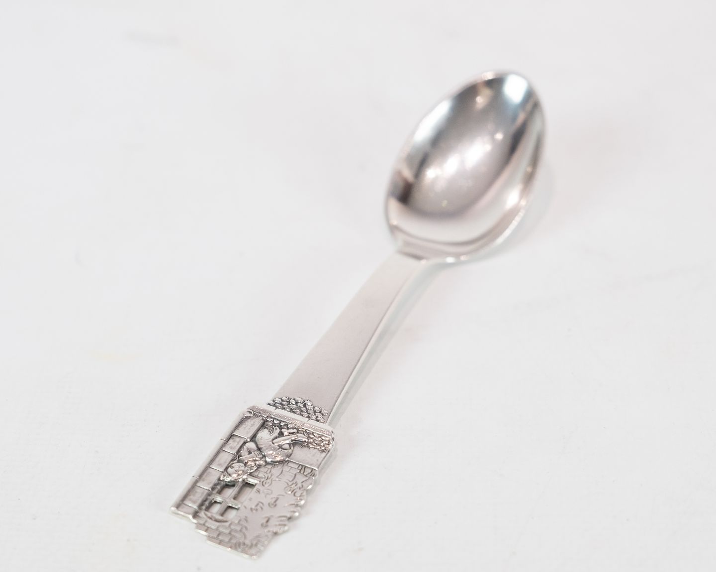 SoldChildren's spoon with motif of H.C. Andersen in hallmarked silver.