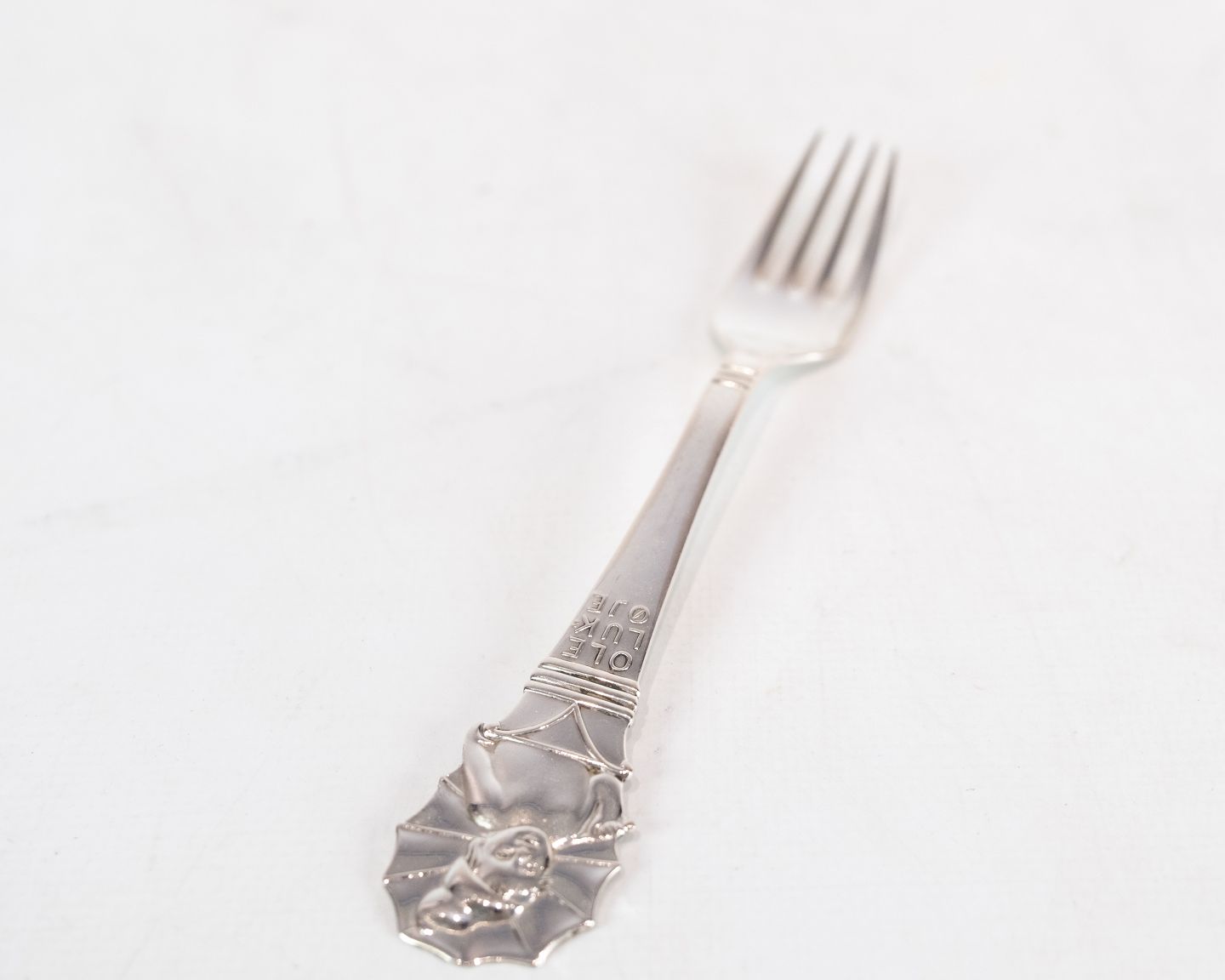 Barnegaffel med motif af H.C. Andersen Ole Lukøje i tretårnet sølv.