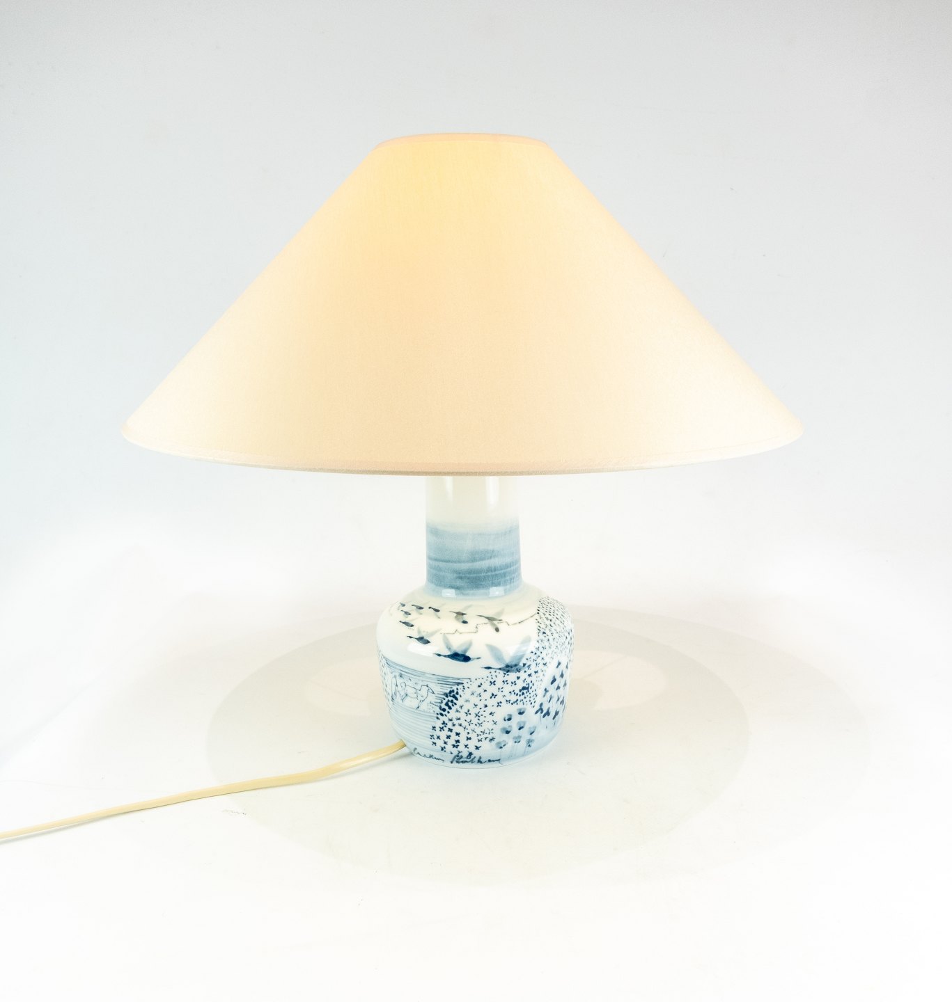 Bordlampe i blåmalet porcelæn af Bing og Grøndahl. Skærmen er håndmalet og håndfoldet i papir.