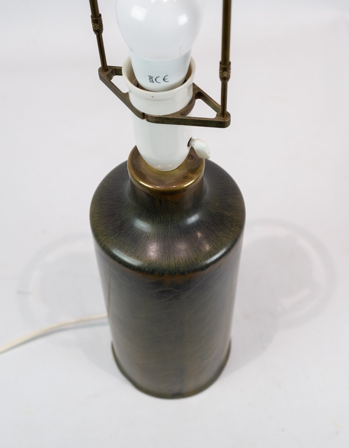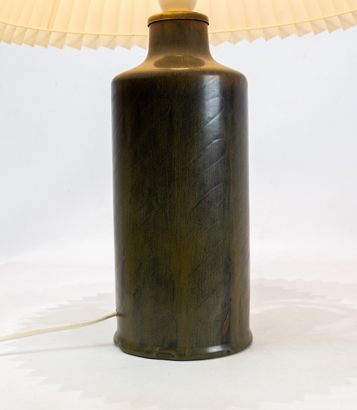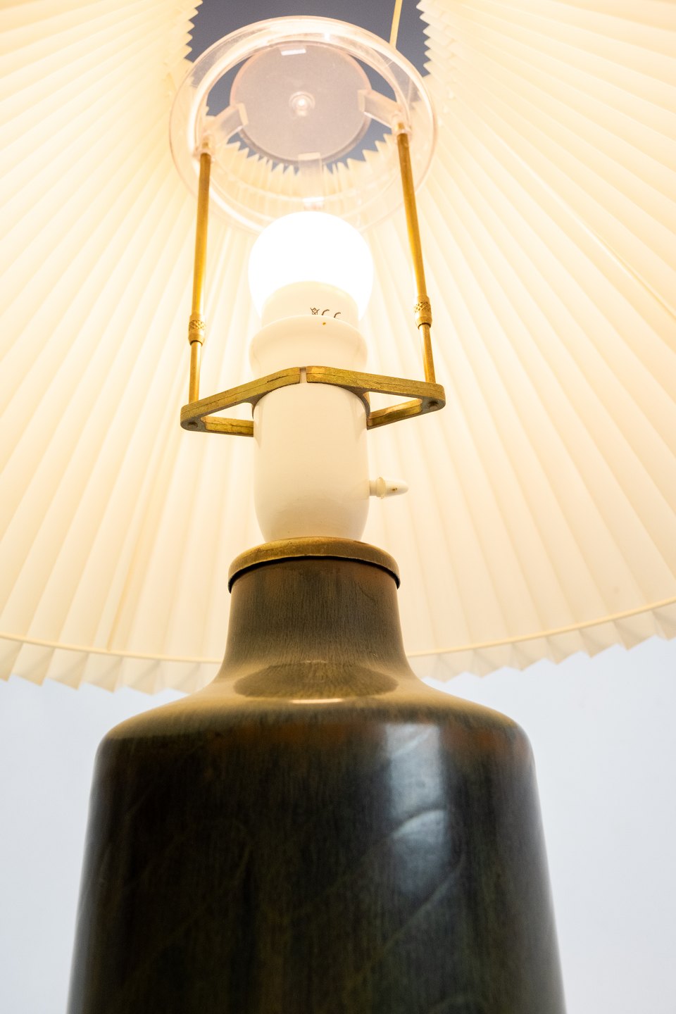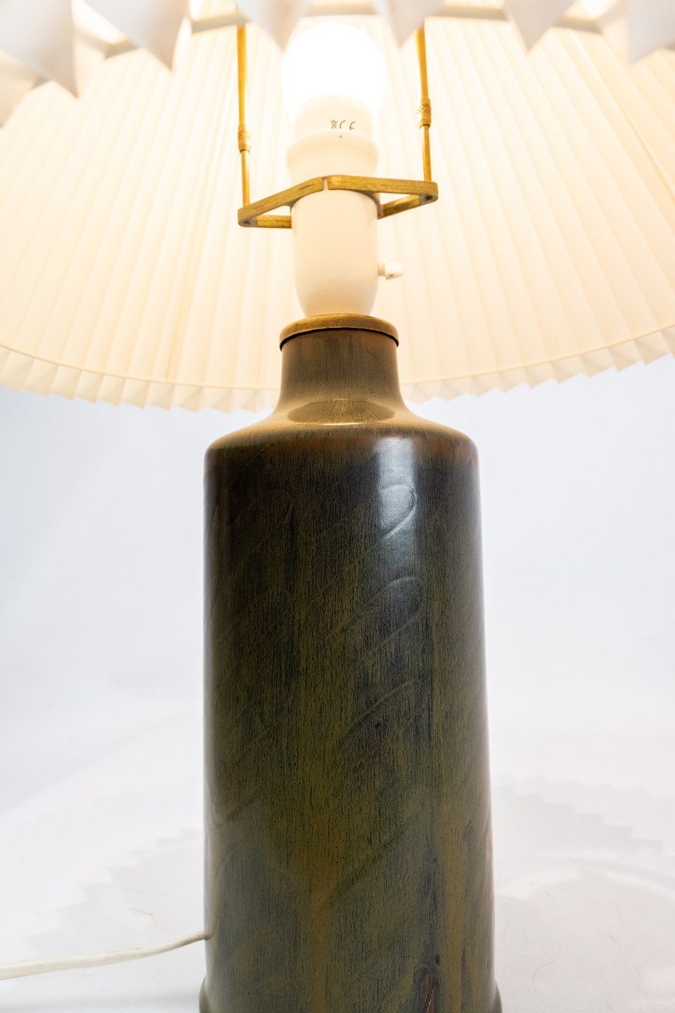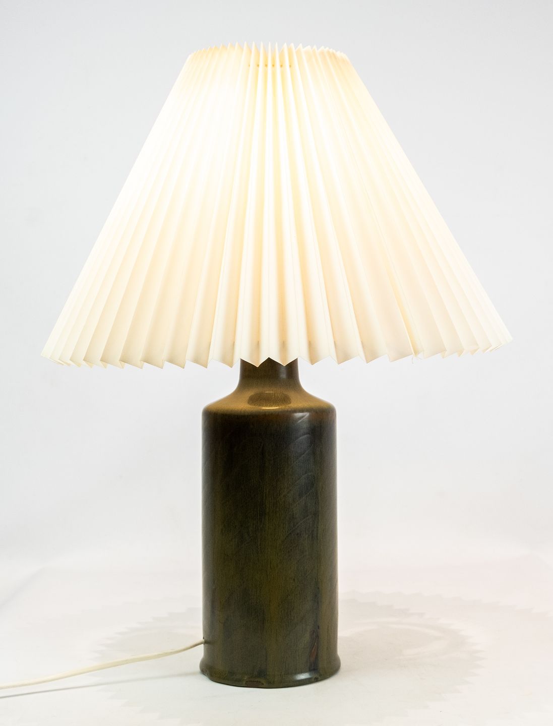 Keramik bordlampe i mørkegrøn farve af Eva Stær Nielsen for Saxbo. Skærmen er hånd foldet og håndmalet i papir.