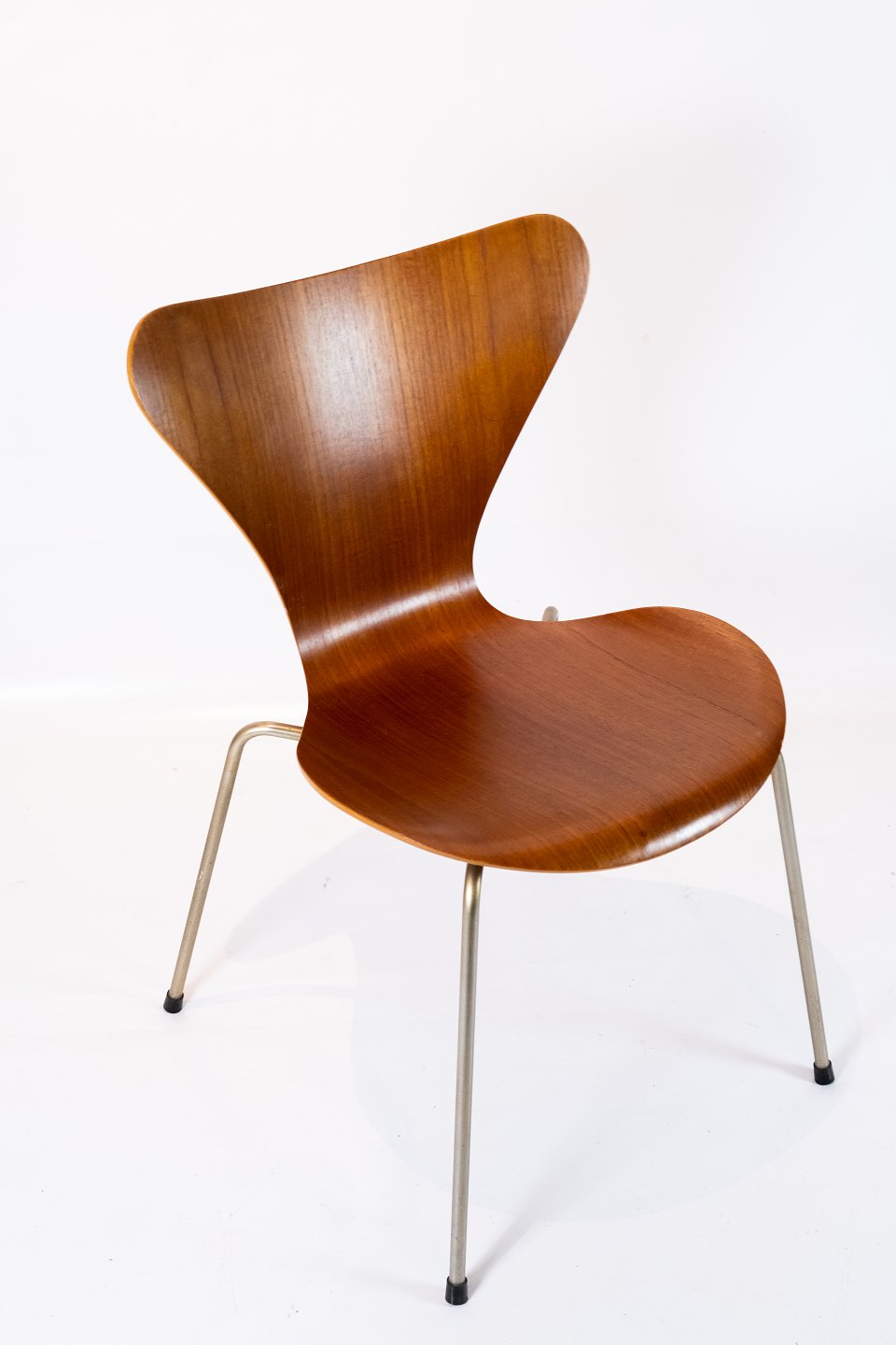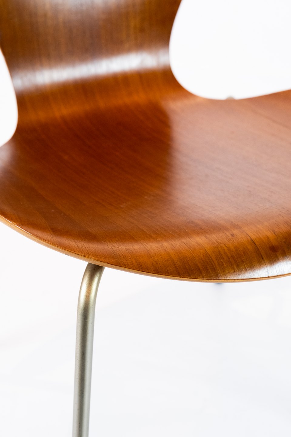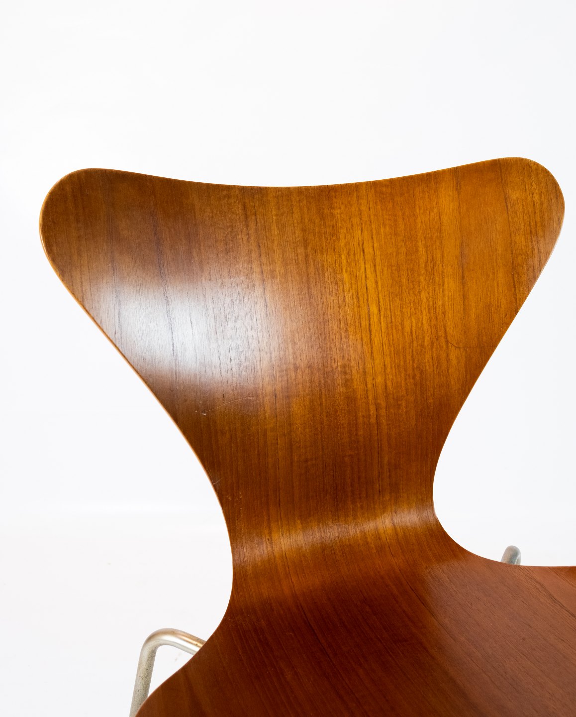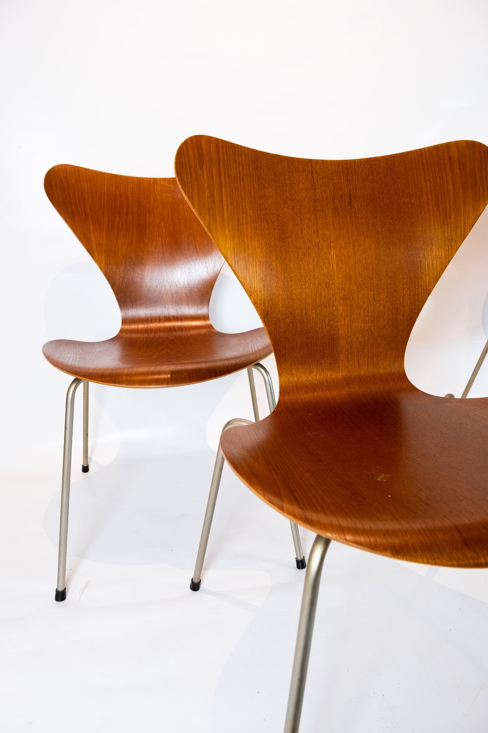 Et sæt af fire Syver stole, model 3107, designet af Arne Jacobsen og fremstillet af Fritz Hansen. Disse stole, i smukt teaktræ, udstråler en tidløs elegance og enestående håndværk.