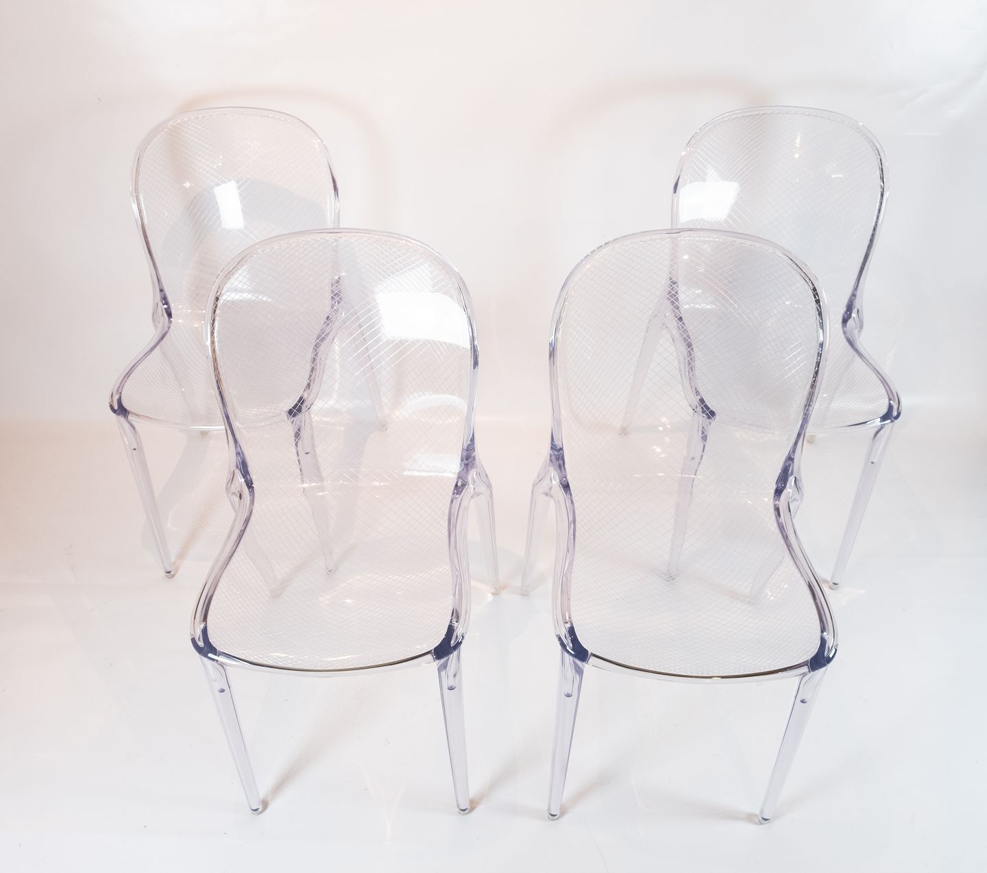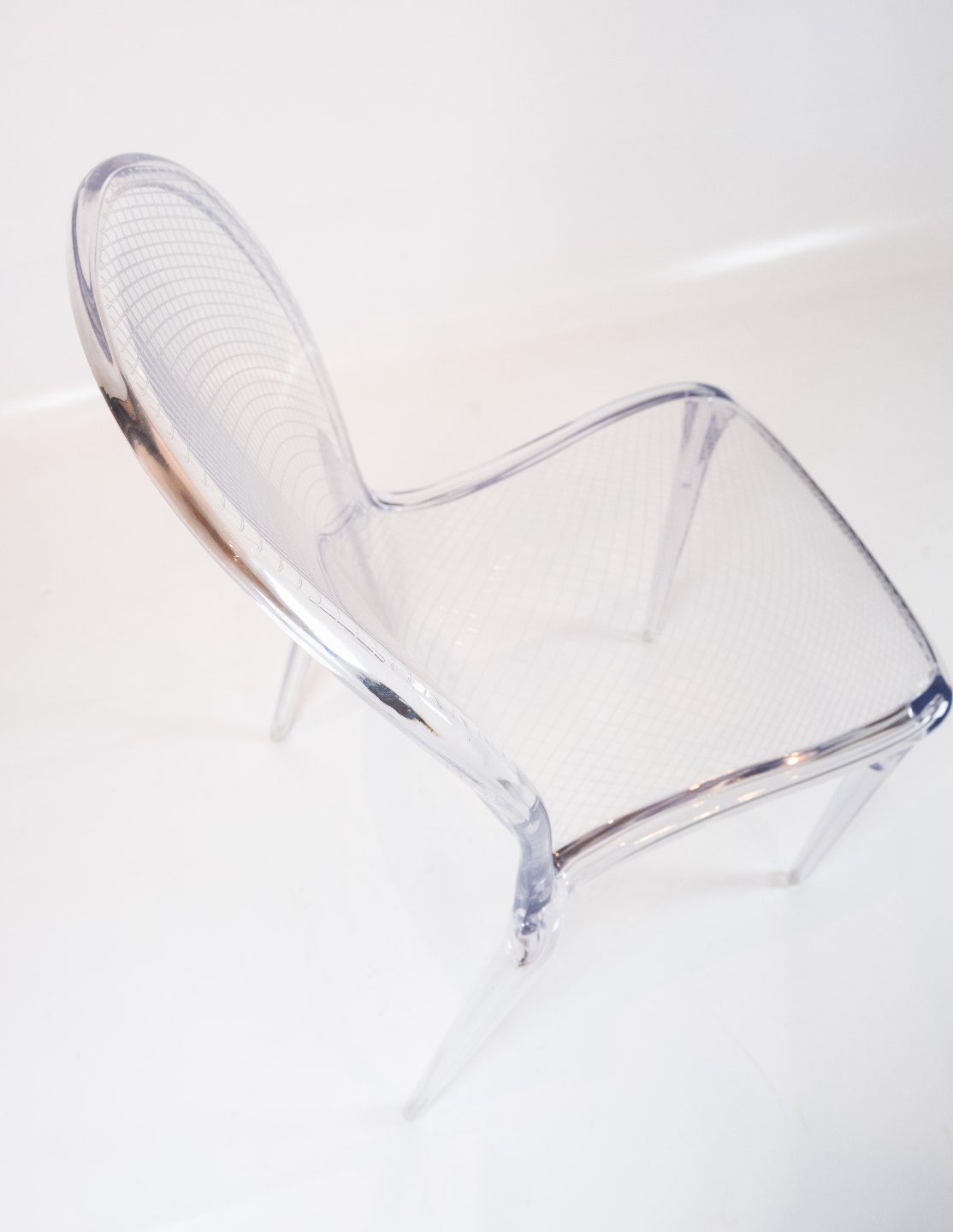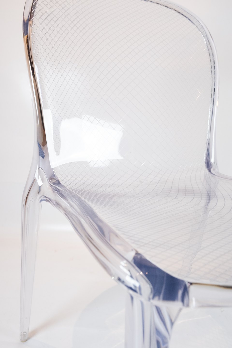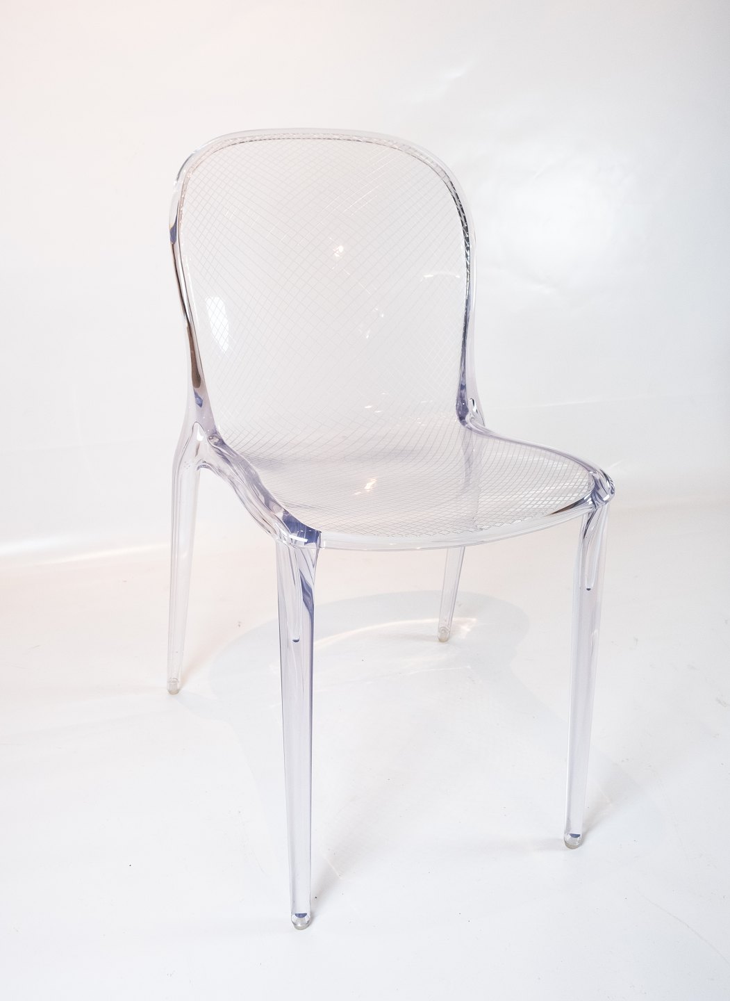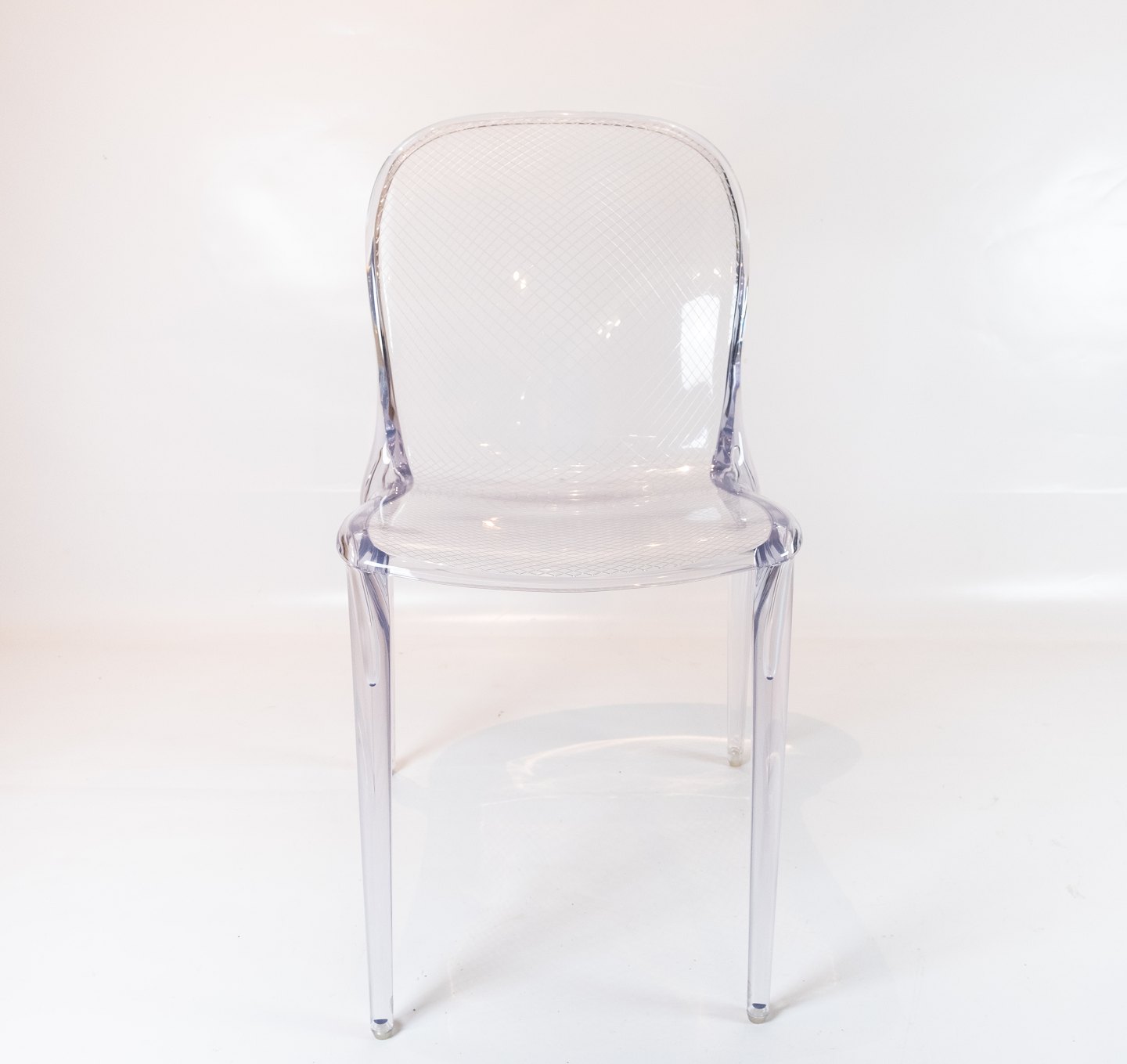 Med sine runde kanter og det unikke ternet mønster på både sæde og ryg, udstråler Thalya-stolen en uovertruffen elegance og æstetik. Det gennemsigtige polykarbonatmateriale giver stolen en let og luftig fremtoning, samtidig med at den er holdbar og let at rengøre.