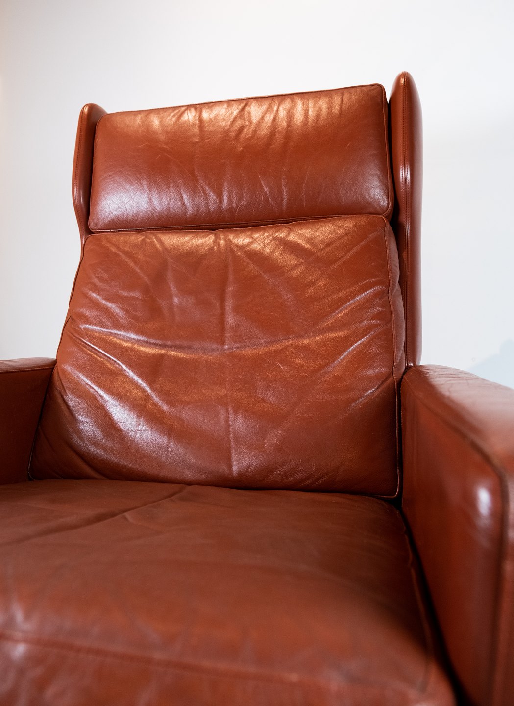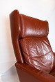 En lænestol polstret med rødbrunt Elegance læder, et tidløst symbol på dansk design fra 1970'erne.