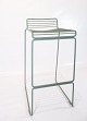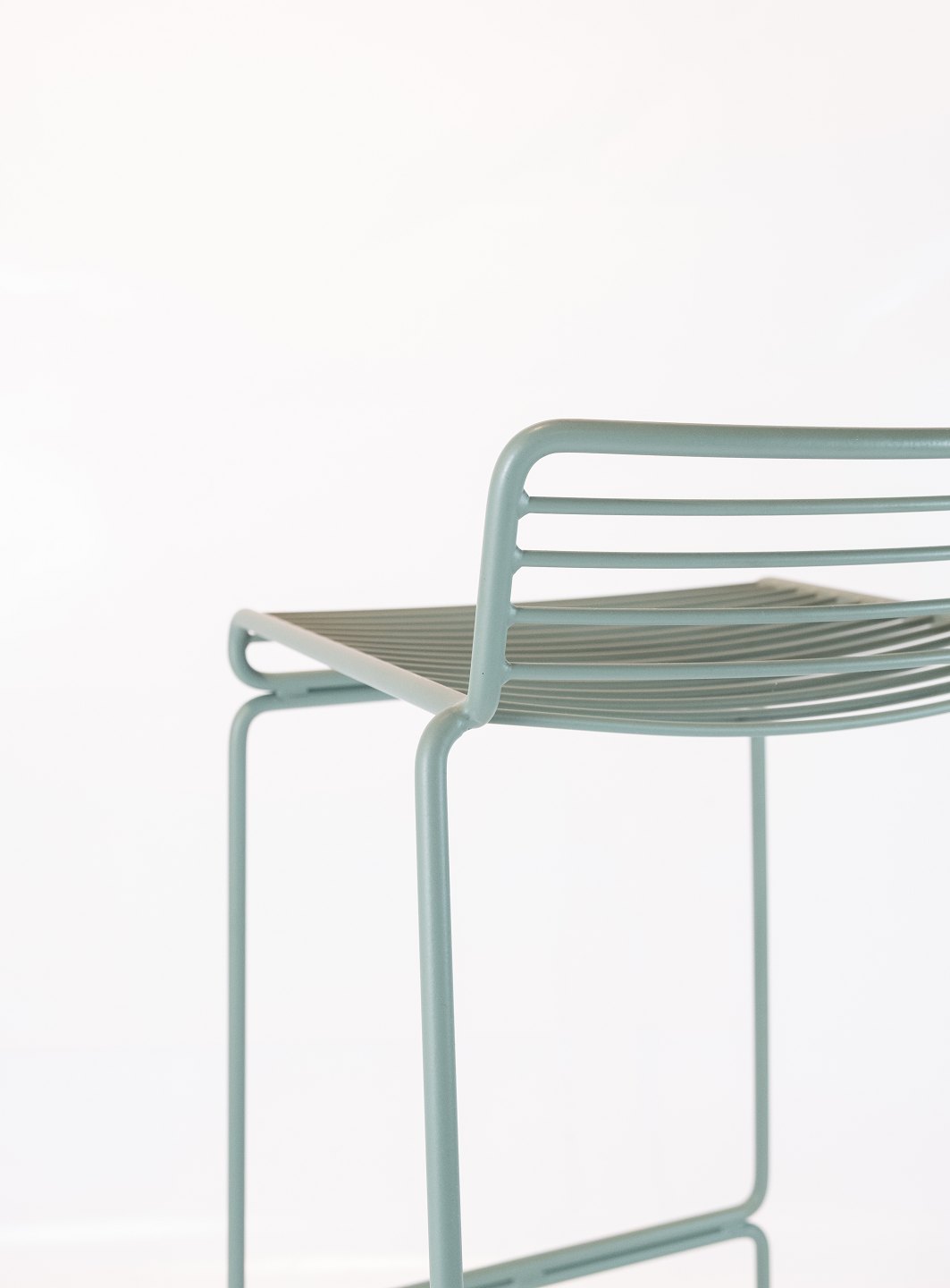 Et par barstole, model Hee, med metalstel i lakeret lyseblåt, produceret af HAY. Disse barstole er et perfekt eksempel på moderne skandinavisk design, der kombinerer funktionalitet med enkel elegance.