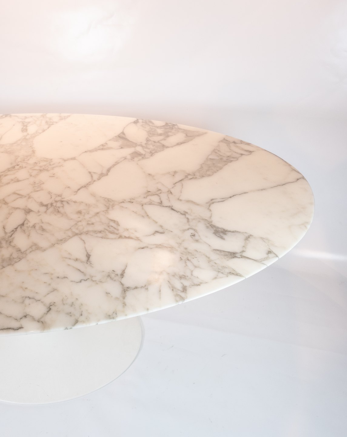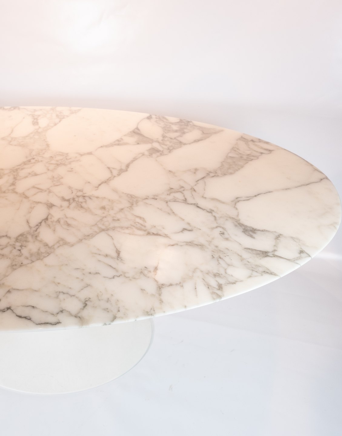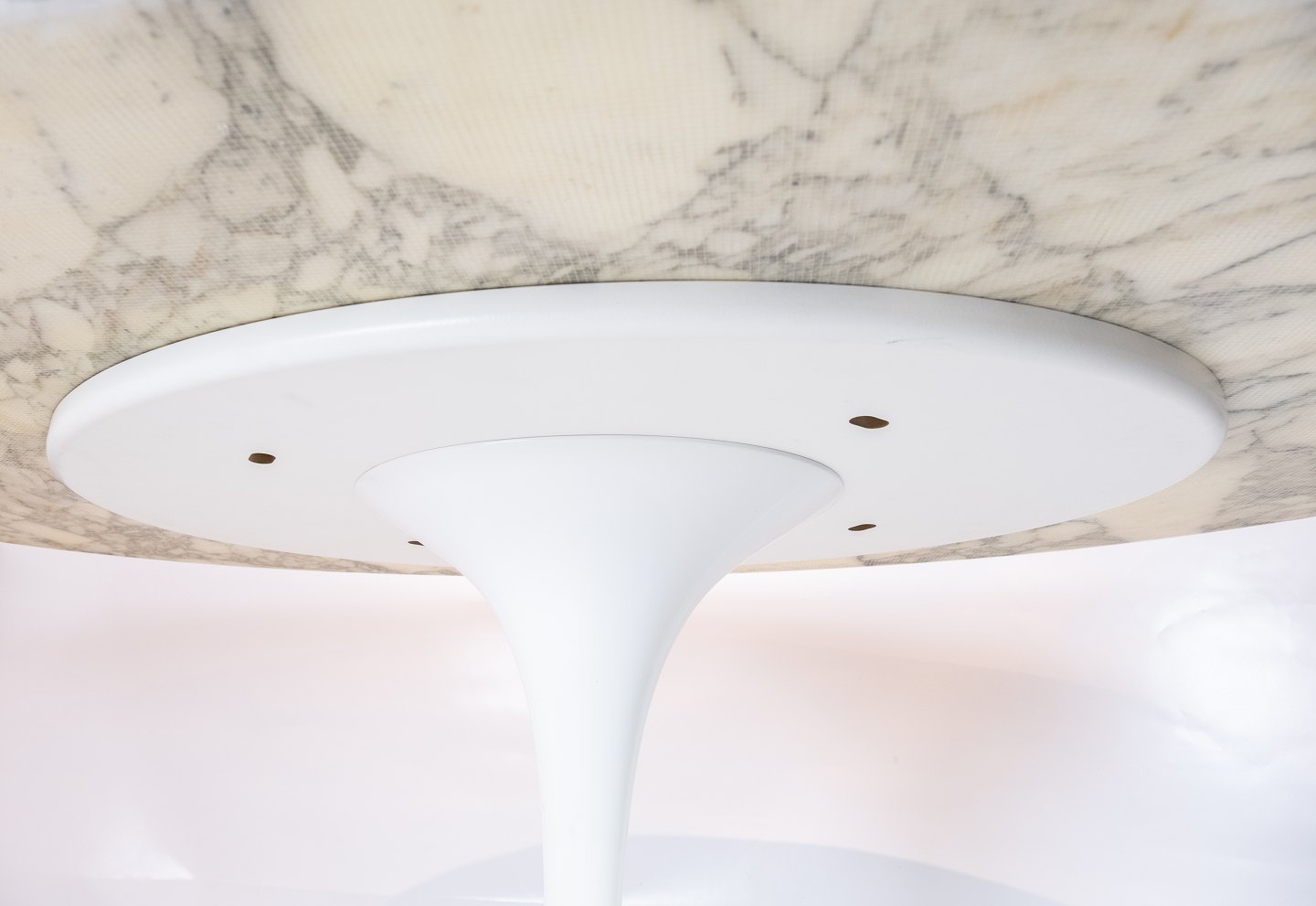 We buyThe Tulip oval dining table with marble top, designed by Eero Saarinen in 1957 for Knoll Furniture, is an iconic representation of mid-century modern design. Saarinen created this table with a vision to clean up the "mess" of legs under traditional tables, resulting in the elegant, simple and sleek Tulip design.