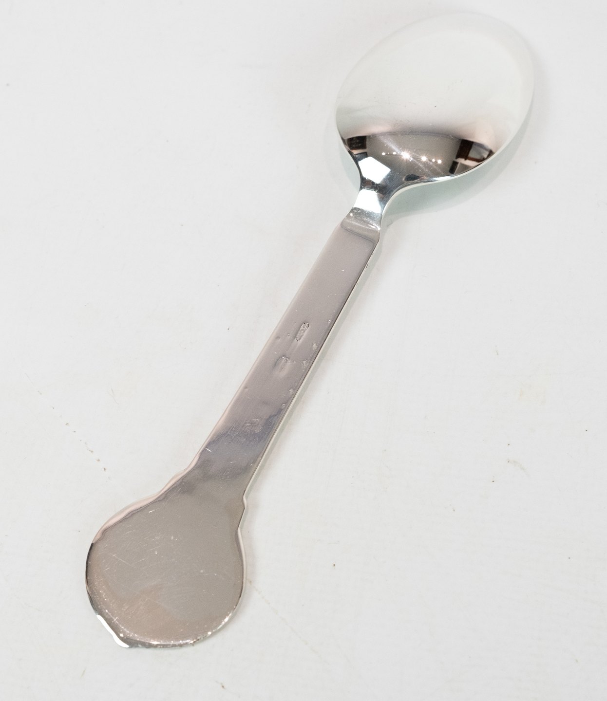 SoldChildren's spoon decorated with clock of hallmarked silver.