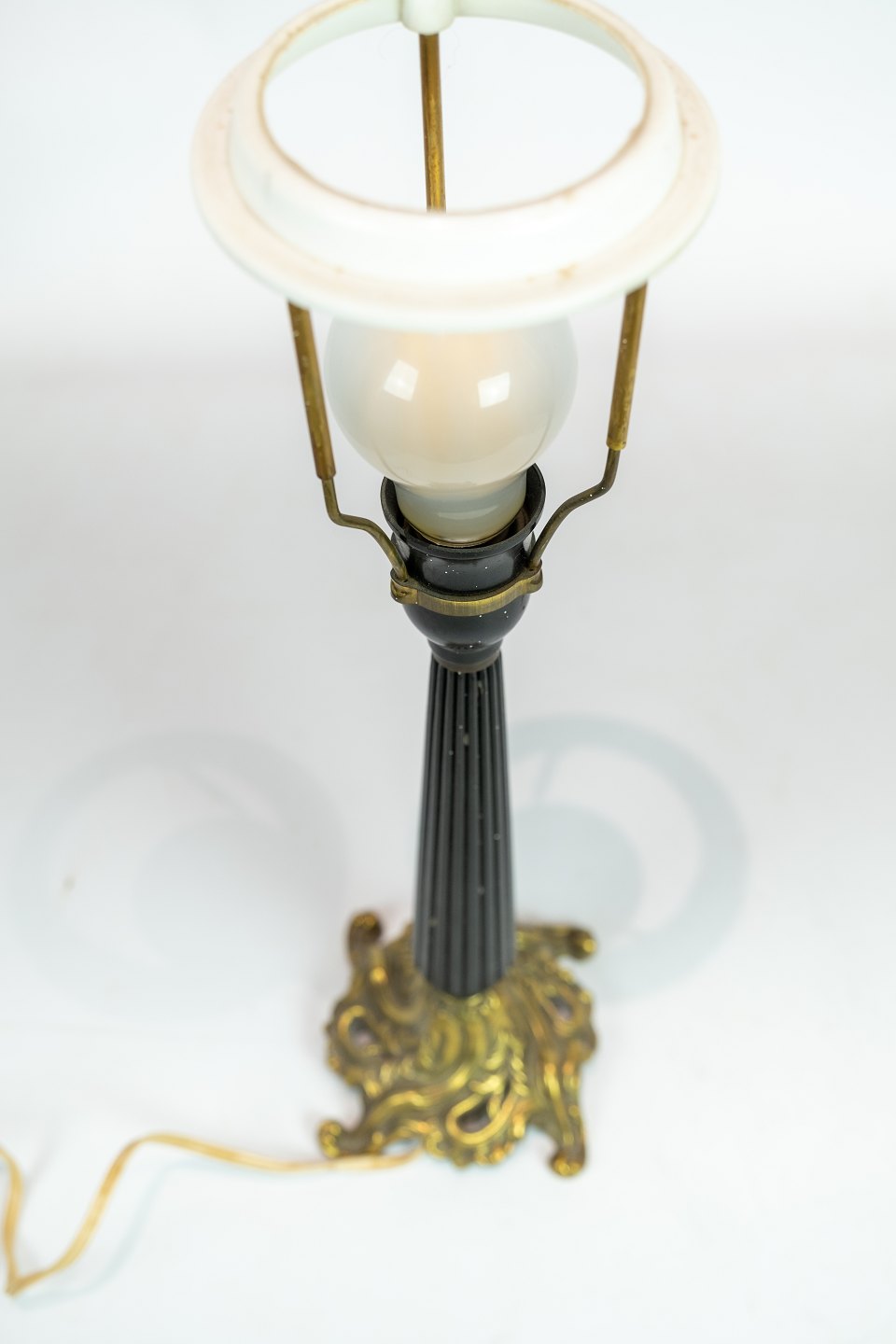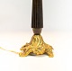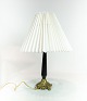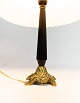 Bordlampe af sort patineret stamme og lureforgyldt fod med skærm i papir.