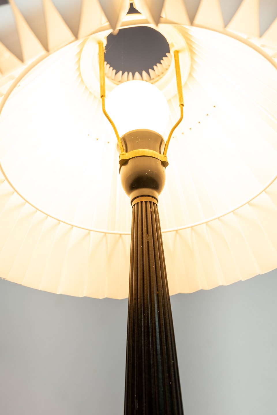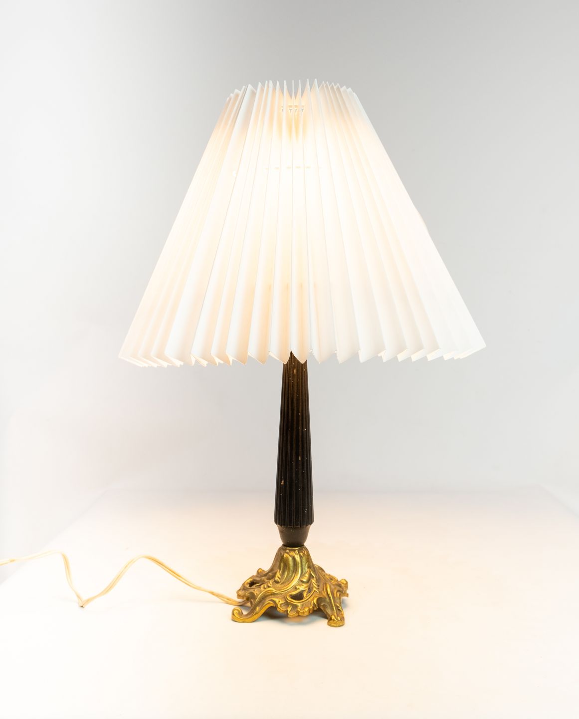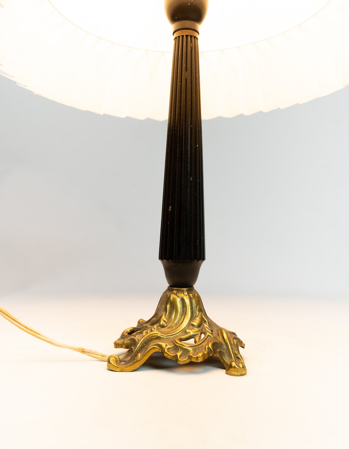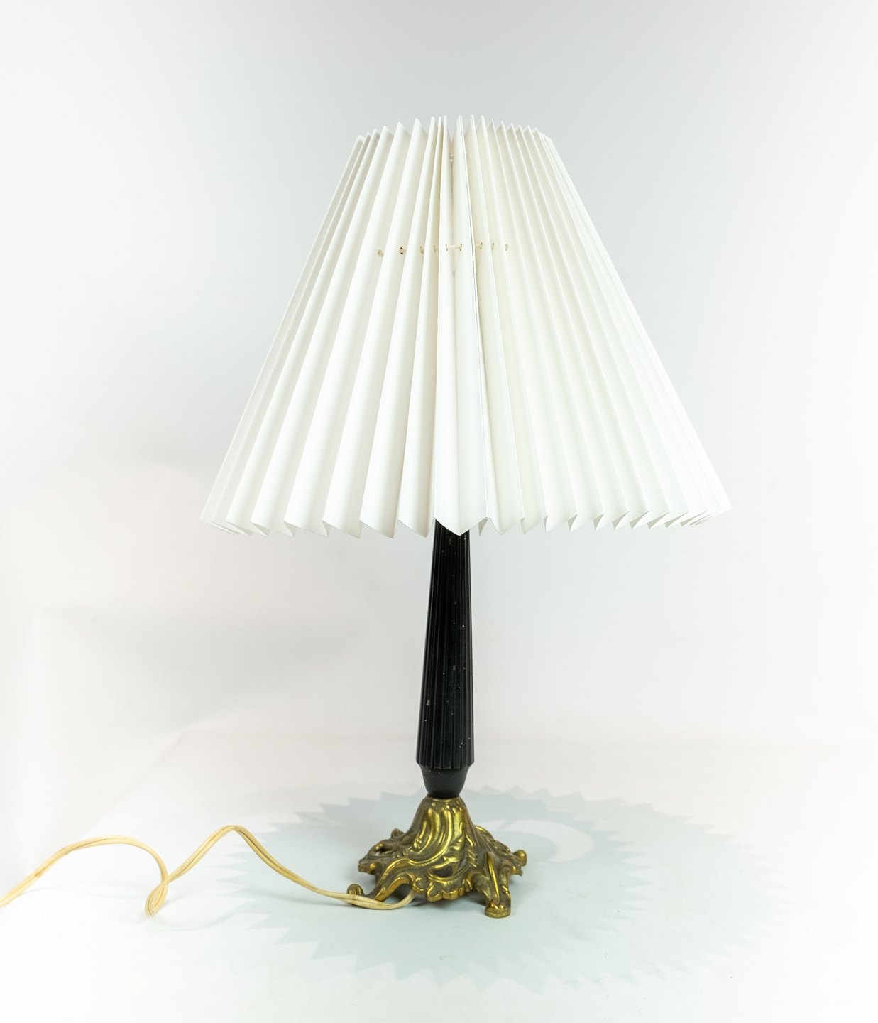 Bordlampe af sort patineret stamme og lureforgyldt fod med skærm i papir. Skærmen er håndfoldet og håndmalet.