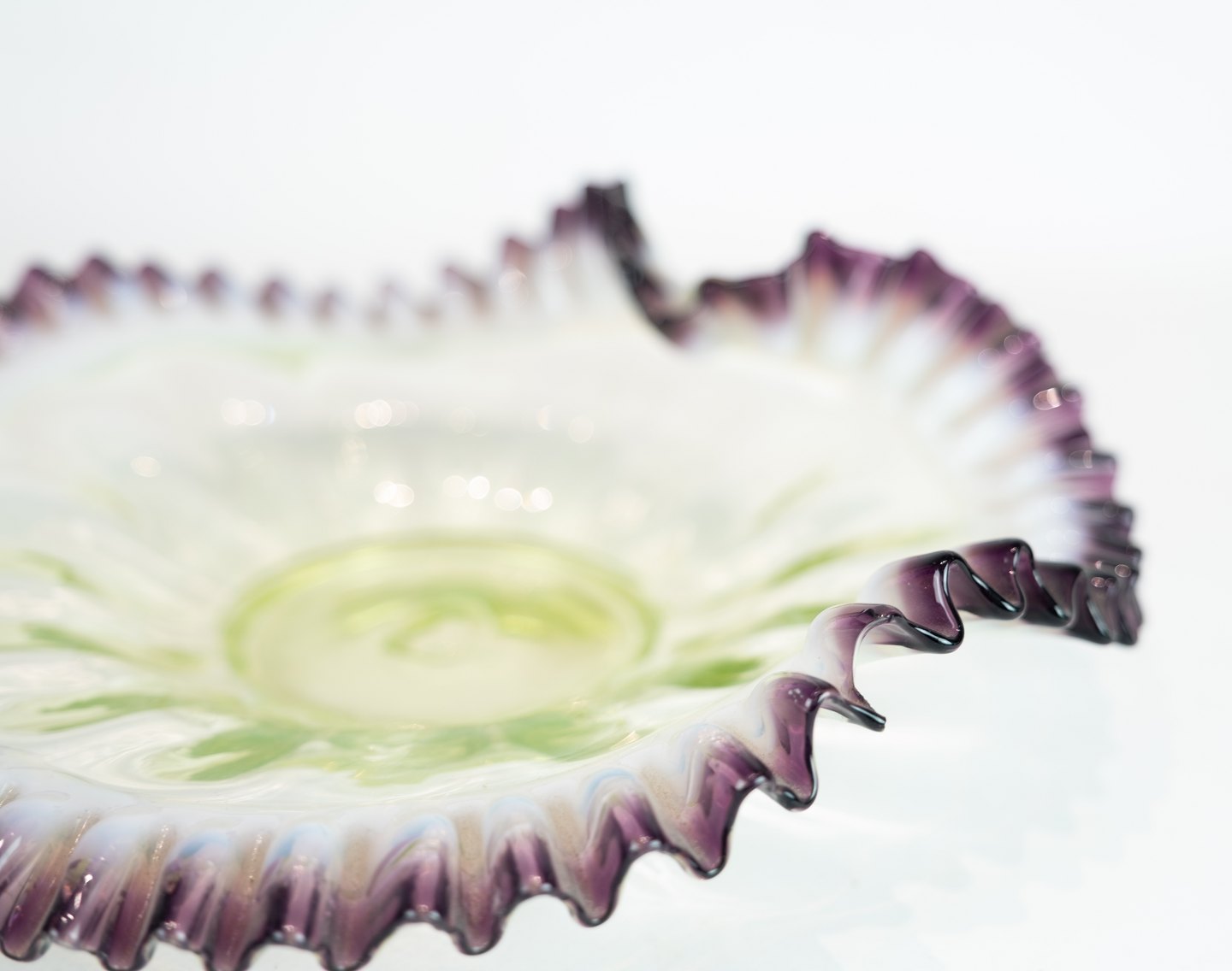 Bowl of opaline glass in great design with yellow and purple colours from the 1890s.