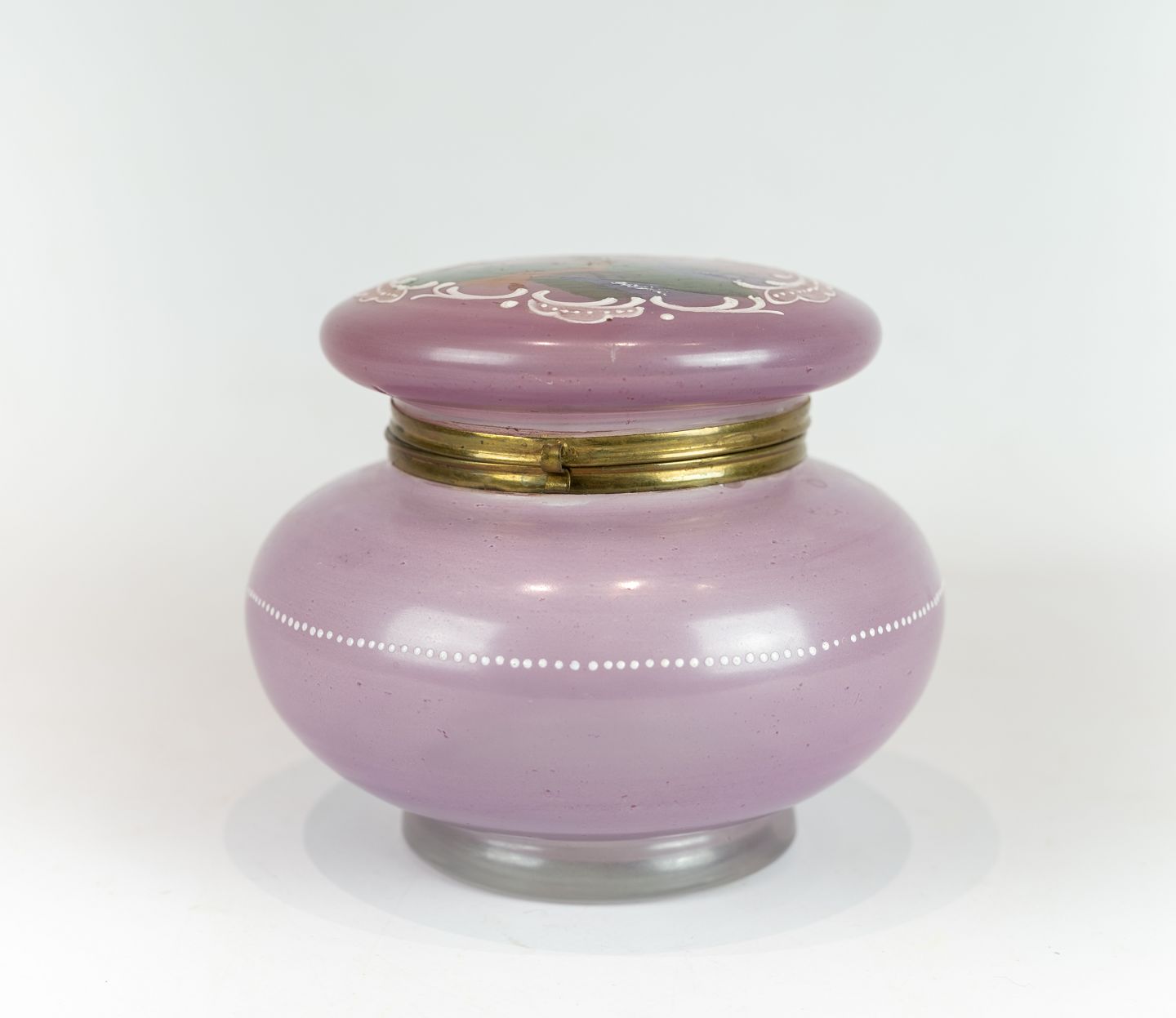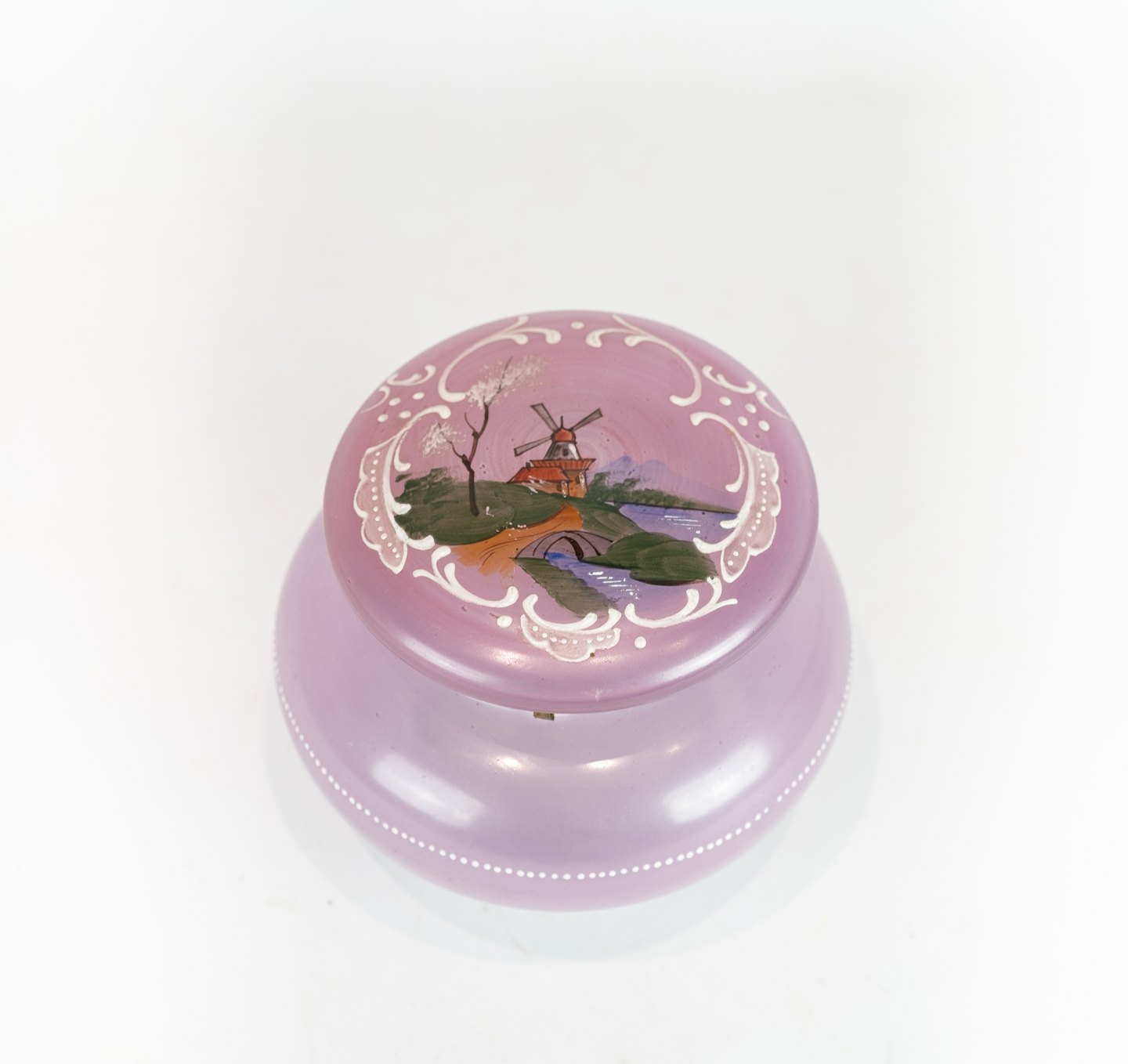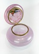 Gammel fin bonbonniere i sart lyserød opalineglas, dekoreret med en mølle fra år ca 1860 I perfekt stand.