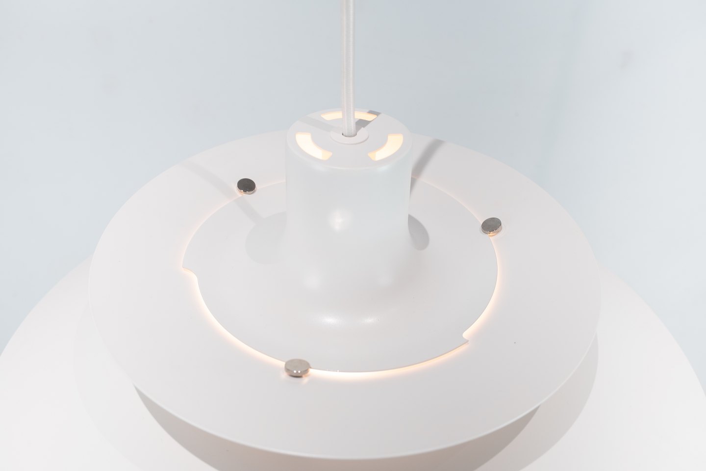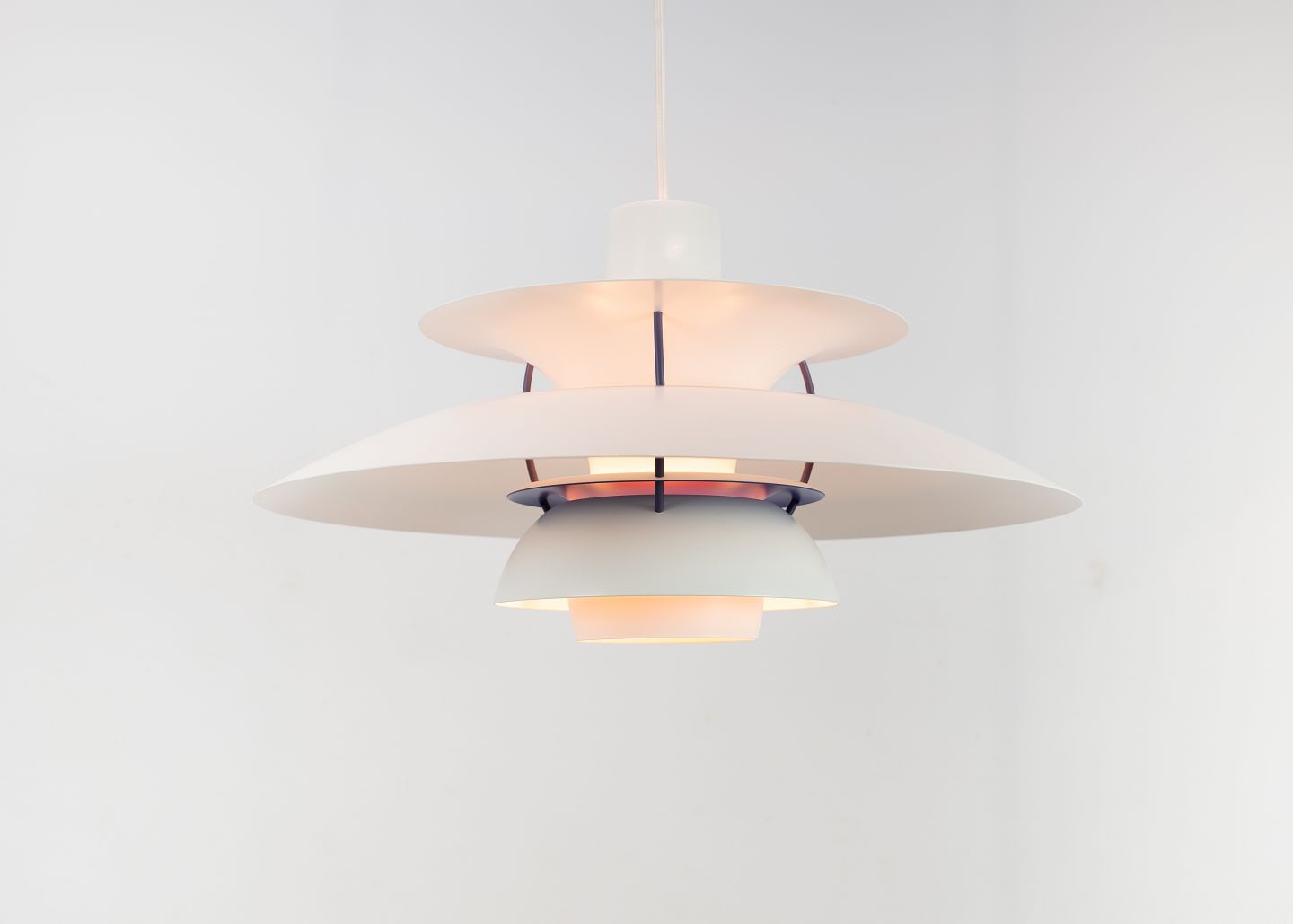 PH5 lampe designet af Poul Henningsen i 1958 og fremstillet af Louis Poulsen. Lampen har lakerede metal skærme i hvid og af nyere model.