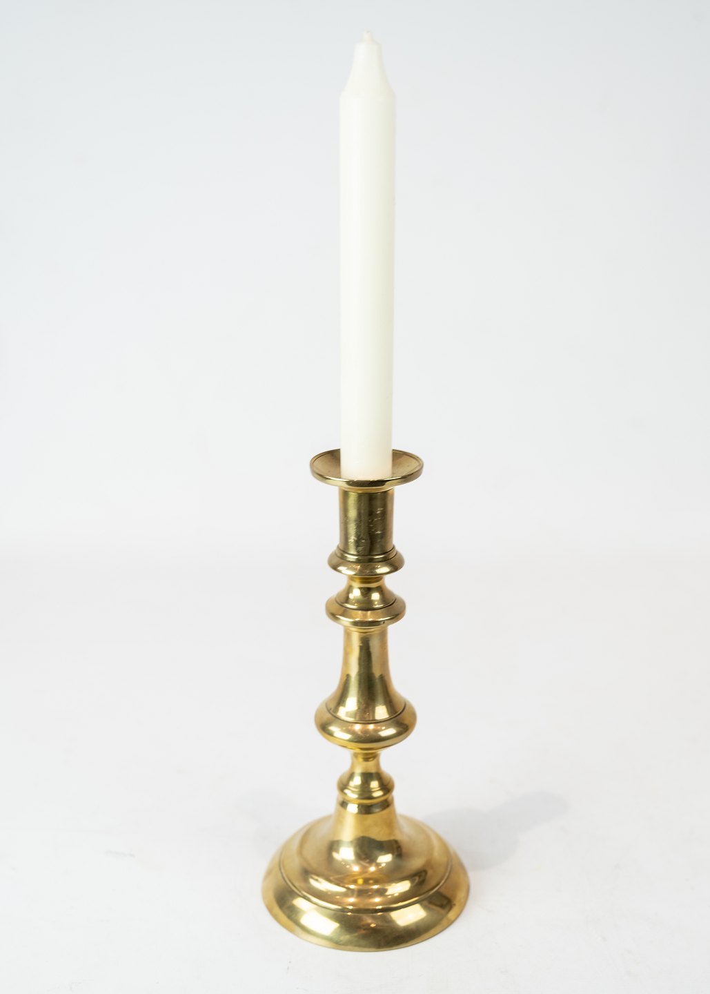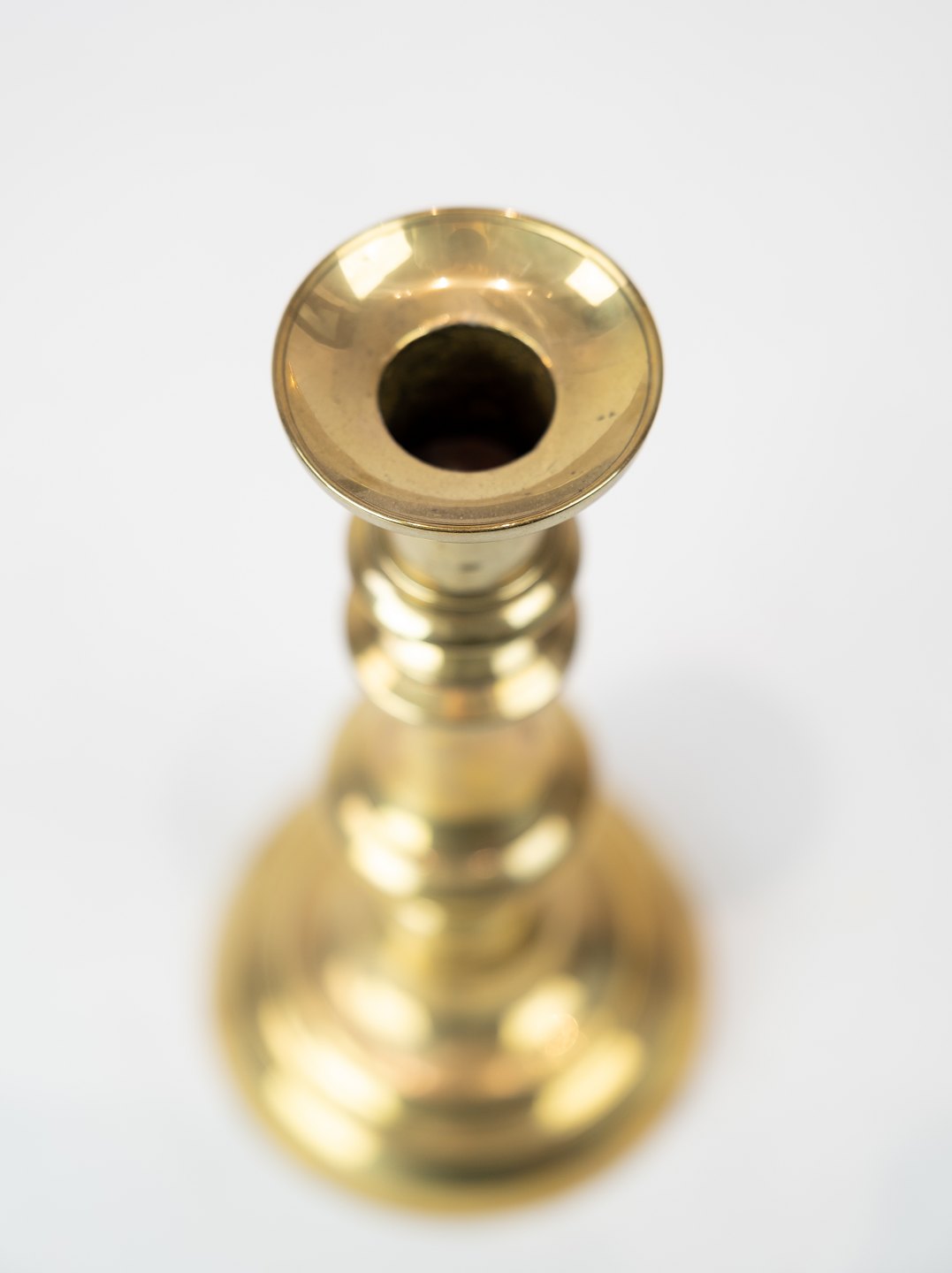 Et sæt engelske lysestager i messing, i flot brugt stand fra 1860erne.