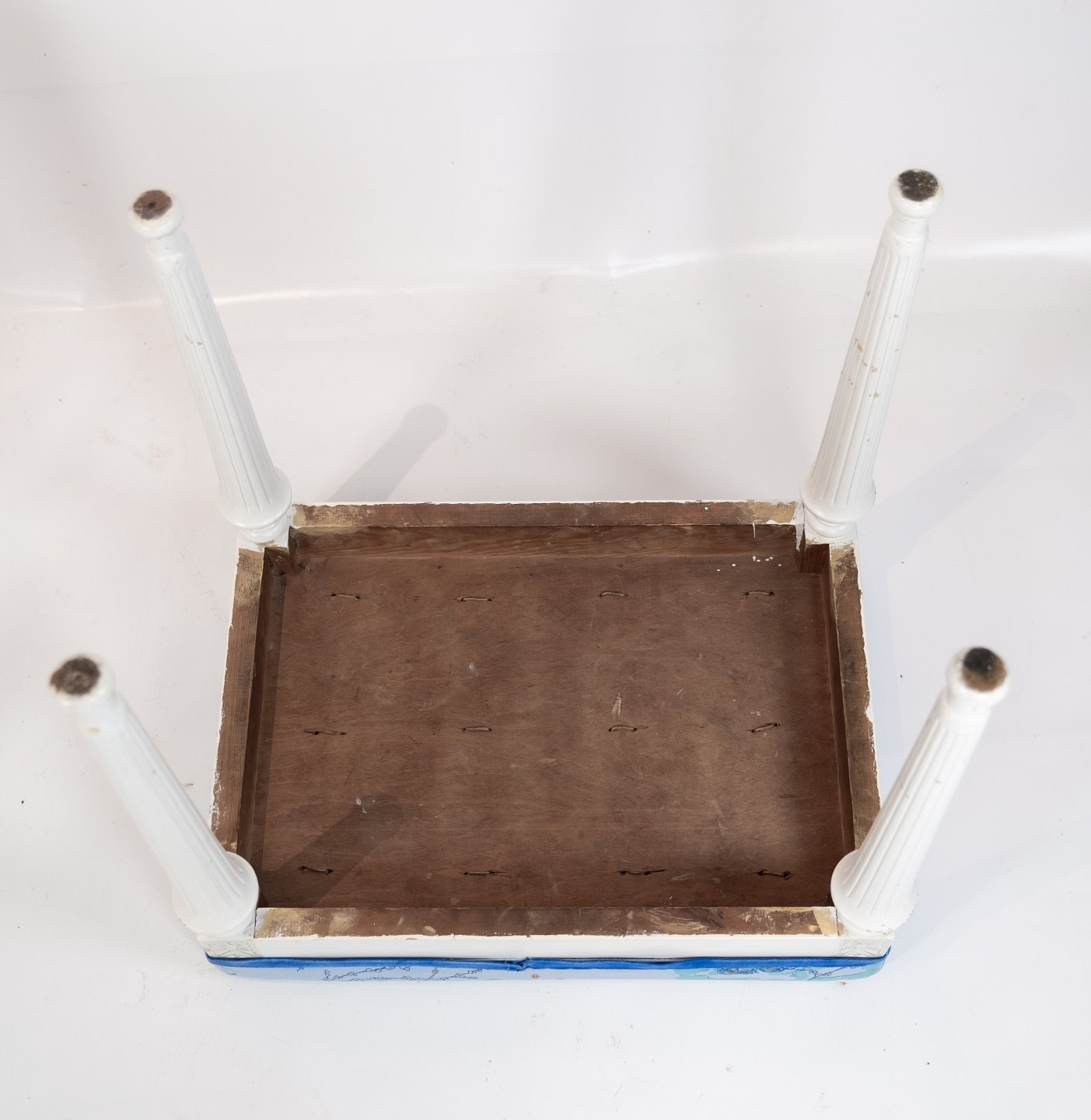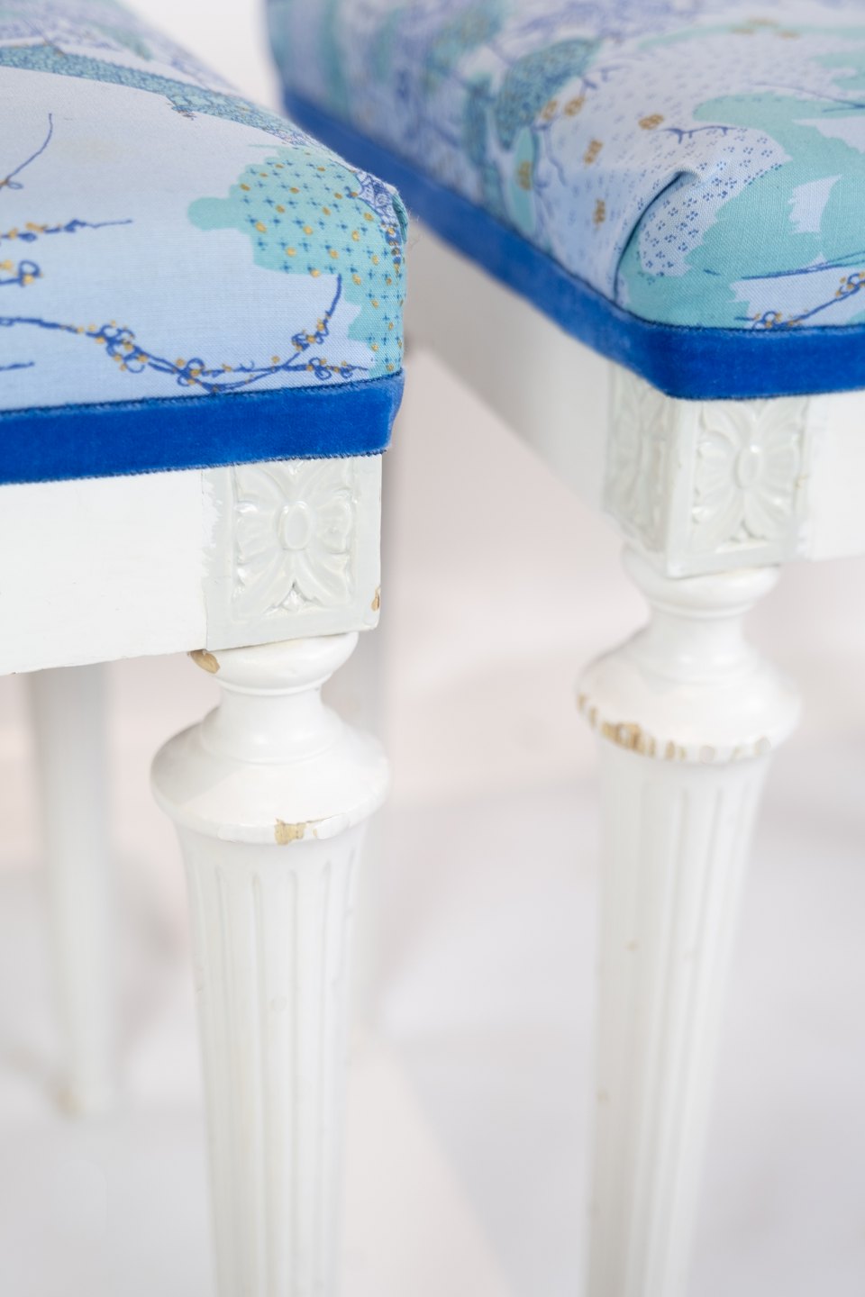 A pair of antique stools of white painted wood and upholstered with blue fabric from the 1920s. The stools are in great vintage condition.