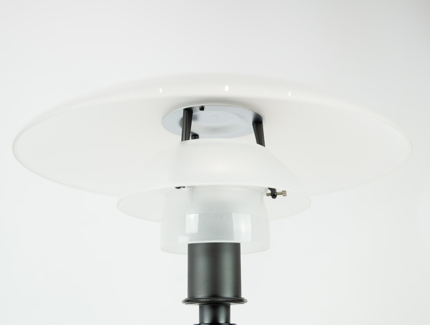 PH 3/2 bordlampe med sort stel og mat glas skærme, designet af Poul Henningsen og fremstillet hos Louis Poulsen.