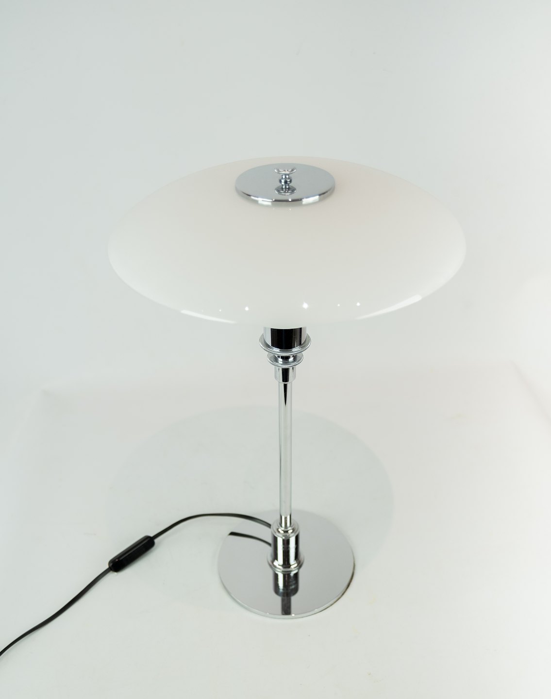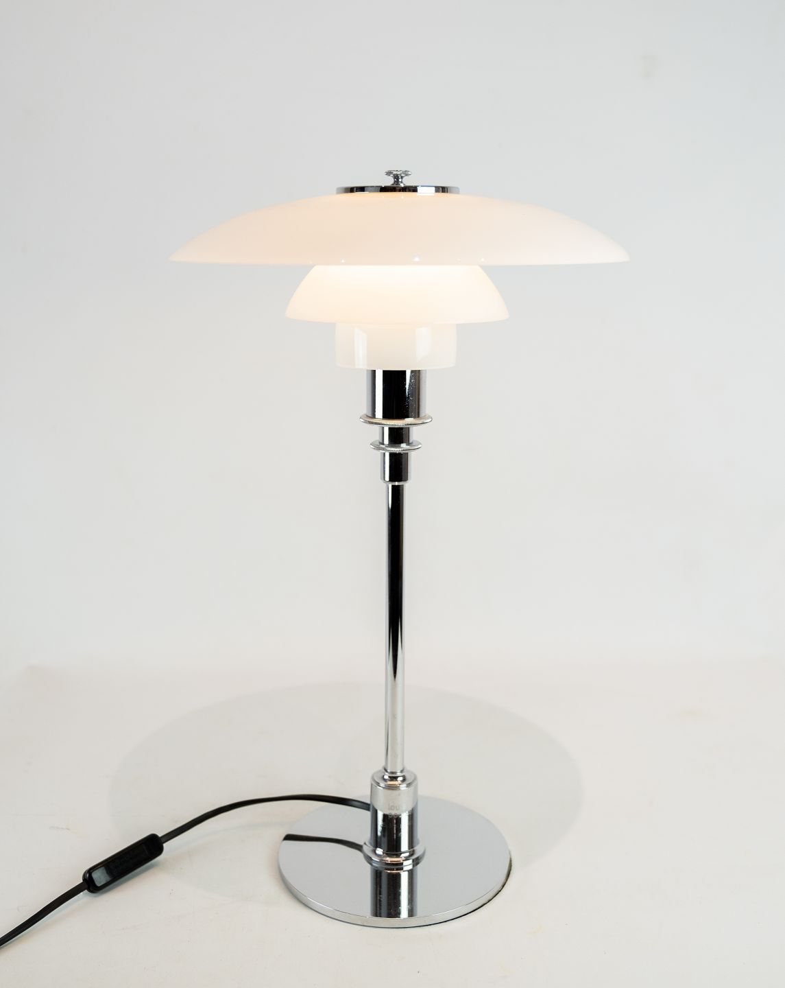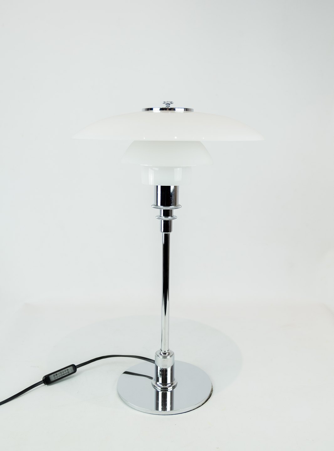 SoldPH 3/2 table lamp with chrome stem and white opaline glass shades, designed by Poul Henningsen and manufactured by Louis Poulsen. The lamp was made in 1999 due to Poul Henningsen's 125th anniversary.