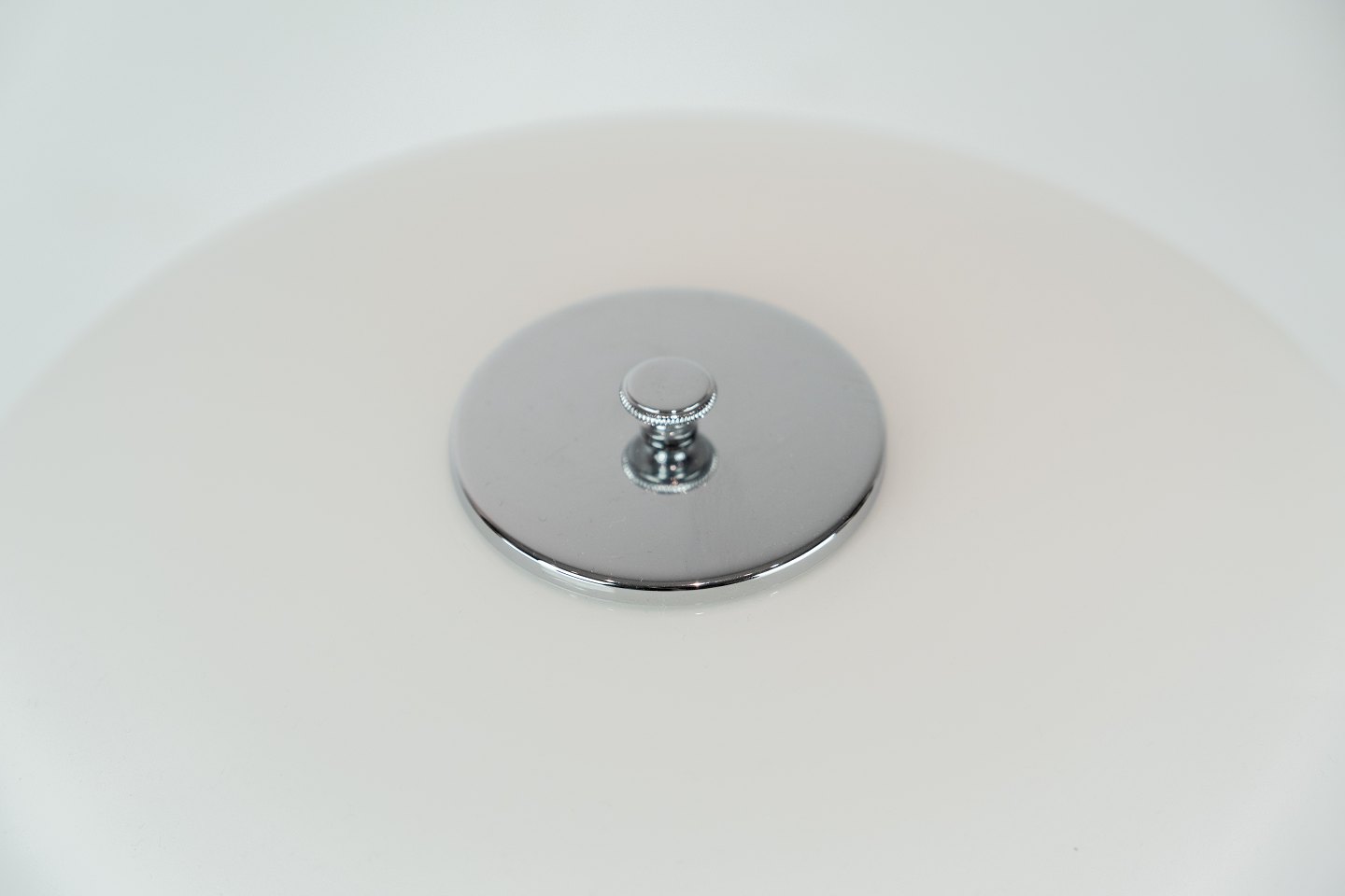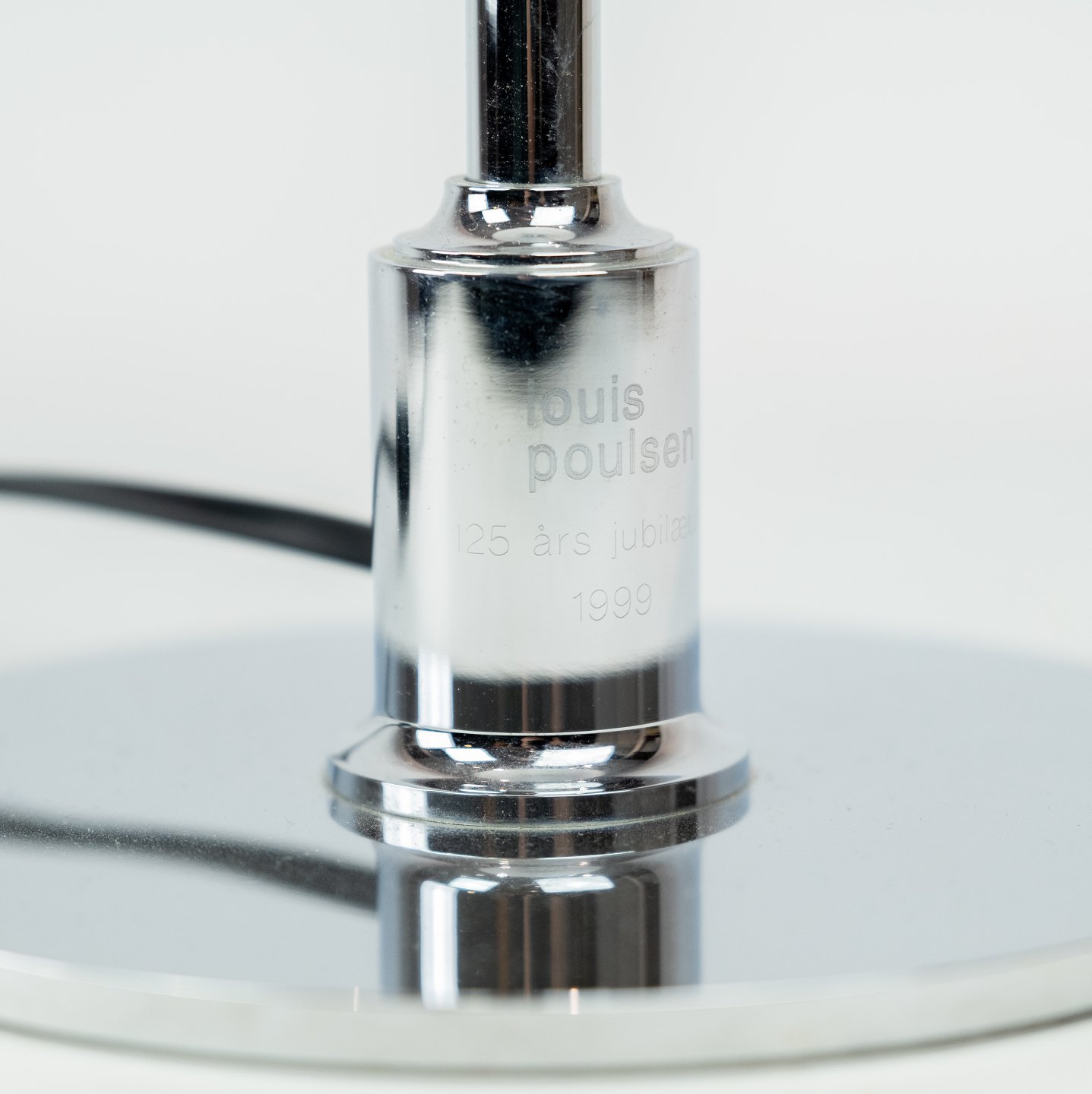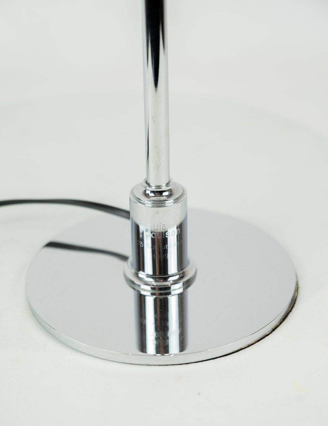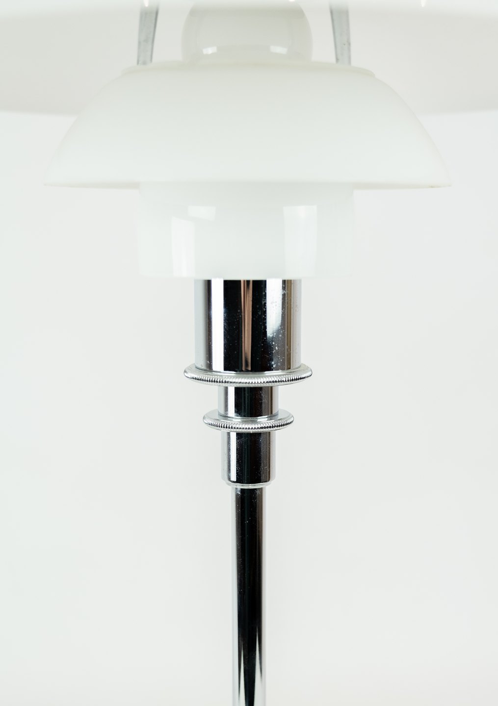 SoldPH 3/2 table lamp with chrome stem and white opaline glass shades, designed by Poul Henningsen and manufactured by Louis Poulsen. The lamp was made in 1999 due to Poul Henningsen's 125th anniversary.