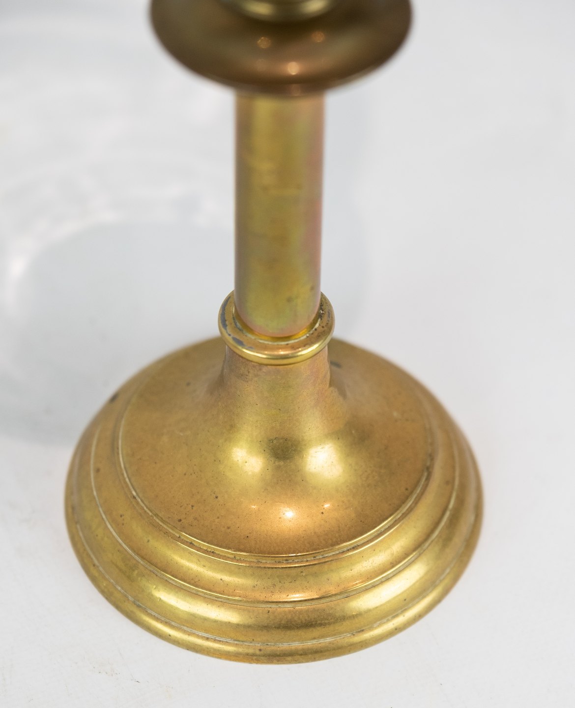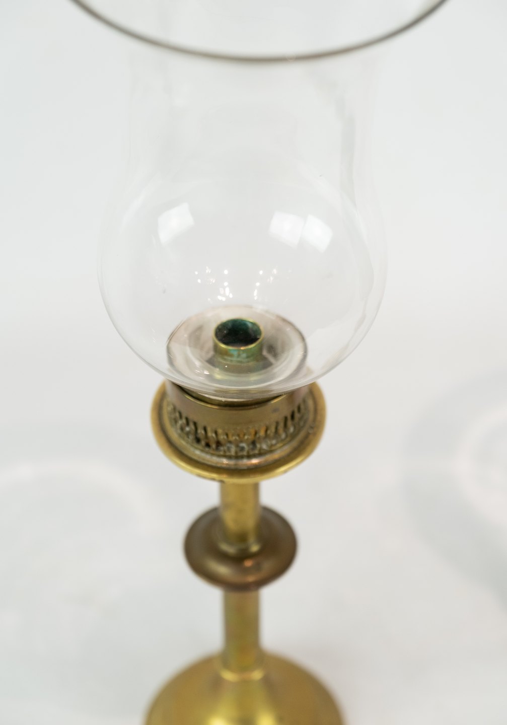 Et par Hurricane lysestager af messing og glas fra 1930erne, begge i flot brugt stand.