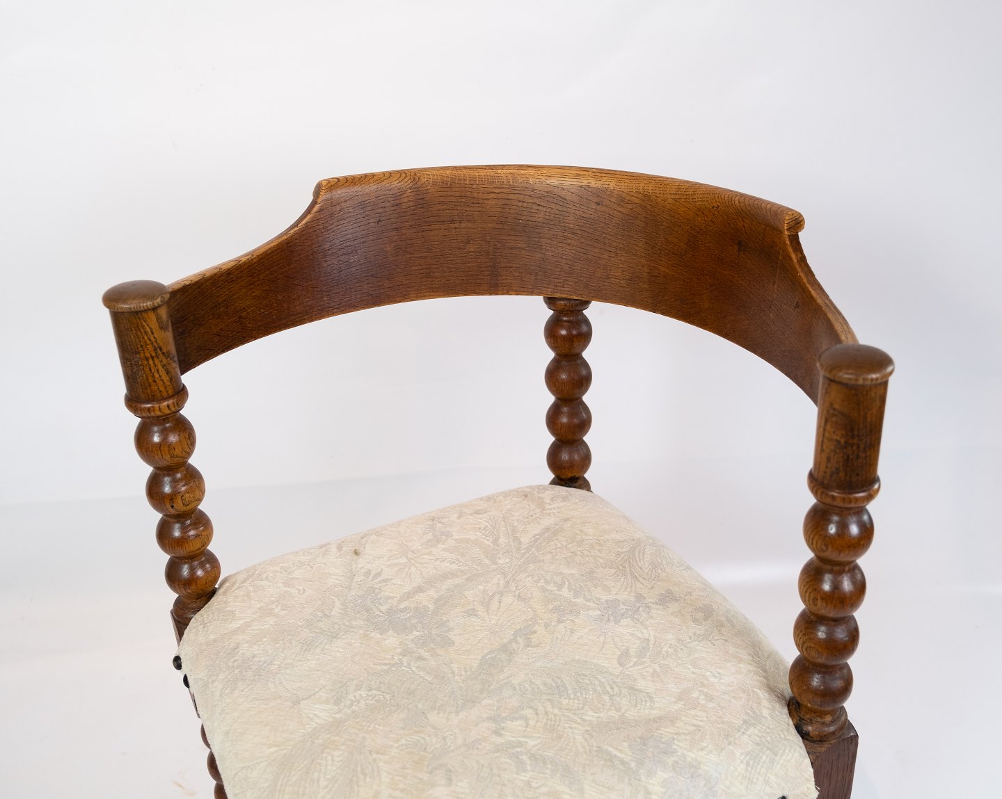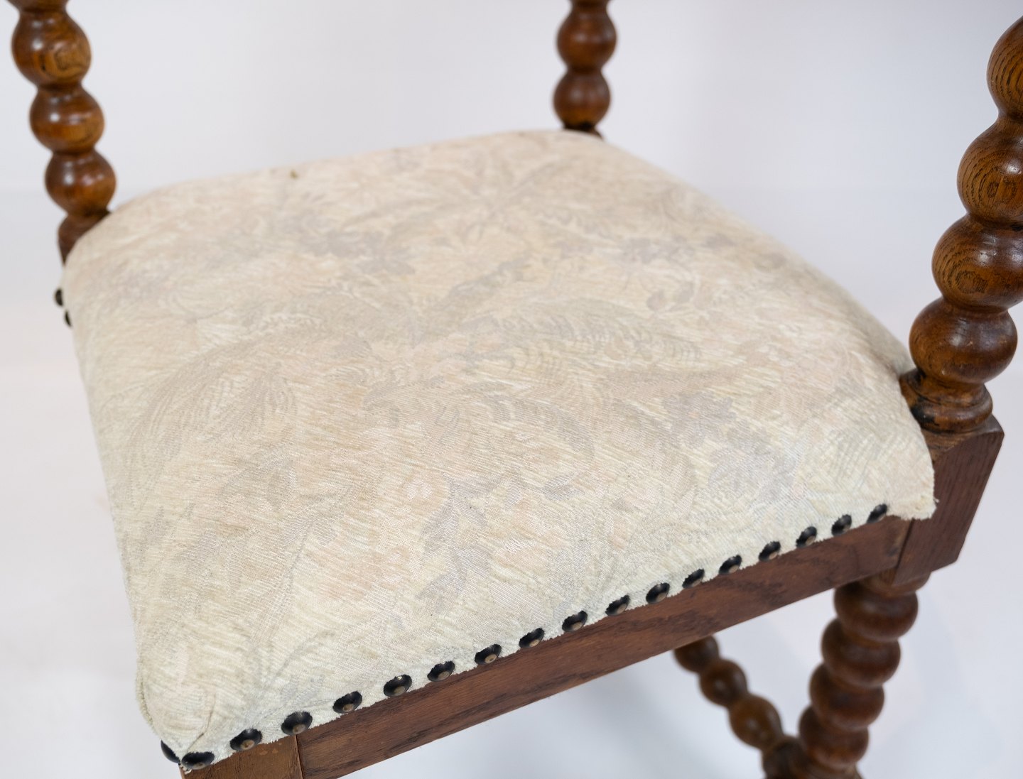 Antik stol med udskæringer af eg og polstret med lyst stof fra 1920erne. Stolen er i flot antik stand.