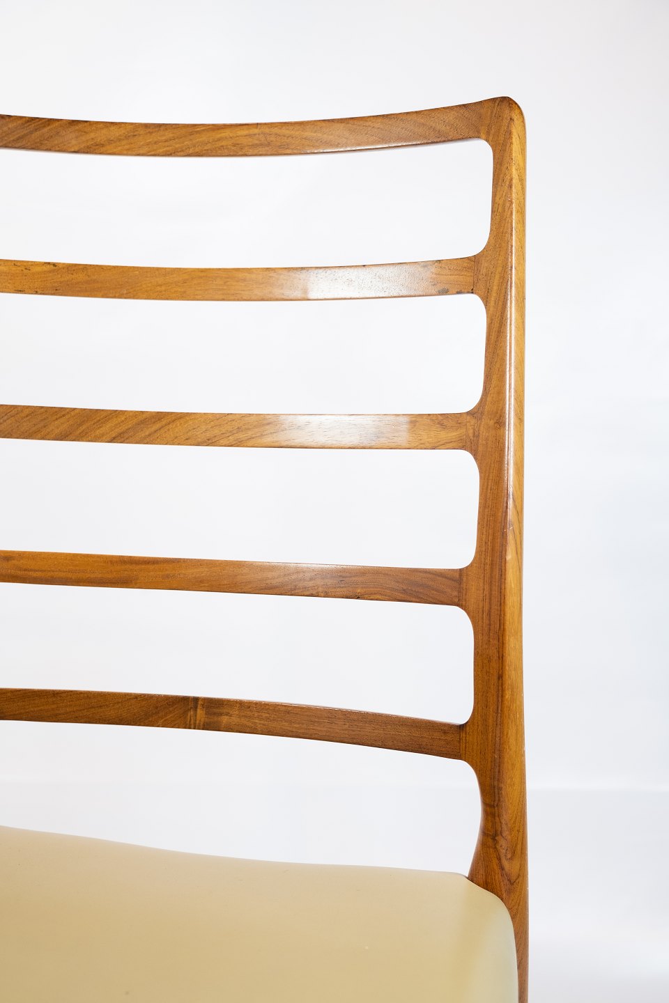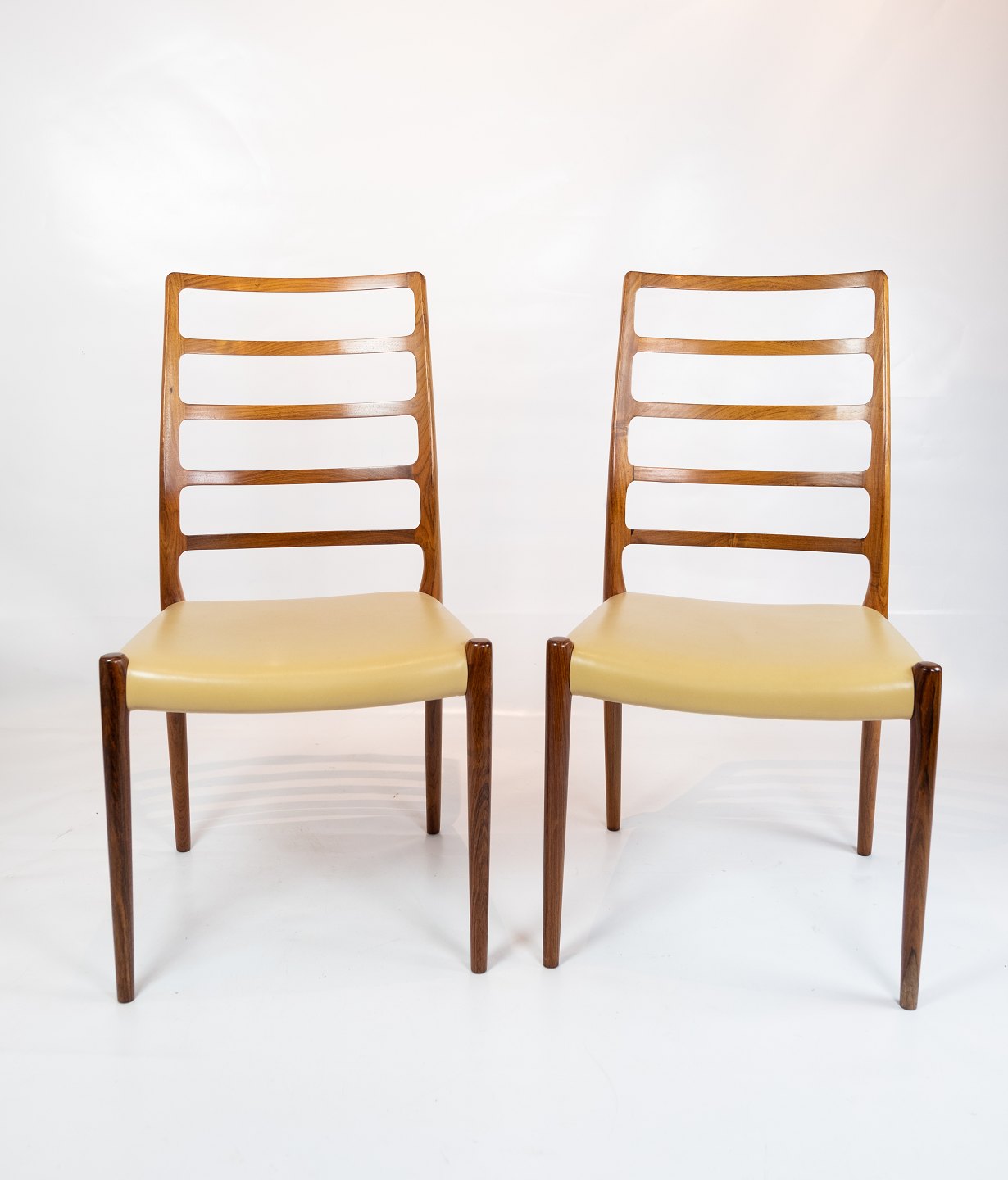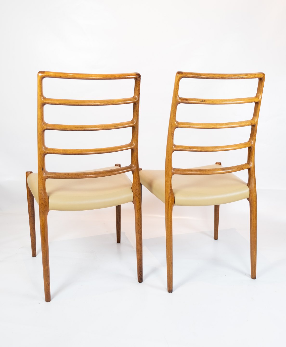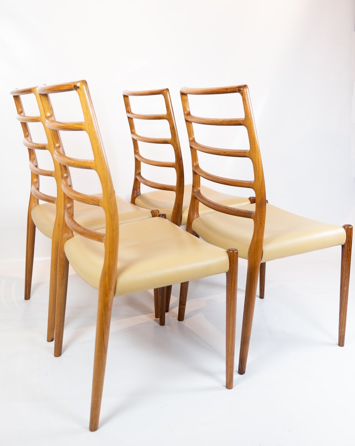 Sættet består af fire spisestuestole, model 82, designet af den anerkendte møbeldesigner N.O. Møller i 1960'erne. Disse elegante stole er fremstillet af palisander, hvilket giver dem en varm og tidløs æstetik, der passer perfekt til ethvert spiseområde eller køkken.
