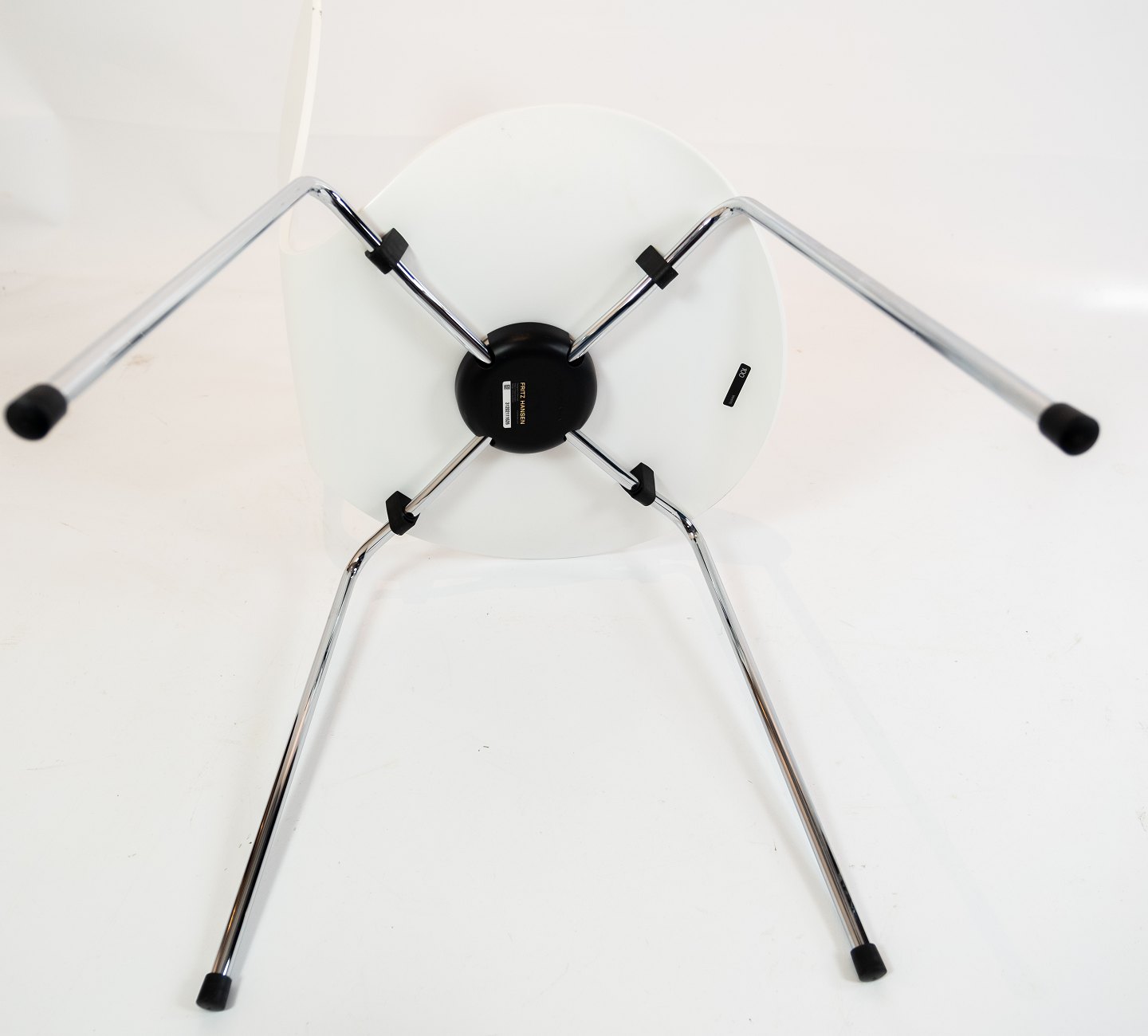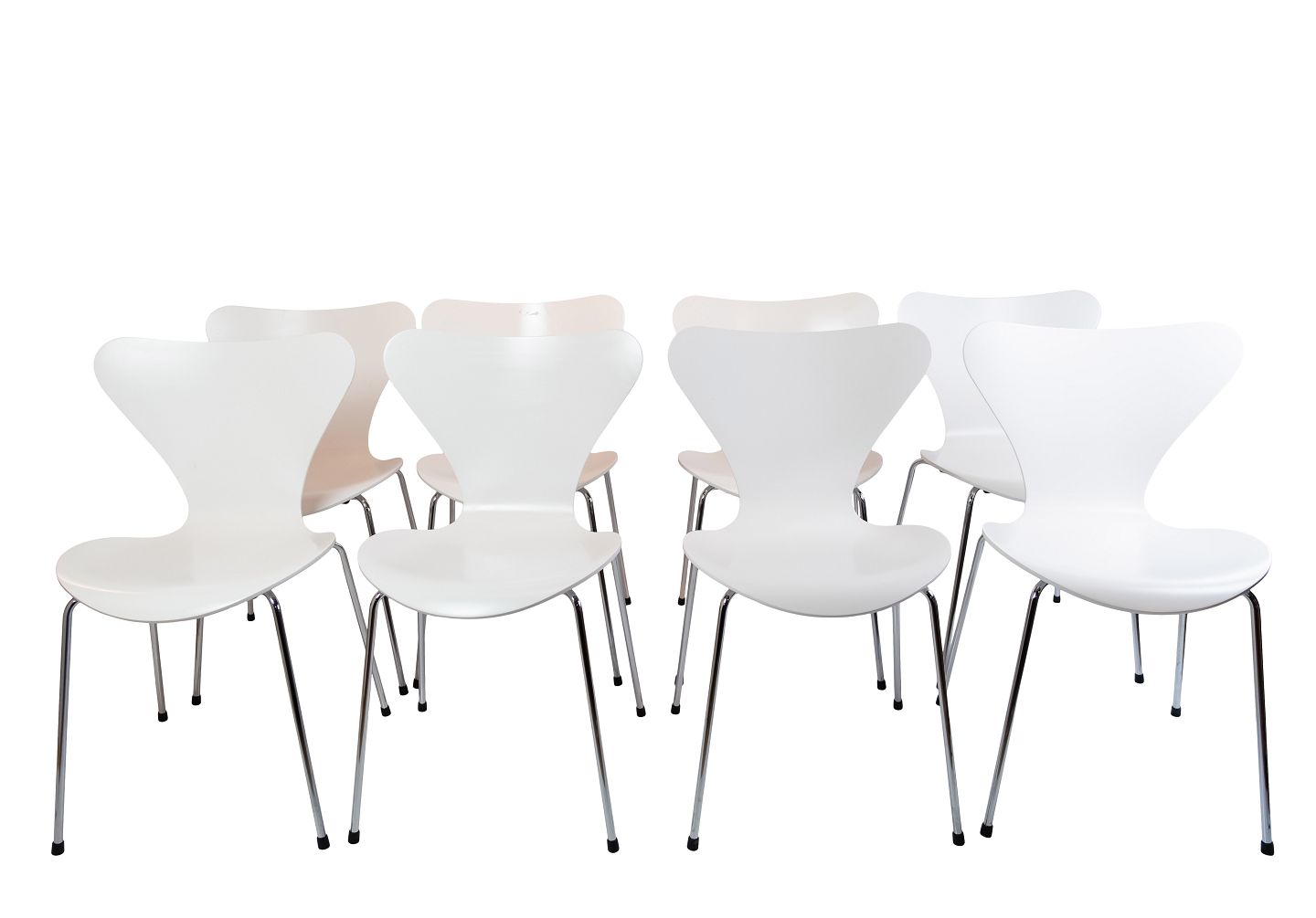 Dette sæt af Syver-stole, model 3107, designet af Arne Jacobsen og fremstillet af Fritz Hansen, repræsenterer en milepæl i dansk møbeldesign. Syver-stolen, også kendt som "Serie 7", blev designet i 1955 og er blevet en af de mest ikoniske og udbredte stole i verden.