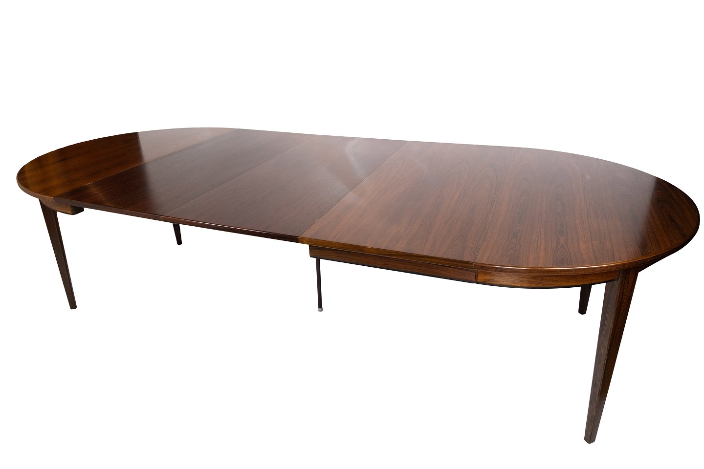 Spisebord i palisander, model 55, designet af Omann Junior fra 1960erne. Bordet er med tre udtræksplader og i flot brugt stand. '
