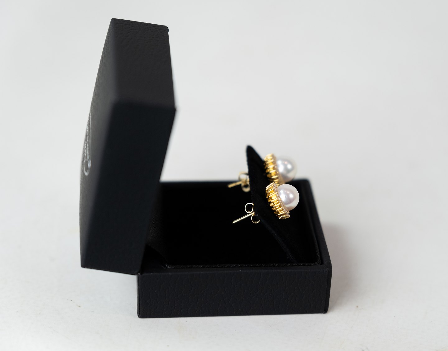 Sæt af øreringe af 18 karat guld med rosa kulturperle omkranset af 21 mindre diamanter.