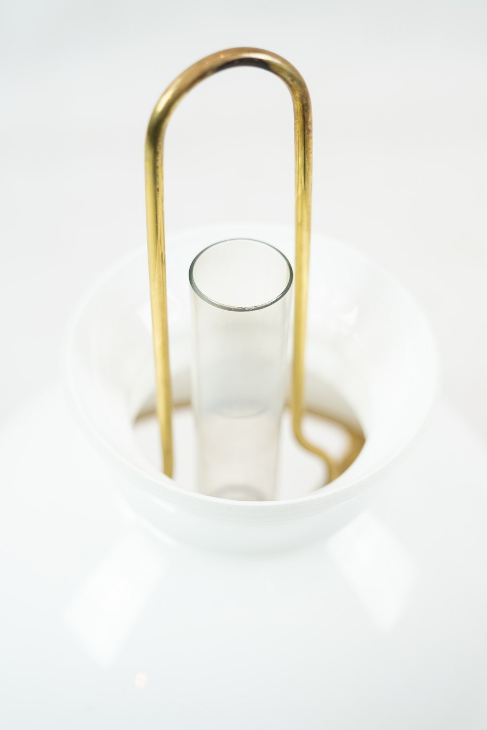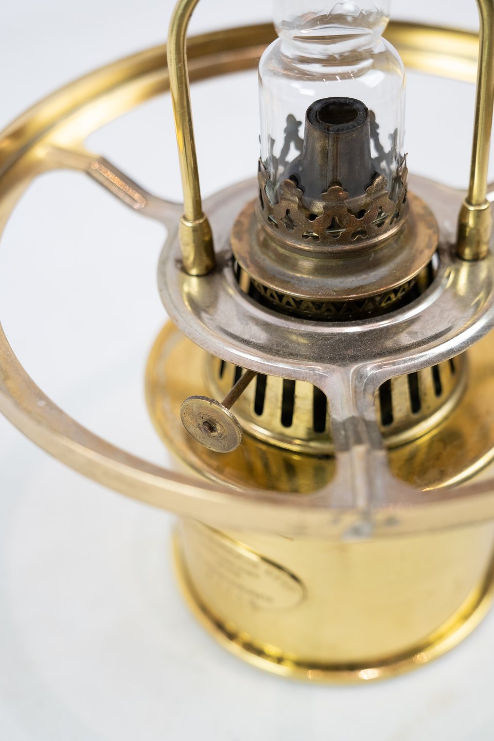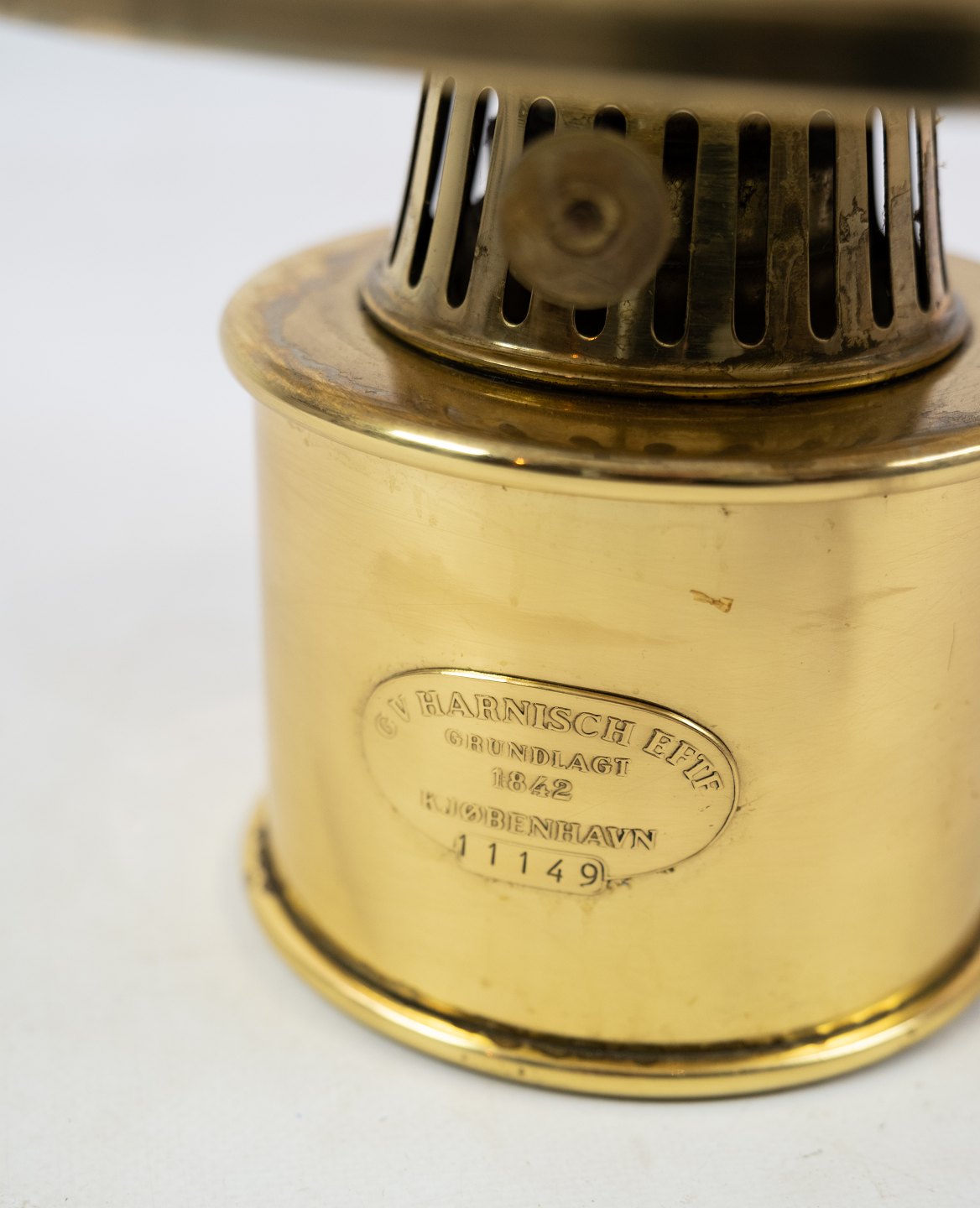 SoldG. V. Harnisch oil lamp of brass with opaline shade by Holmegaard from the 1960s.