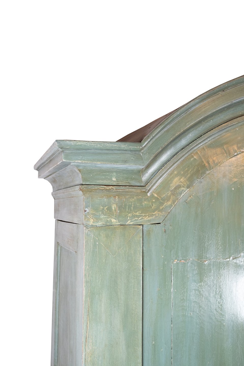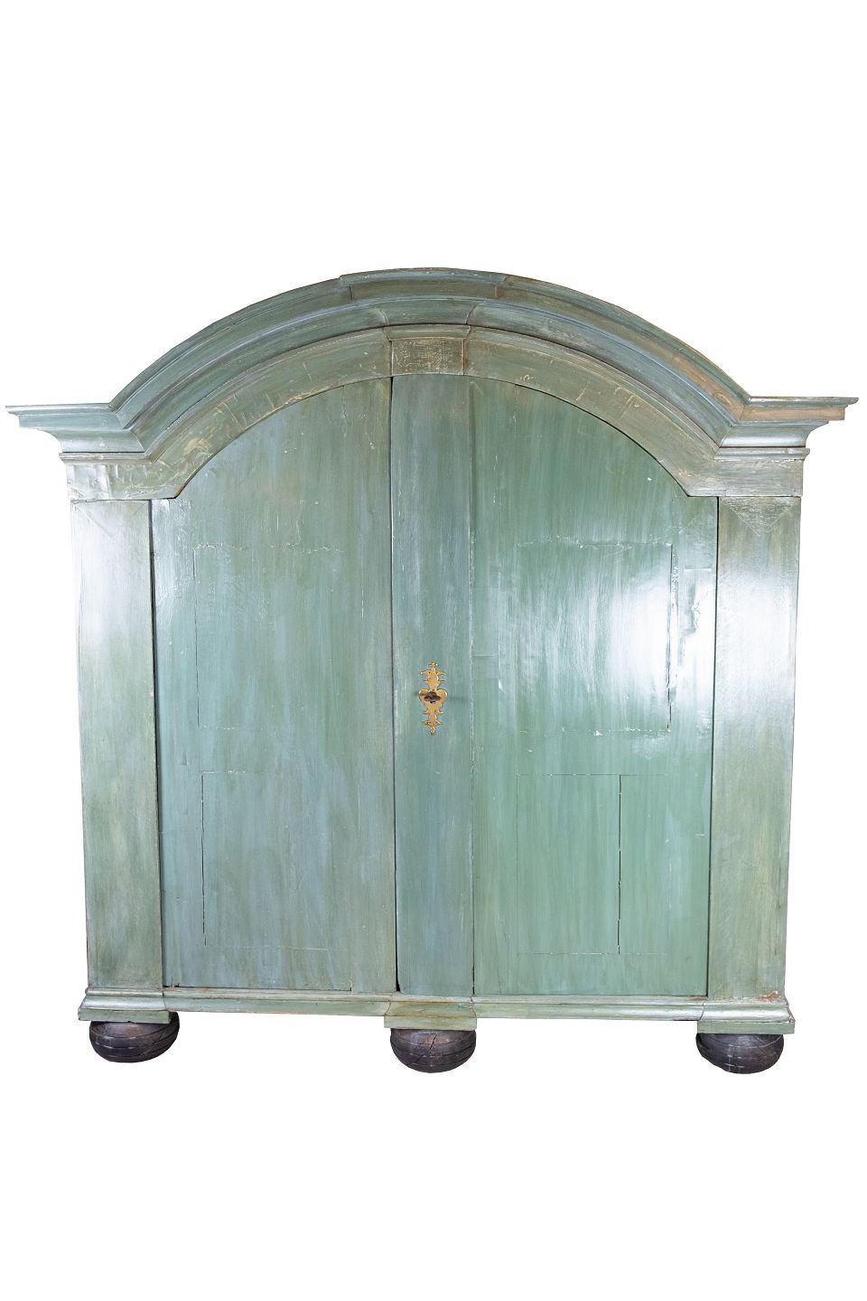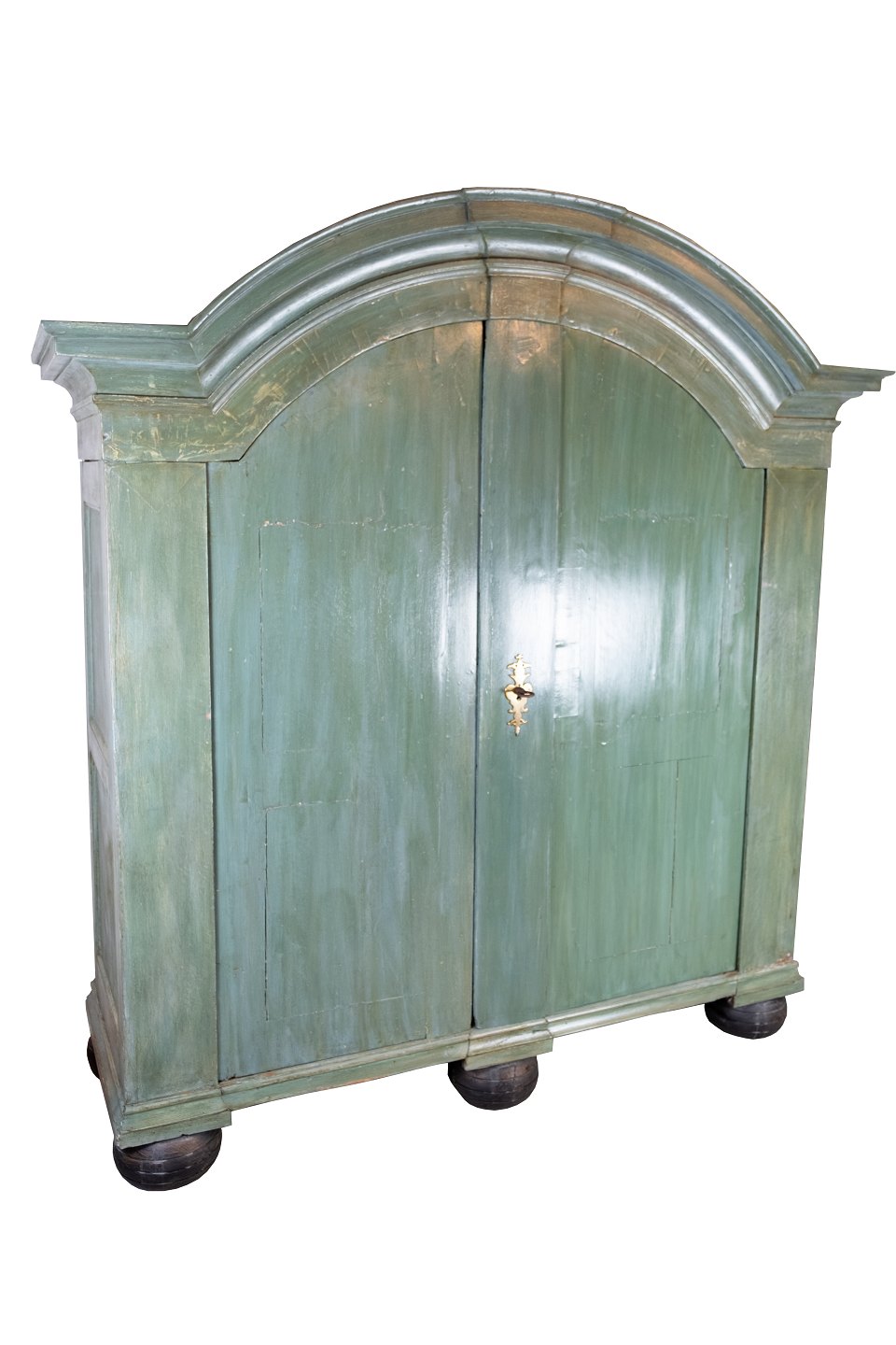 The green originally painted large baroque cabinet from Denmark, circa 1760, is an impressive piece of furniture history that exudes a unique aesthetic and a historical charm. The cabinet, with its characteristic baroque style and the original green painted finish, is a beautiful example of the craftsmanship and aesthetic finesse that characterize furniture from this period. The green color adds a special dimension to the cabinet's appearance and creates a unique visual effect. With its original paint intact and in beautiful antique condition, the cabinet retains its authenticity and real character over the years. It is not just a piece of furniture, but also a piece of cultural history that tells about the style and taste of the past. H - 205 cm, W - 193 cm and D - 71 cm.