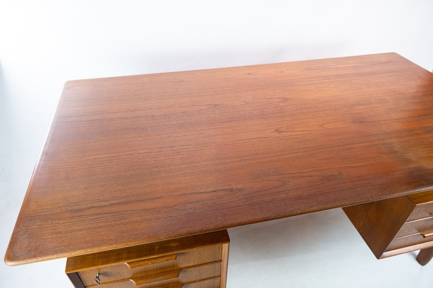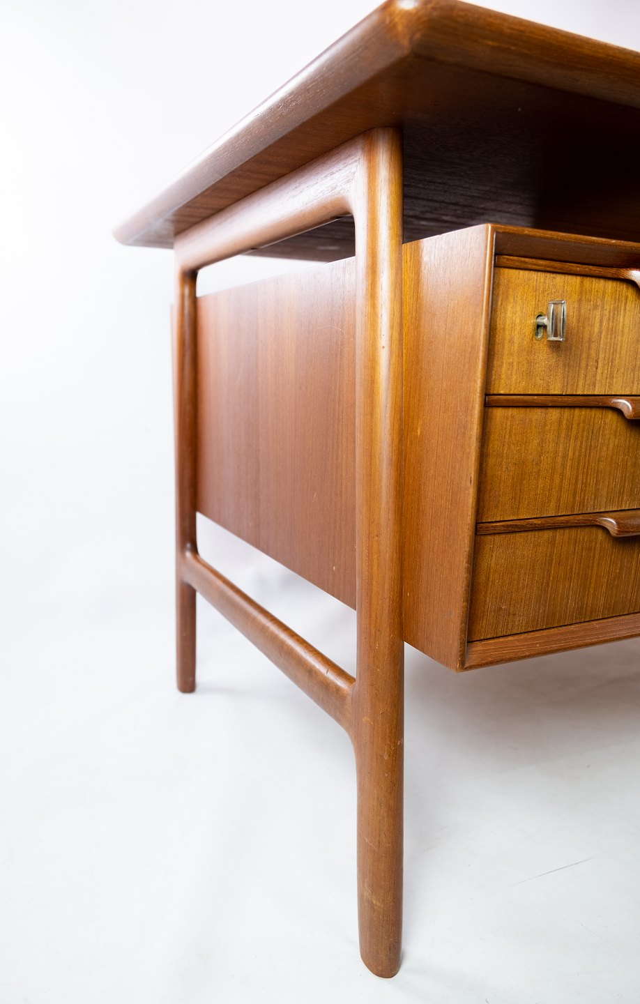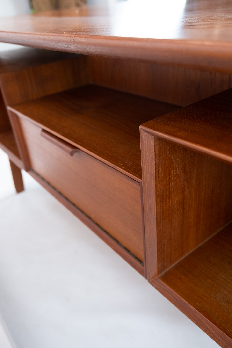 Skrivebordet i teak, designet af Omann Junior i 1960'erne, er et smukt eksempel på dansk møbeldesign fra denne periode.