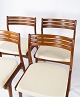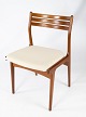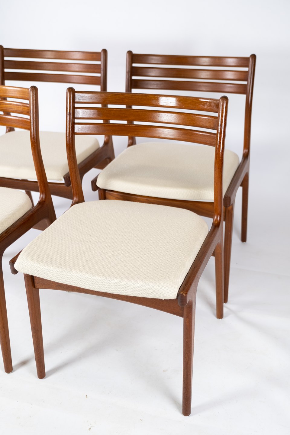 This set of four dining chairs exudes the timeless elegance and functionality that characterizes Danish design from the 1960s. Made from solid teak wood and upholstered with bright wool fabric, these chairs combine both aesthetic appeal and comfort. Their simple and streamlined silhouettes bring a touch of elegance to any dining area or kitchen. Despite their age, the chairs still stand beautifully and bear signs of their history, adding character to any decor.