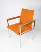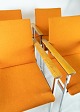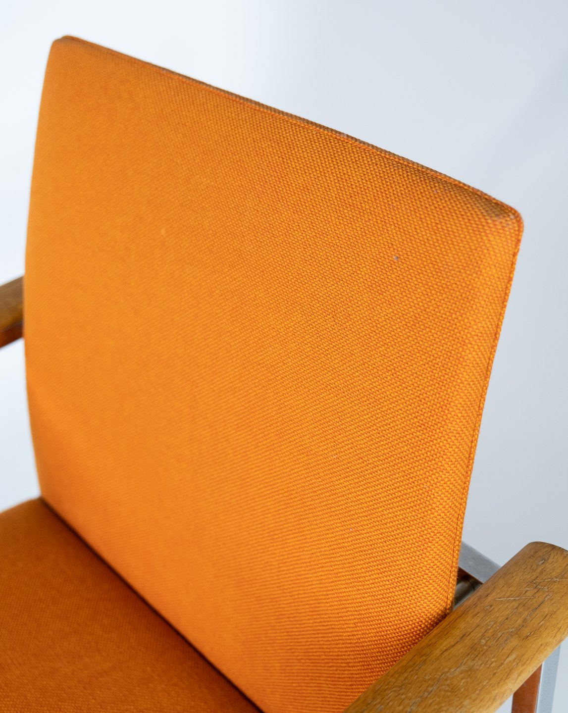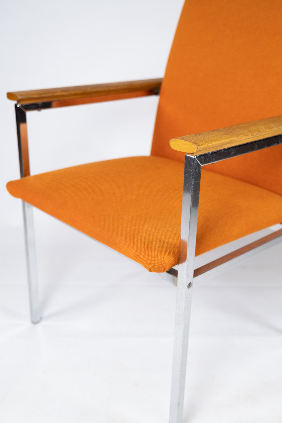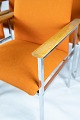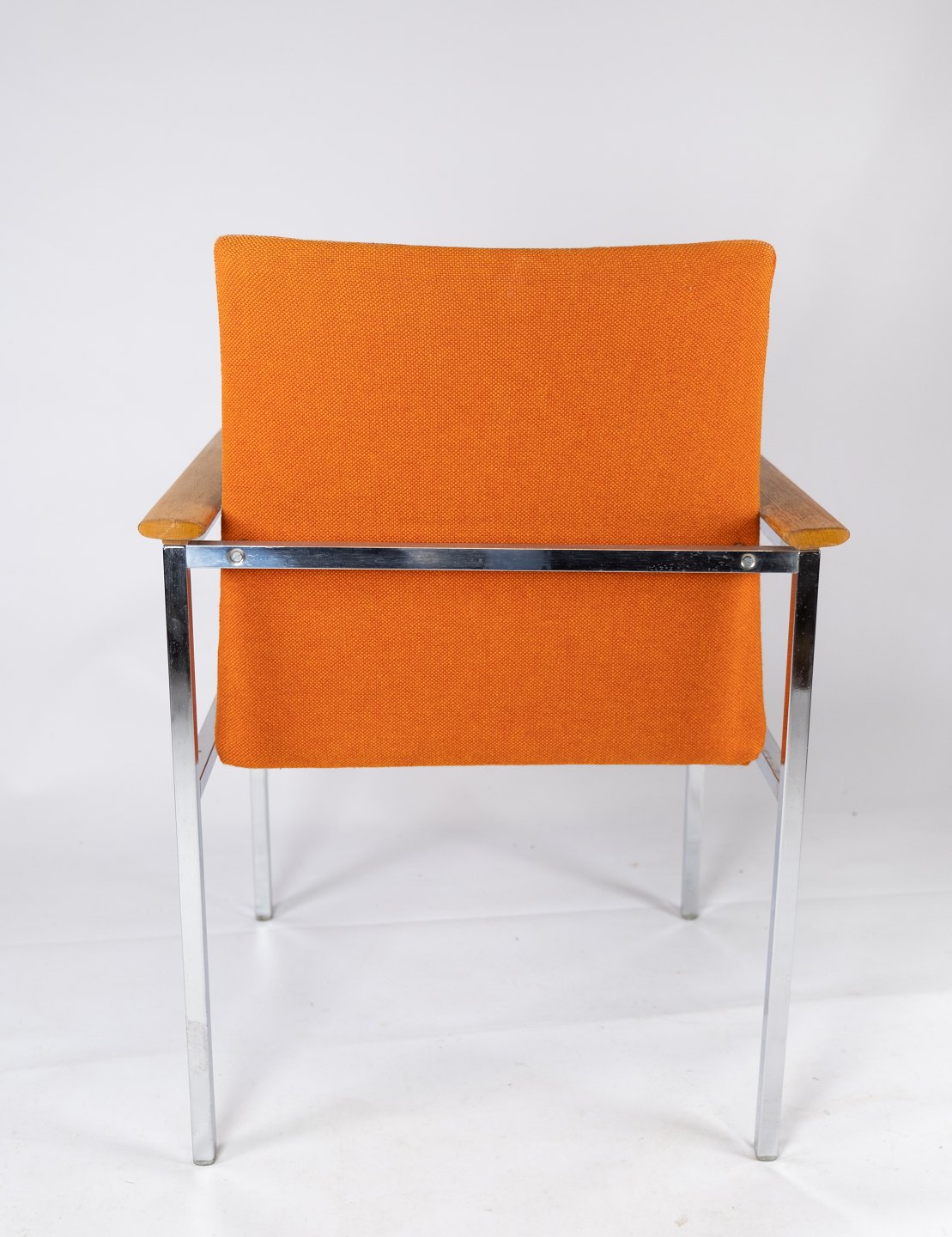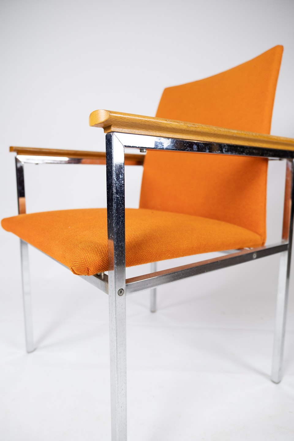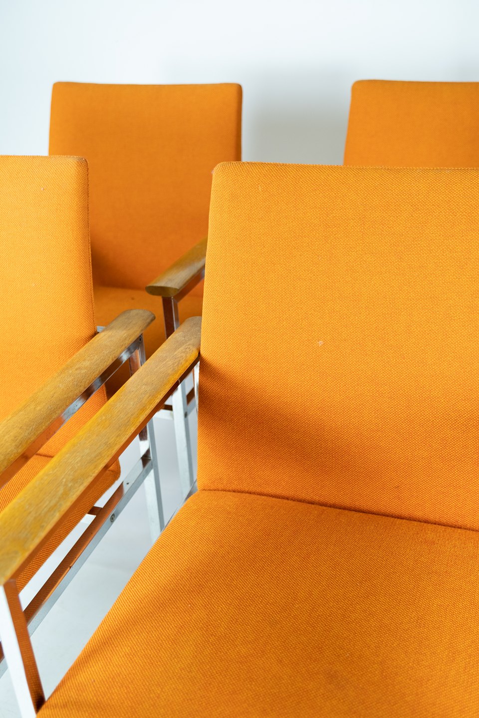 The elegant chrome frame gives the chairs a modern and luxurious feel, while the oak armrests add a warm and natural contrast. The orange wool fabric is both soft and durable and provides a comfortable sitting experience.