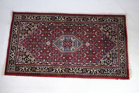 Ægte tæppe i mørke røde farver, i flot brugt stand.