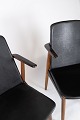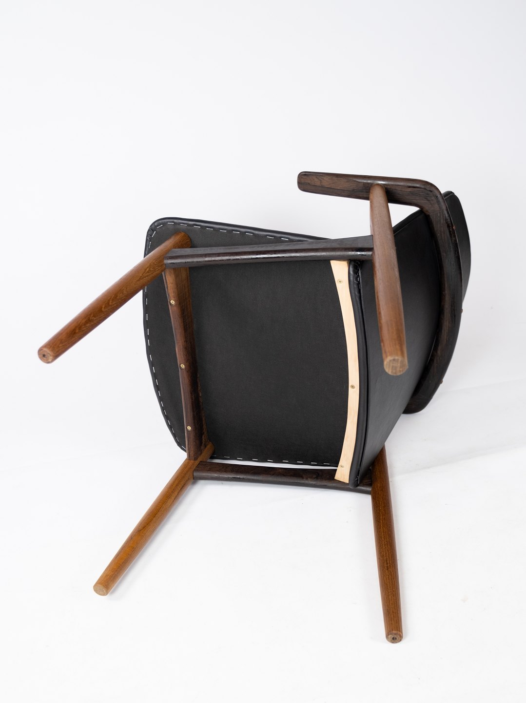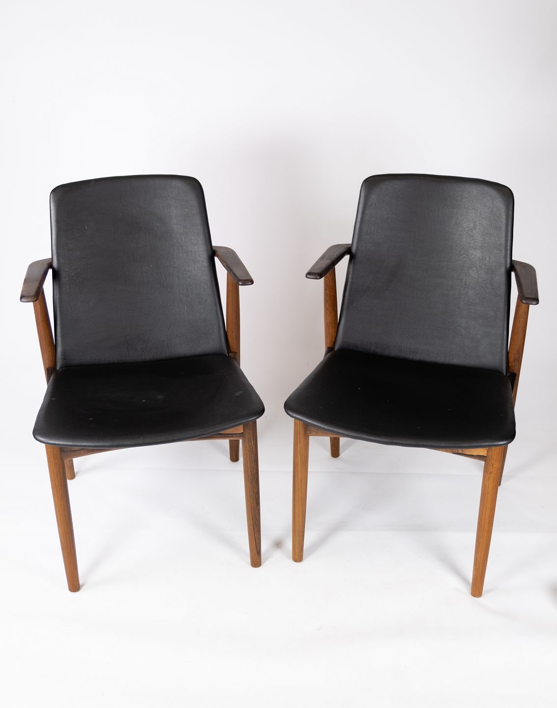 Dette par armstole i klassisk sort læder og teak, designet af Hans Olsen fra 1960'erne, udstråler en tidløs elegance og enestående håndværk. Stolene er ikke kun funktionelle, men også et smukt eksempel på dansk designarv, der vil tilføre enhver indretning en sofistikeret og stilfuld atmosfære.
