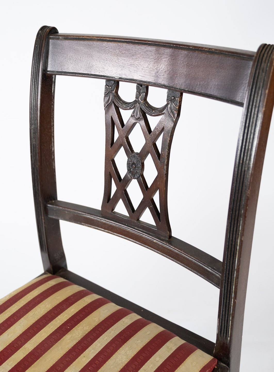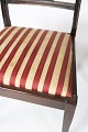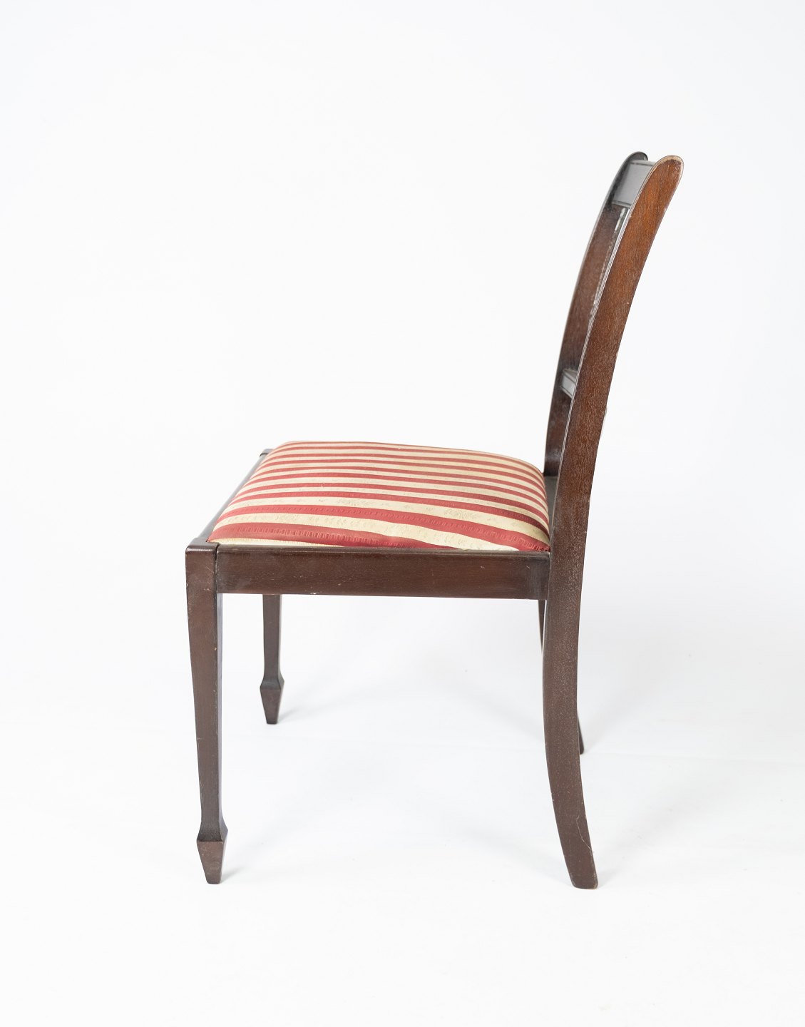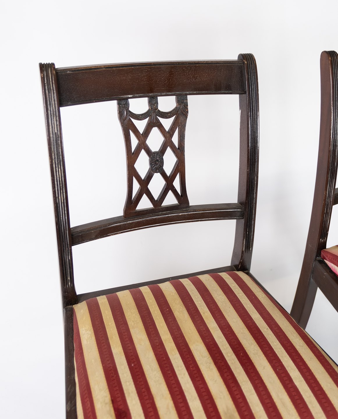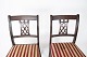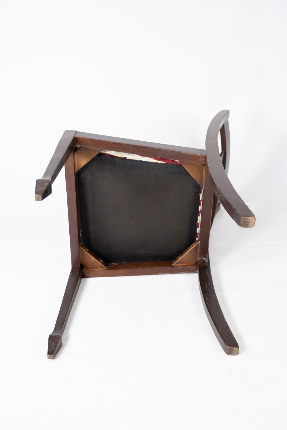 A pair of dining room chairs of mahogany and upholstered red fabric from the 1960s. The chairs are in great vintage condition.