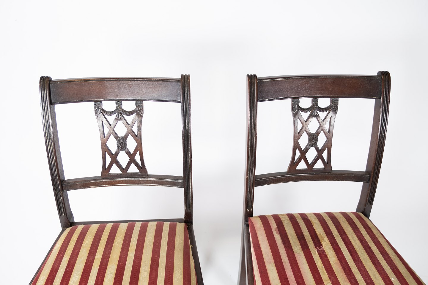 A pair of dining room chairs of mahogany and upholstered red fabric from the 1960s.