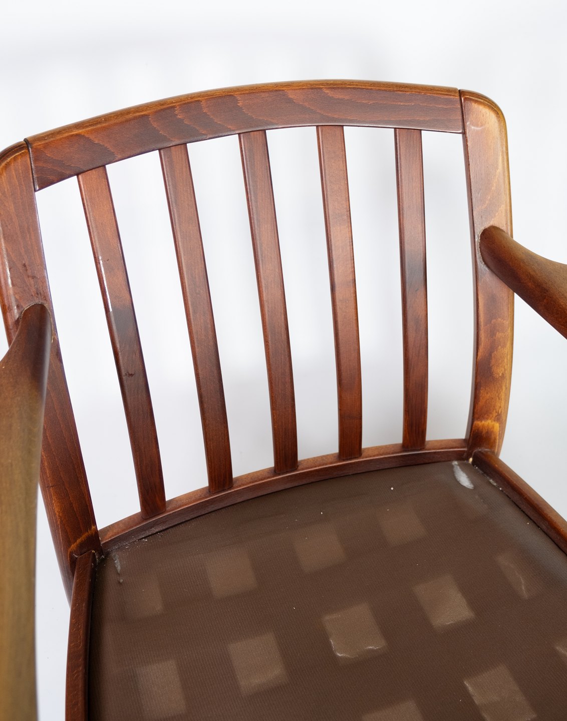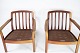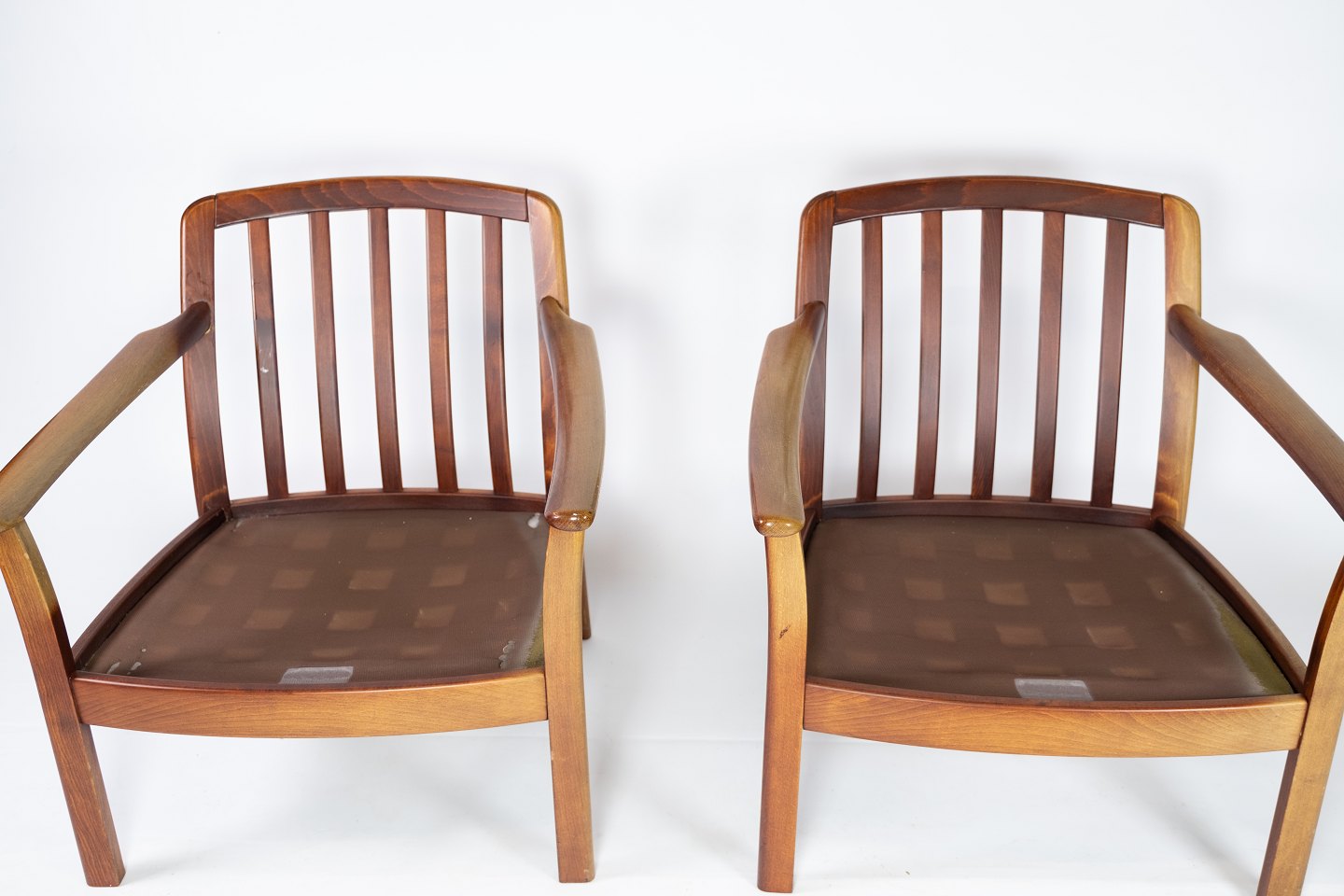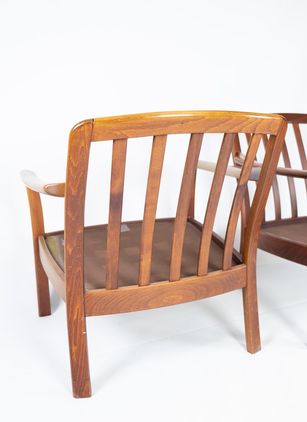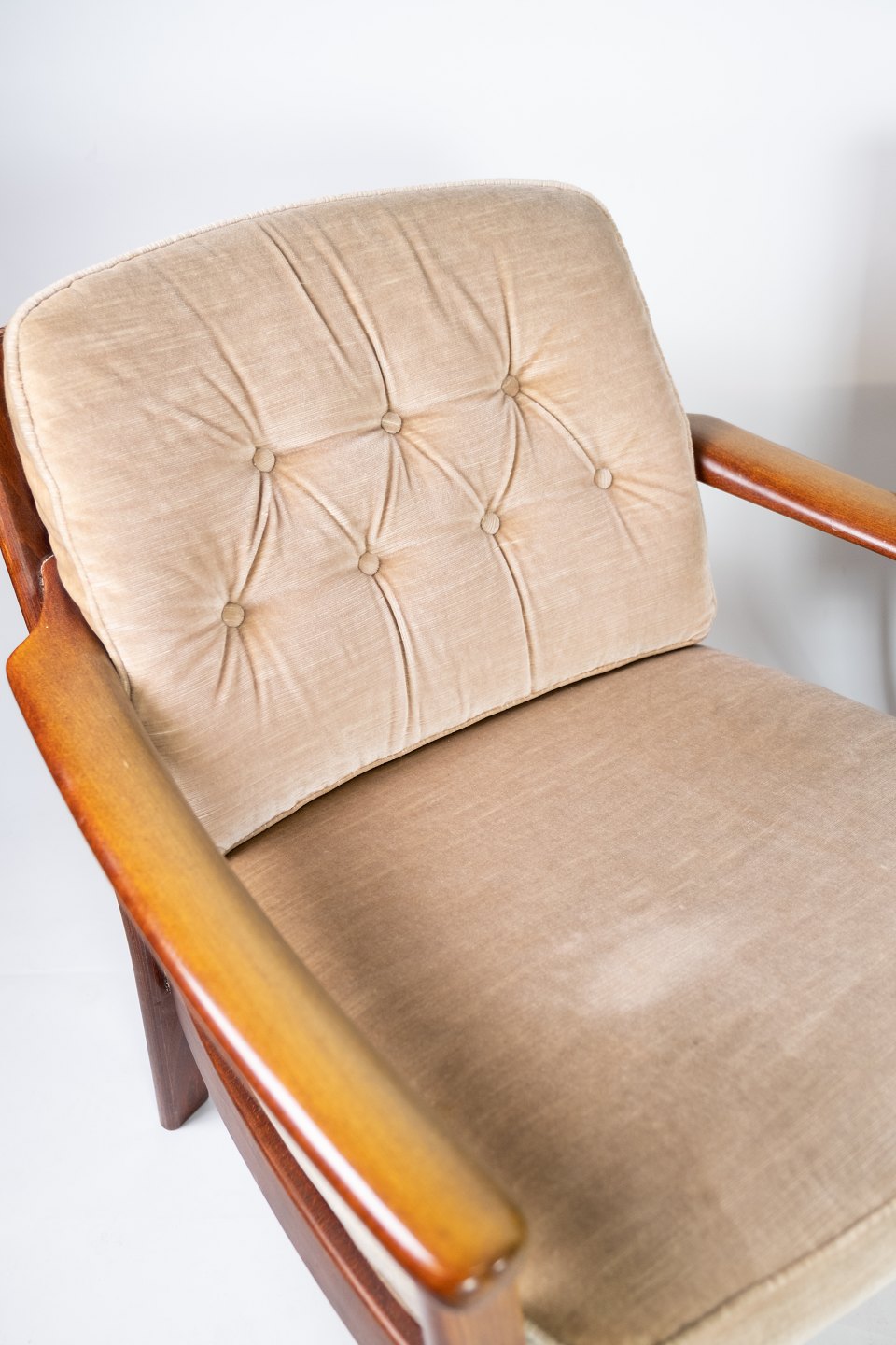 Dette sæt hvilestole i poleret træ og hynder i velour, fra 1960'erne, er et smukt udtryk for dansk håndværk og æstetik. Med deres elegante design og luksuriøse polstring er disse stole både behagelige og stilfulde.