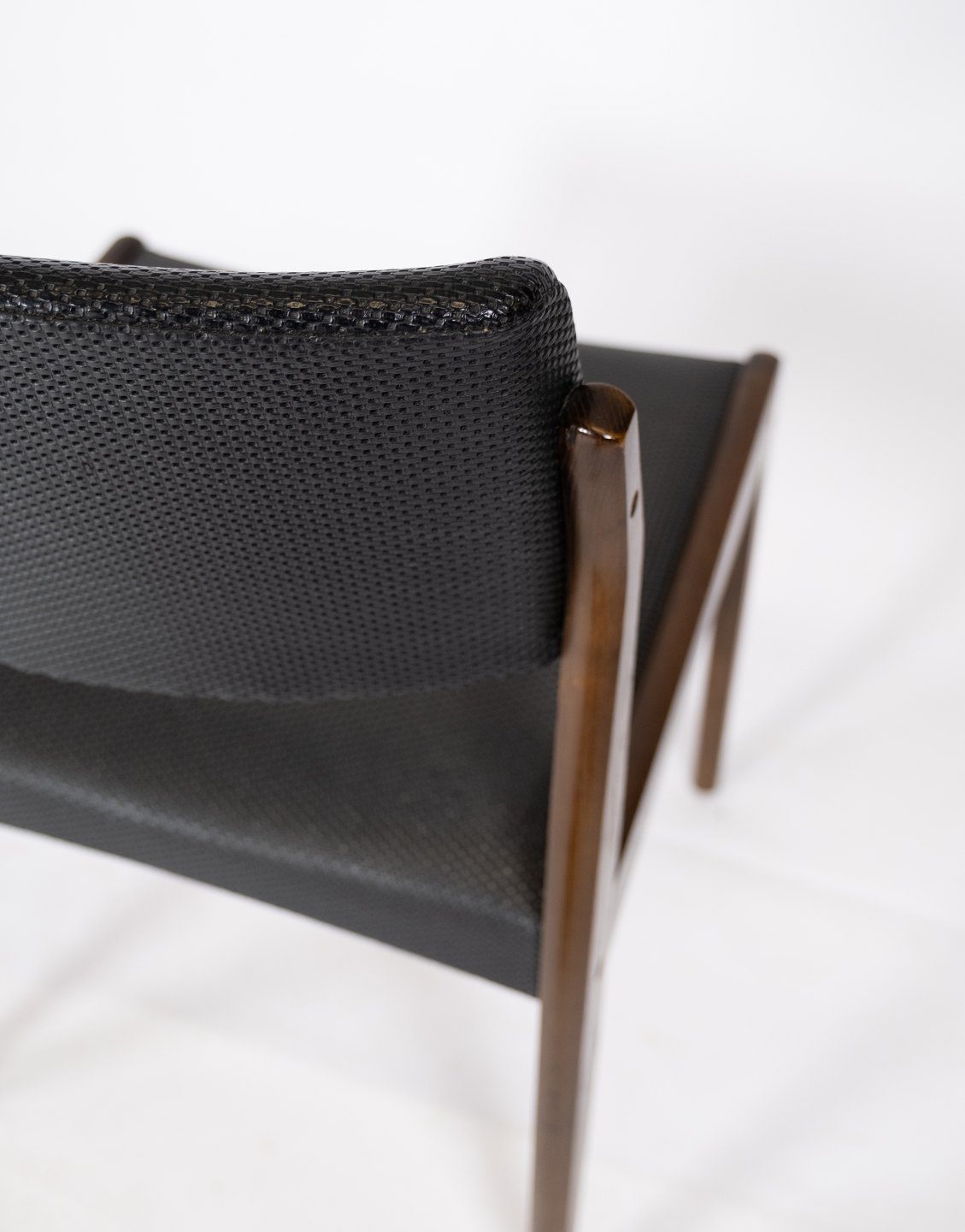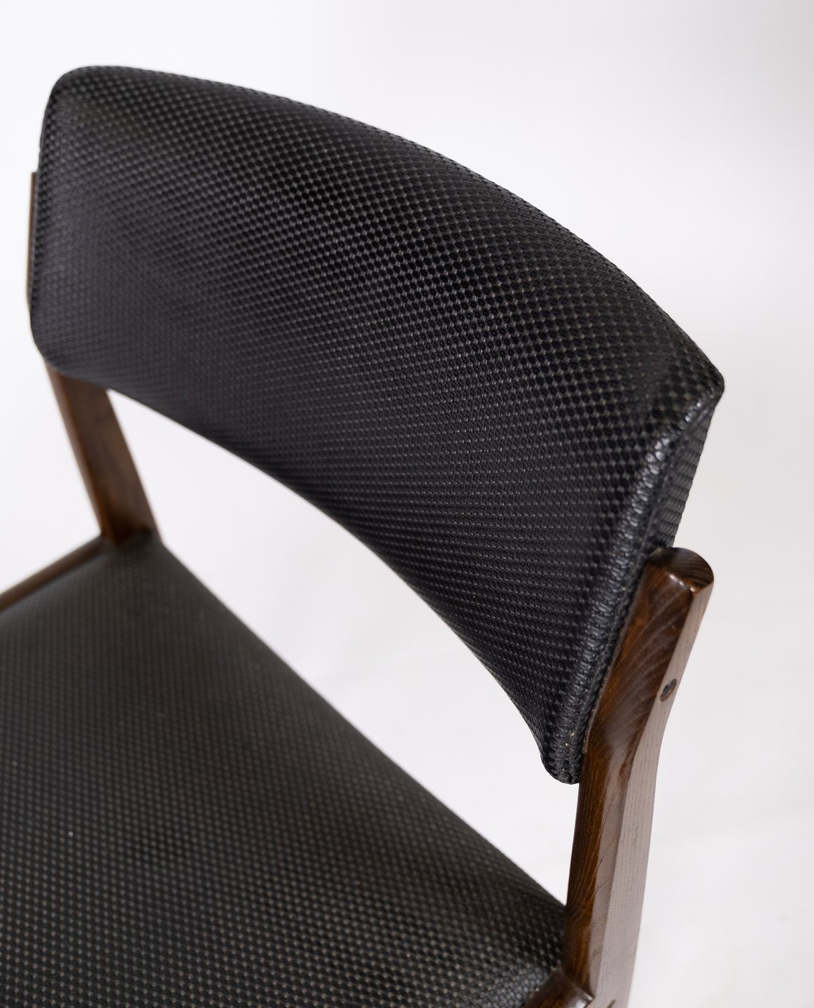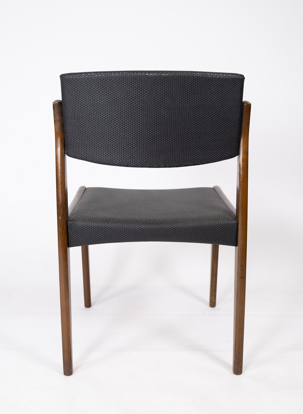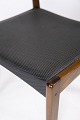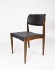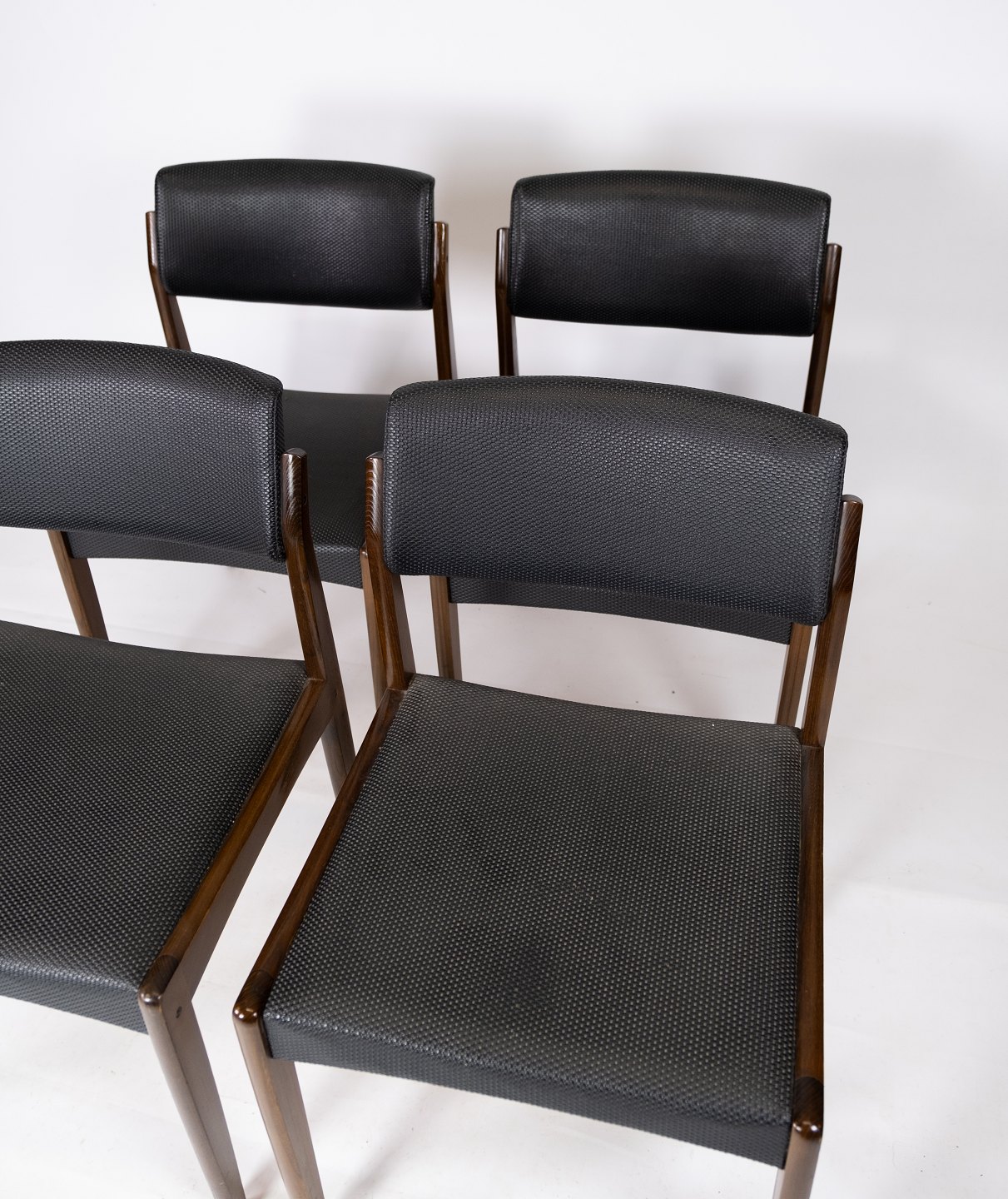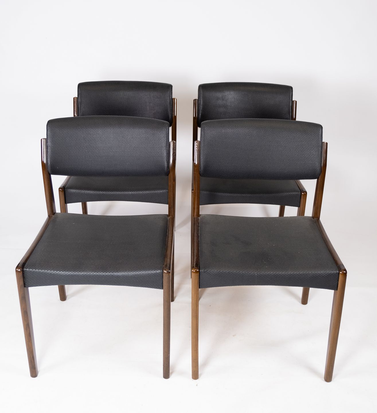 Dette sæt af fire spisestuestole, med sort betræk og mørkt træ, er et tidløst eksempel på dansk design fra 1960'erne. Stolene udstråler en elegant enkelhed og er perfekte til ethvert spiseområde.