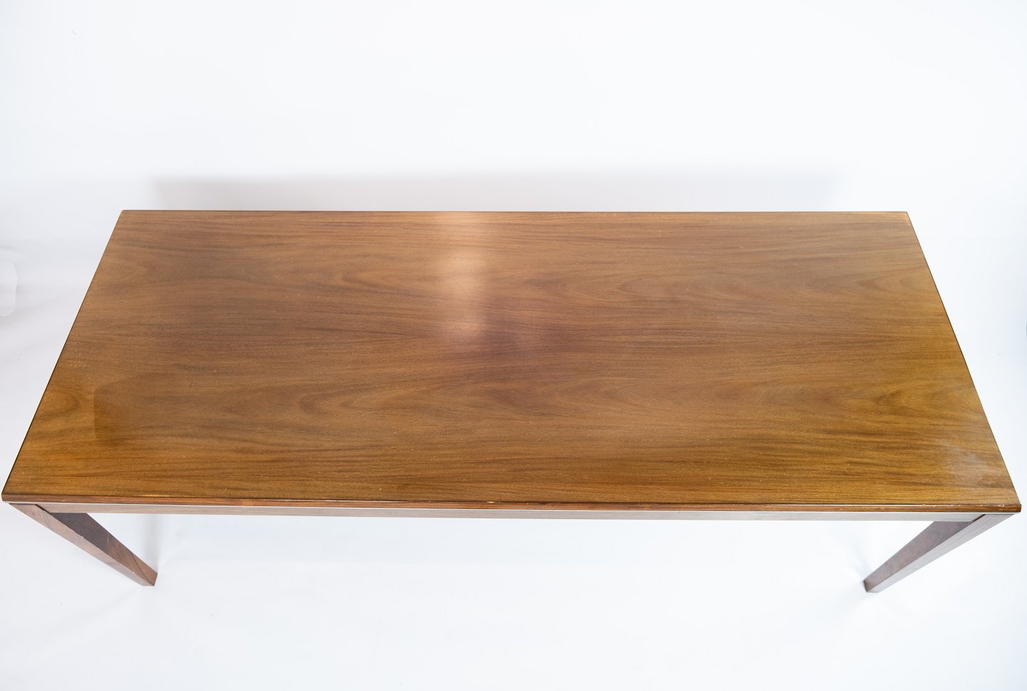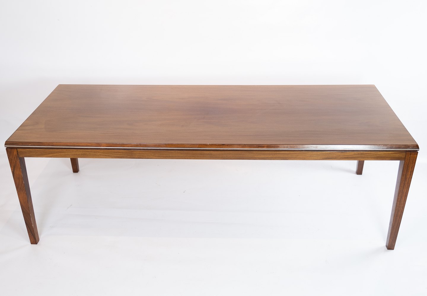 Sofabord i palisander dekoreret med metalkant af dansk design fra 1960erne. Bordet er i flot brugt stand.