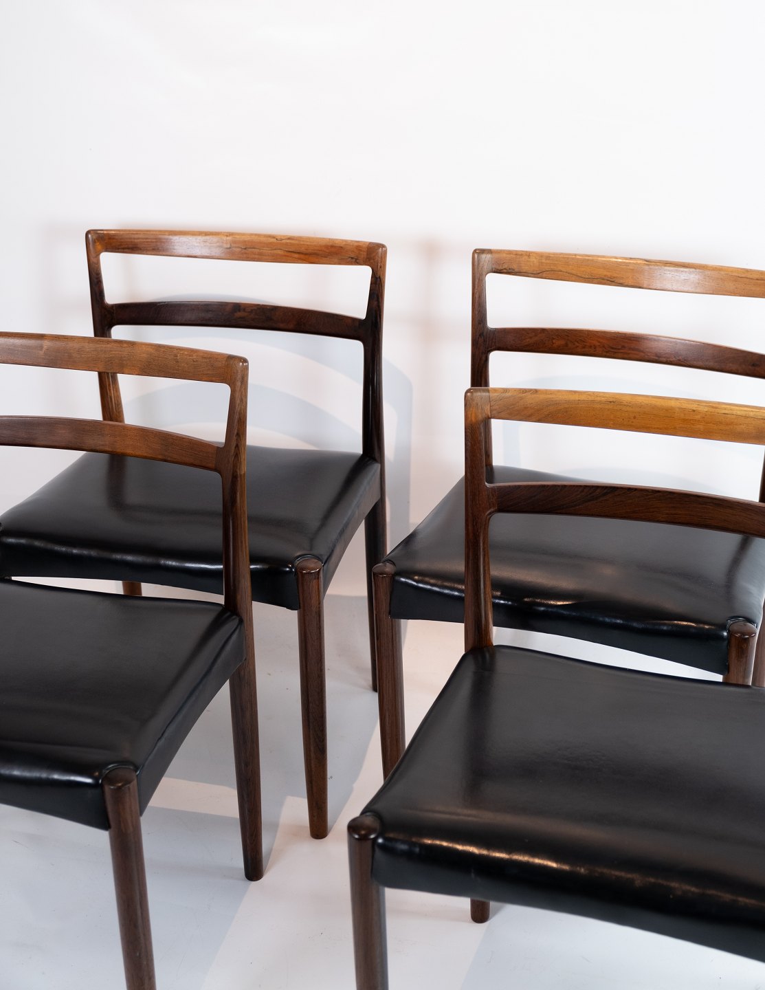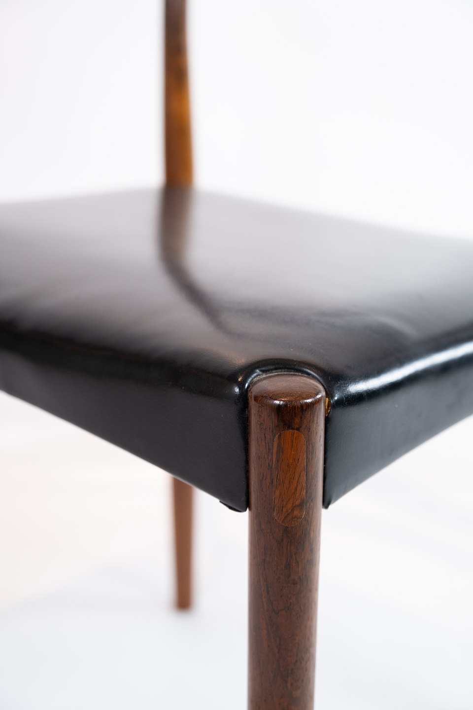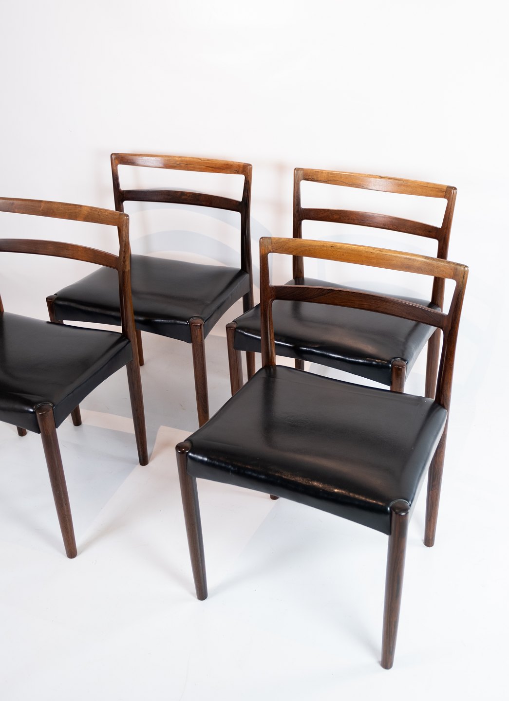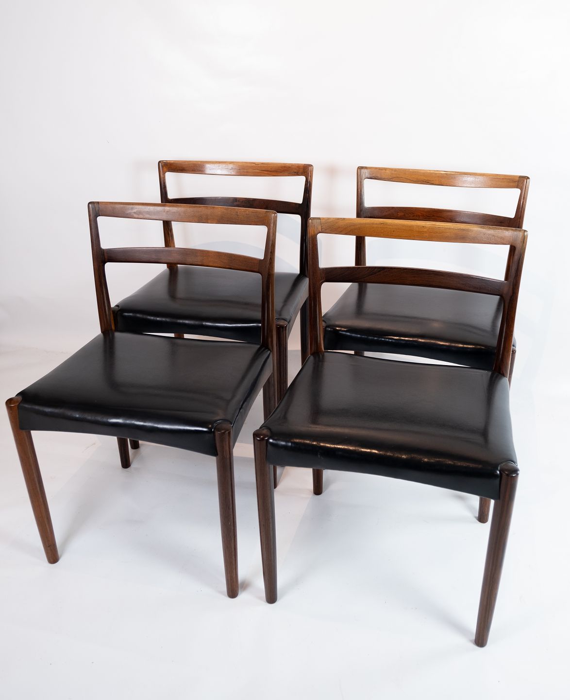 Dette sæt af fire spisestuestole i palisander og sort læder, af fra 1960'erne, er et smukt udtryk for æstetikken fra denne periode. Stolene kombinerer elegance og funktionalitet og vil tilføre enhver spisestue en tidløs charme.