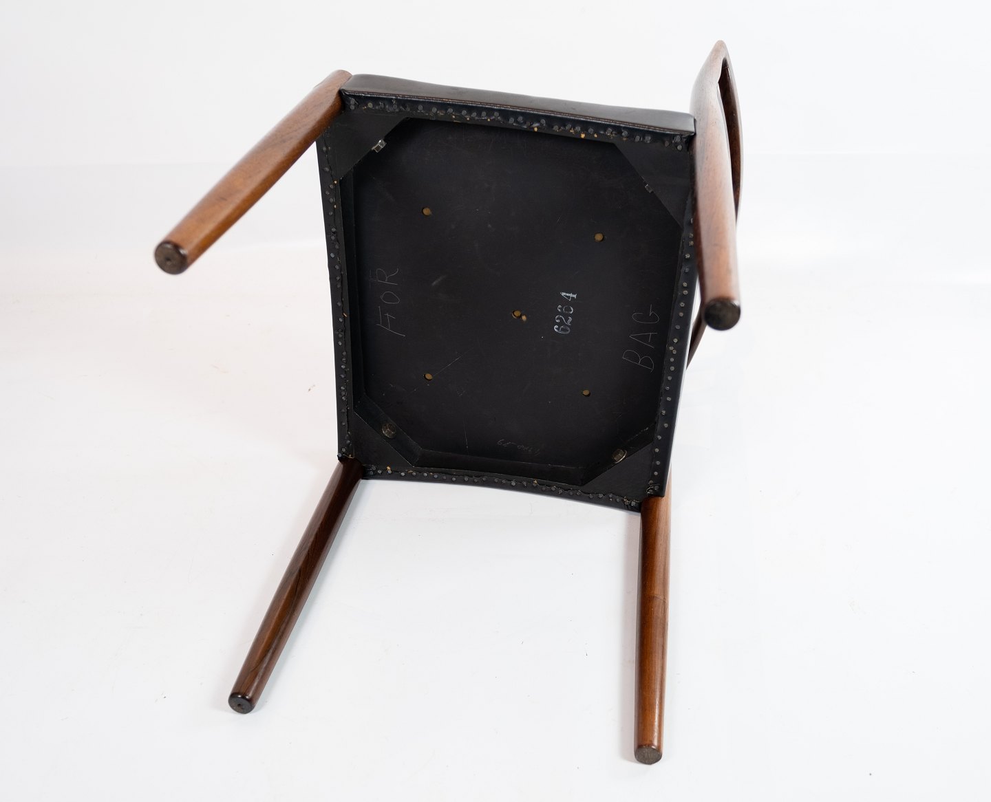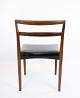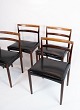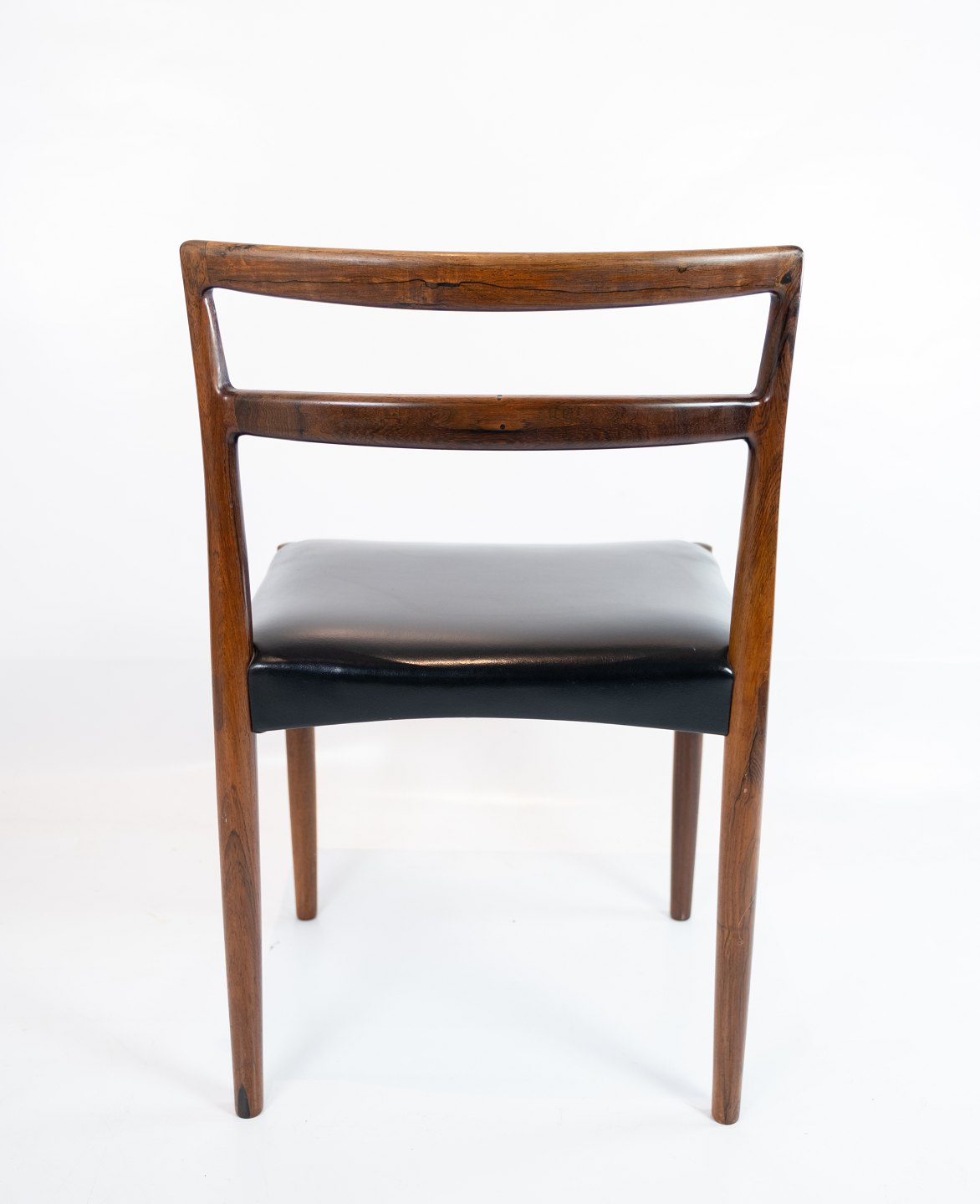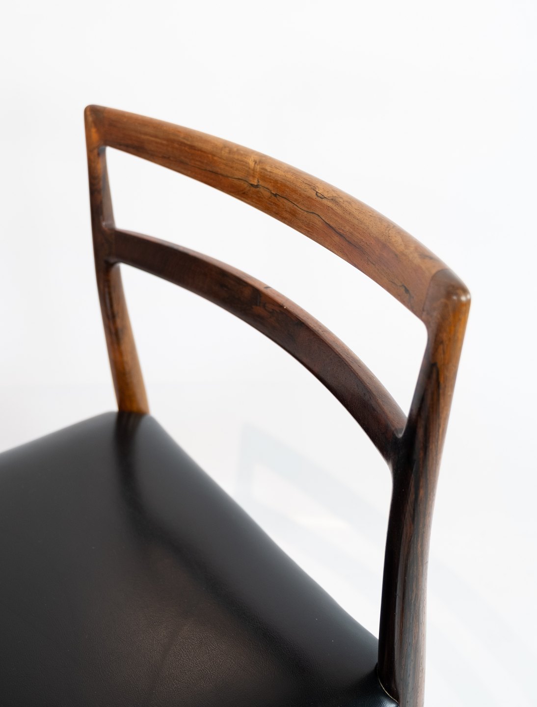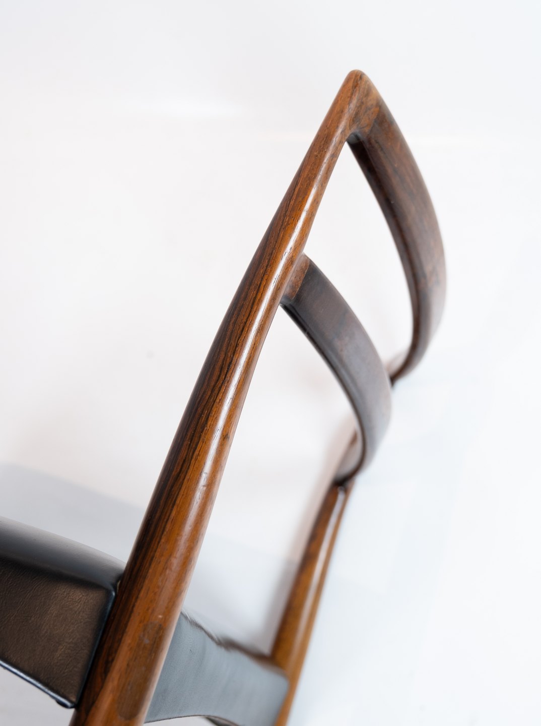 Dette sæt af fire spisestuestole i palisander og sort læder, af fra 1960'erne, er et smukt udtryk for æstetikken fra denne periode. Stolene kombinerer elegance og funktionalitet og vil tilføre enhver spisestue en tidløs charme.