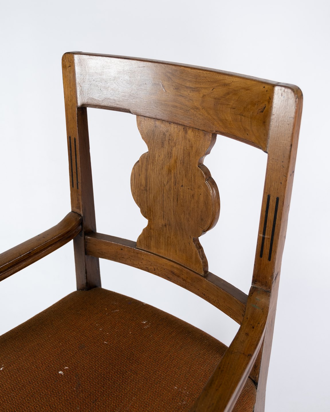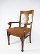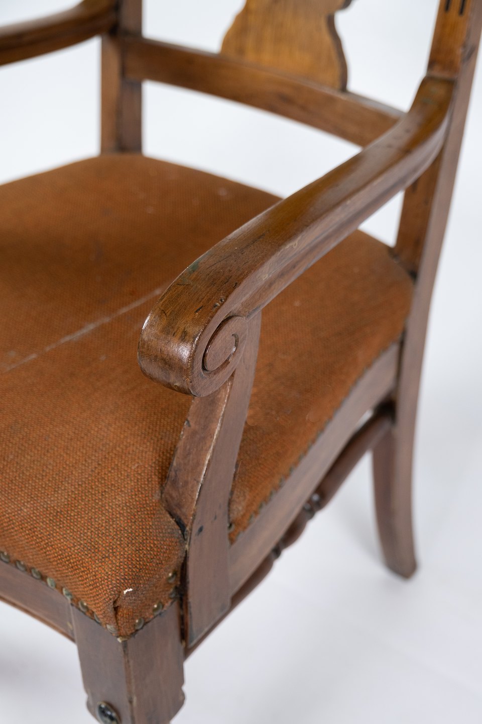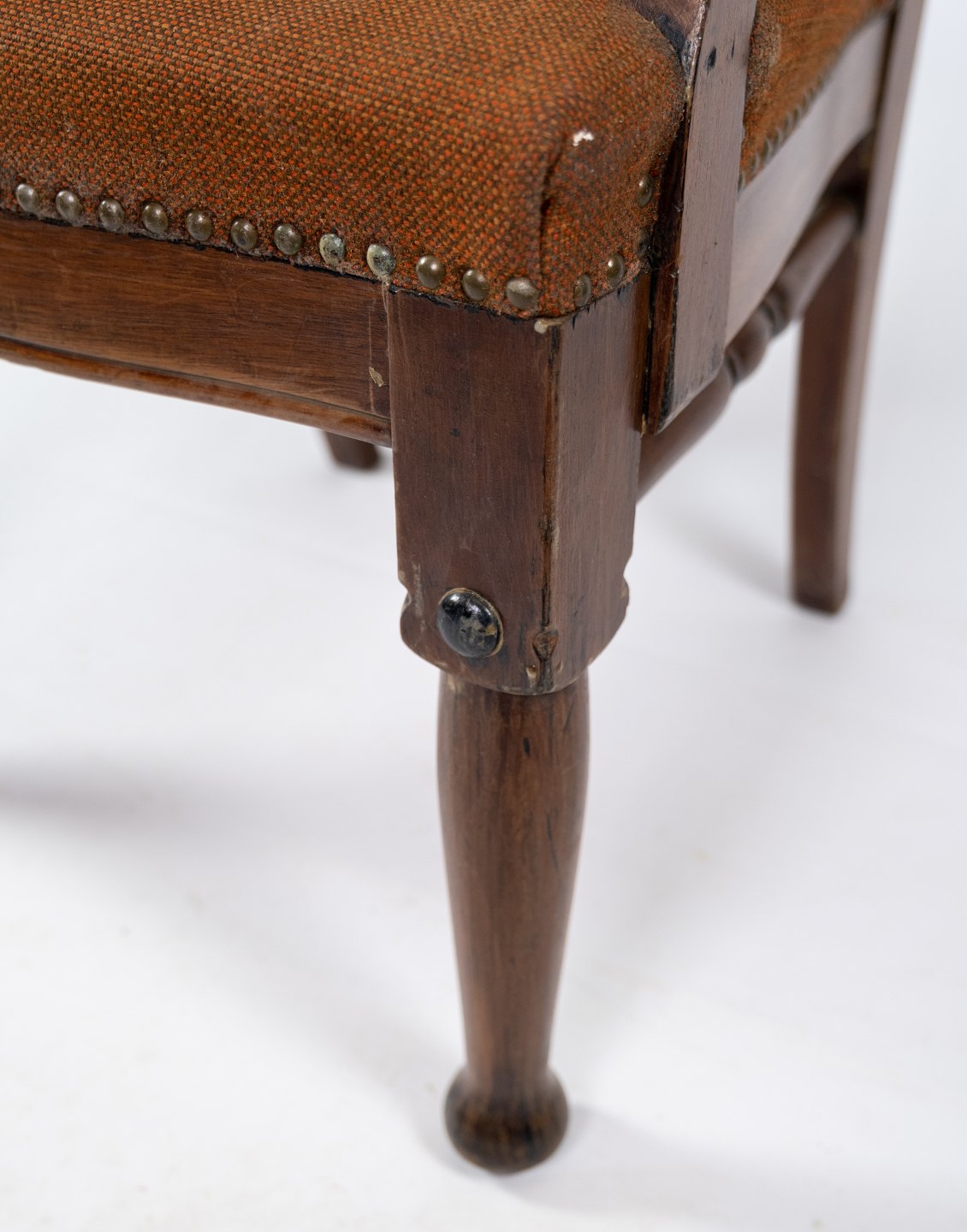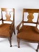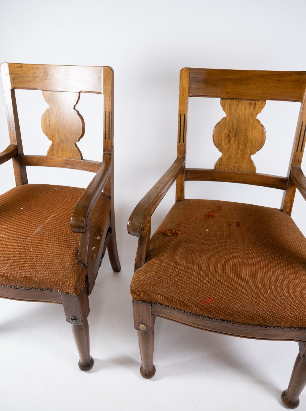 Et sæt antikke armstole af mørkt træ og uldstof, i flot stand fra 1930erne.