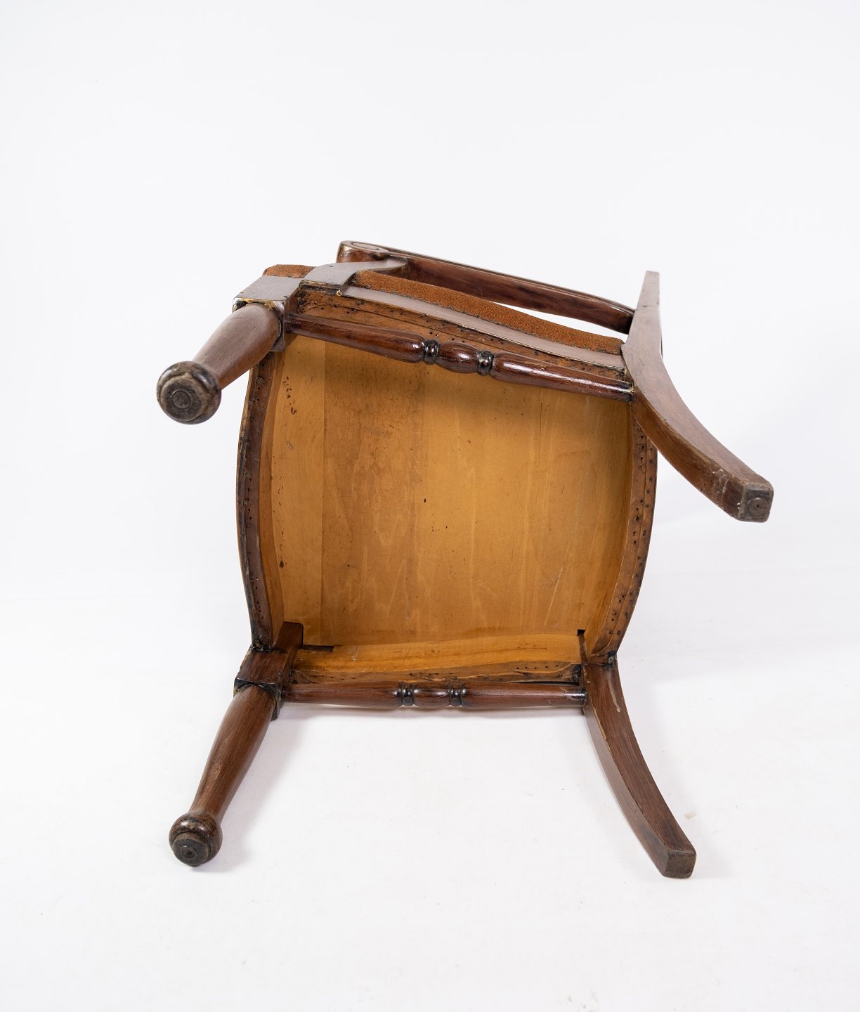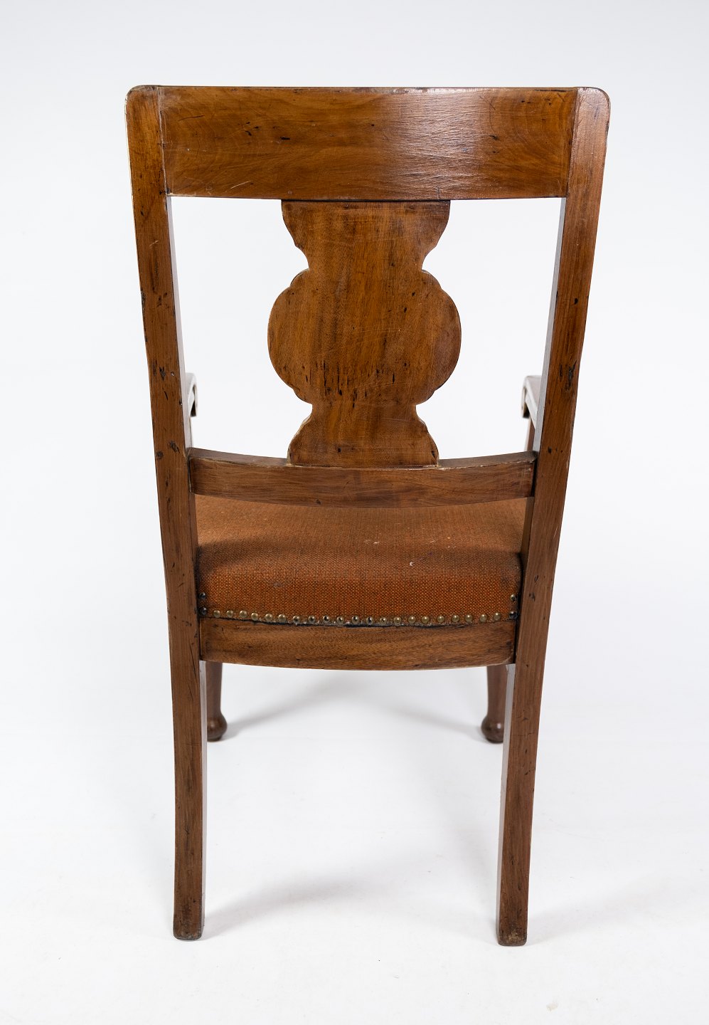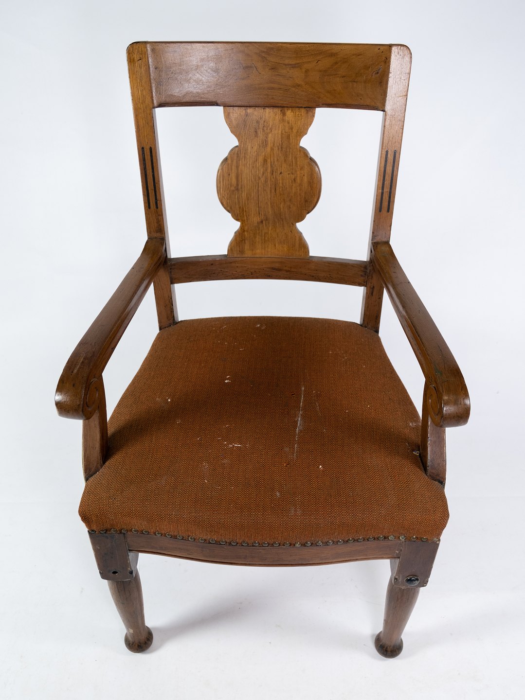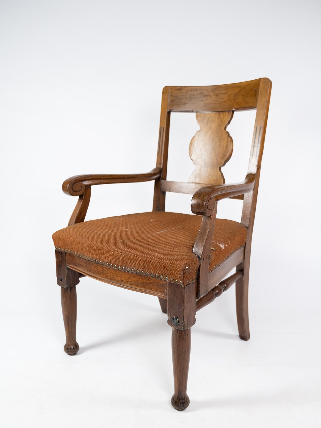 Et sæt antikke armstole af mørkt træ og uldstof, i flot stand fra 1930erne.